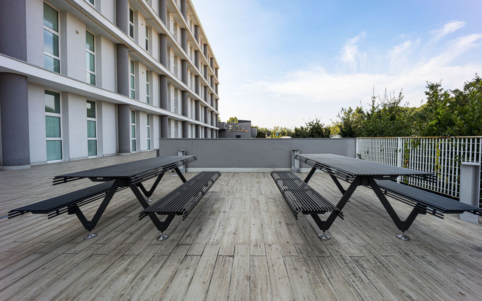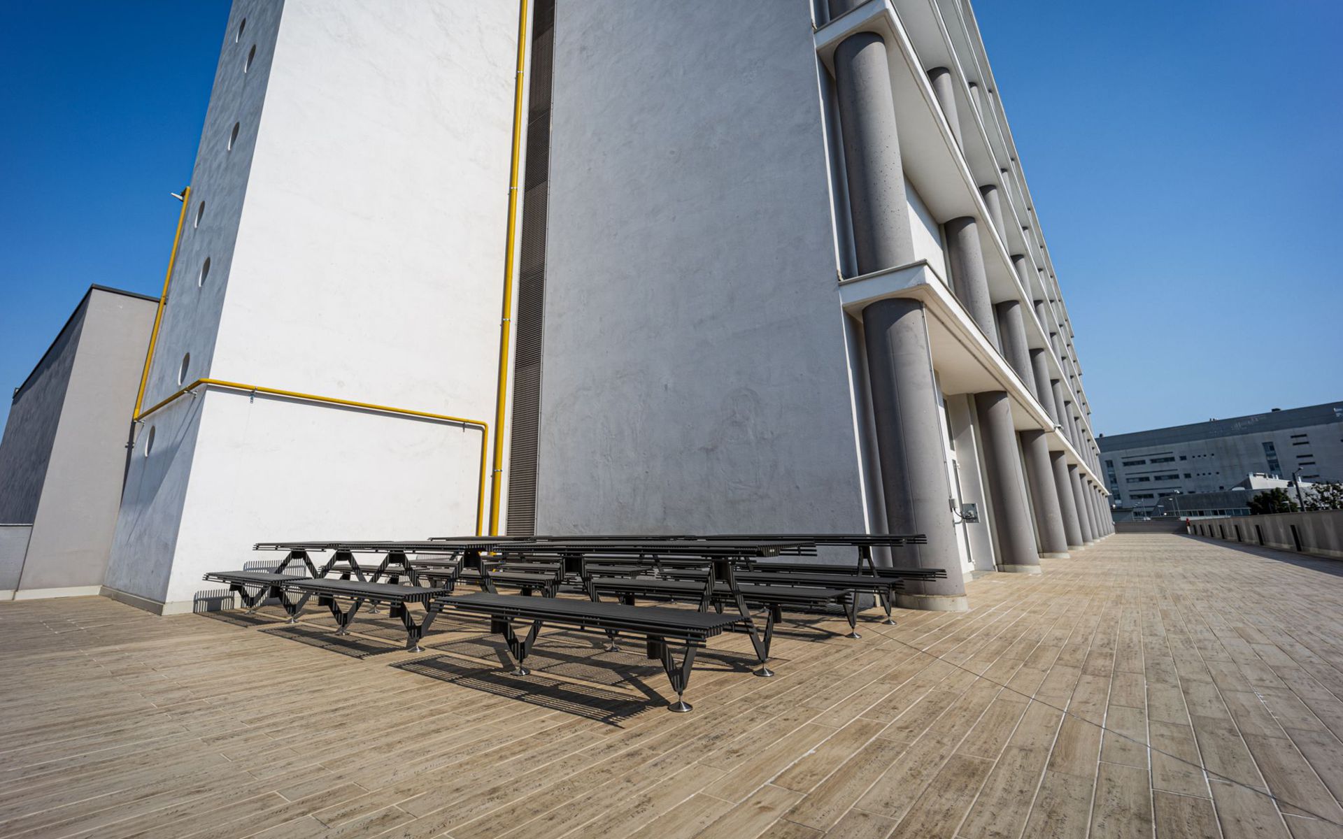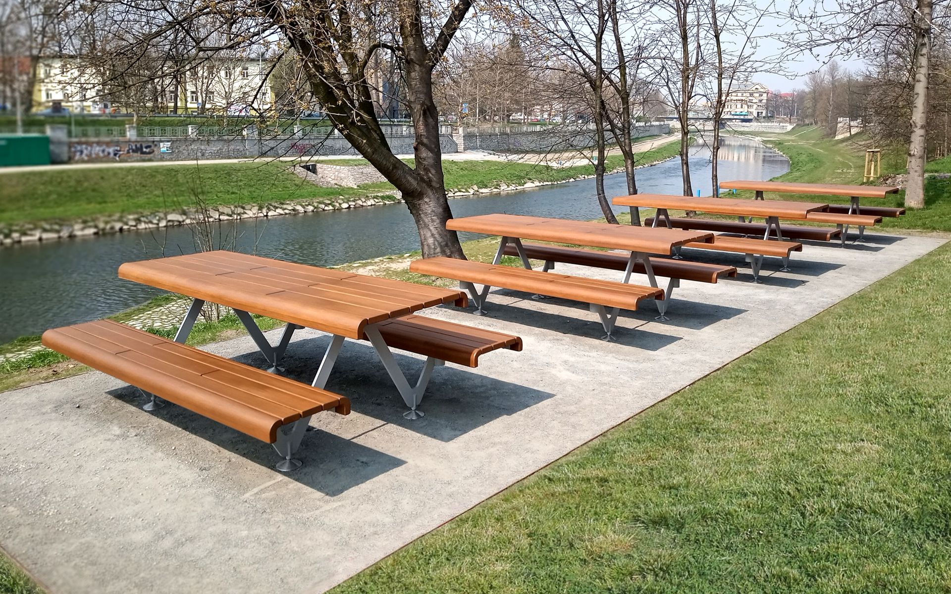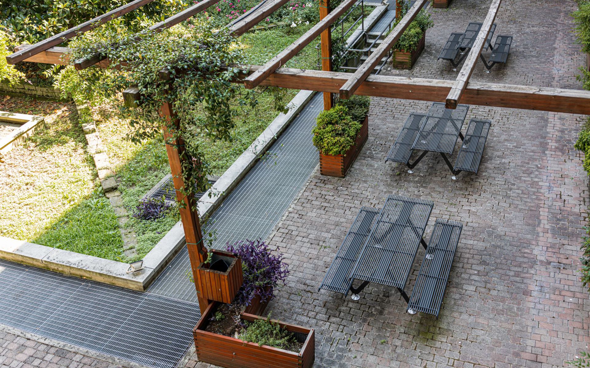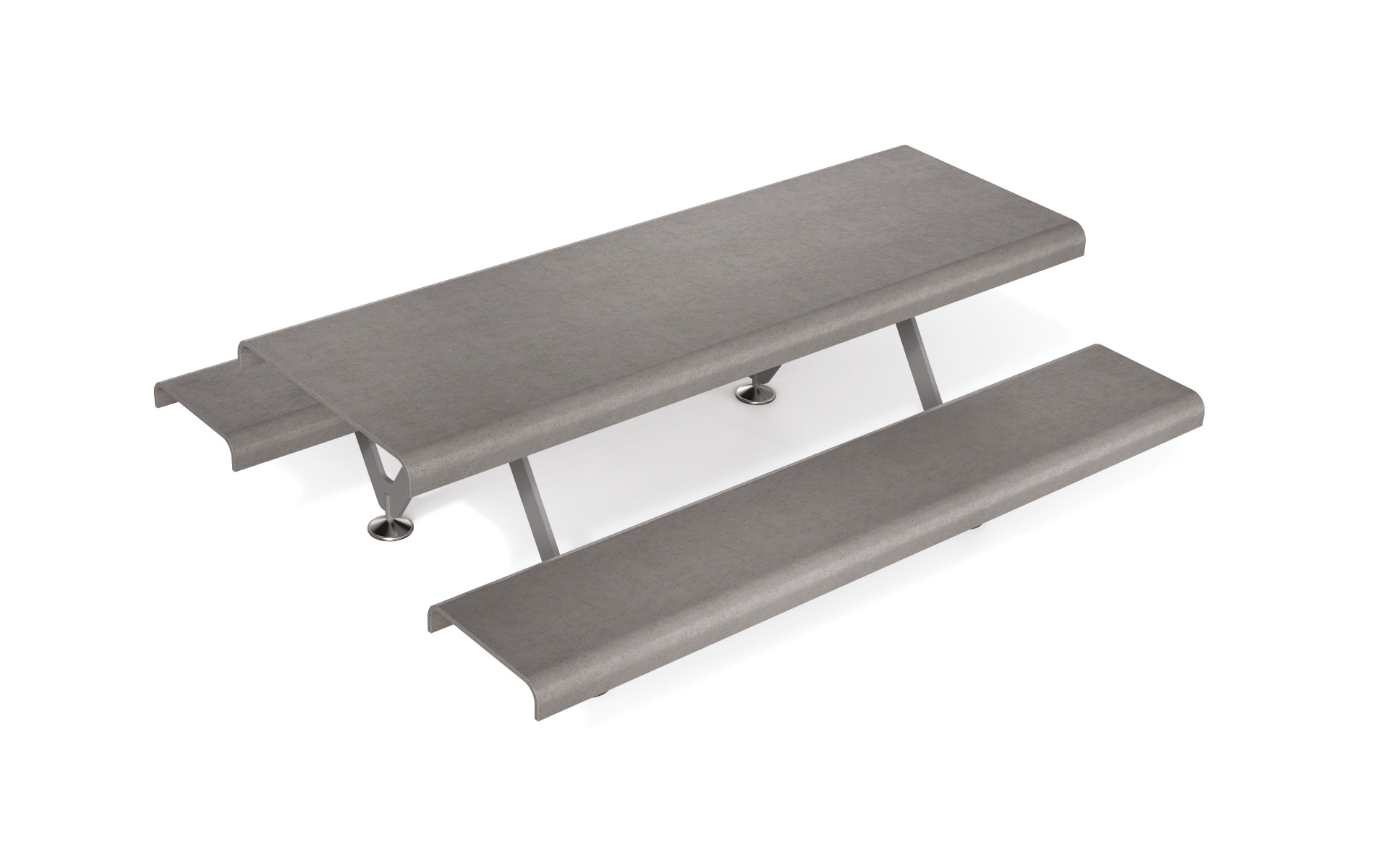 This collection of modular tables with integrated seating offers the perfect blend of strength, design, and versatility. Made from UHPC (Ultra High Performance Concrete) or a combination of steel and wood, each table is supported by a thick painted steel sheet structure, designed to endure over time and withstand high-use public spaces. Available in both linear and curved versions, these tables naturally adapt to various layouts and urban environments, creating welcoming spaces for gathering, resting, and social interaction.