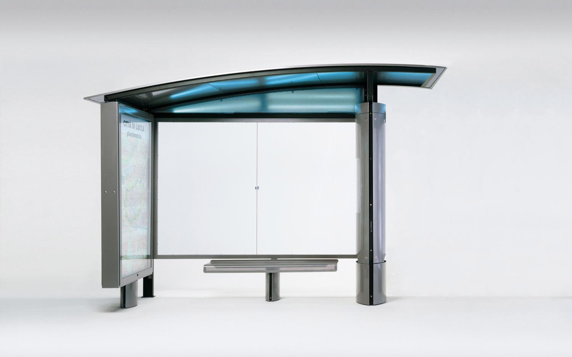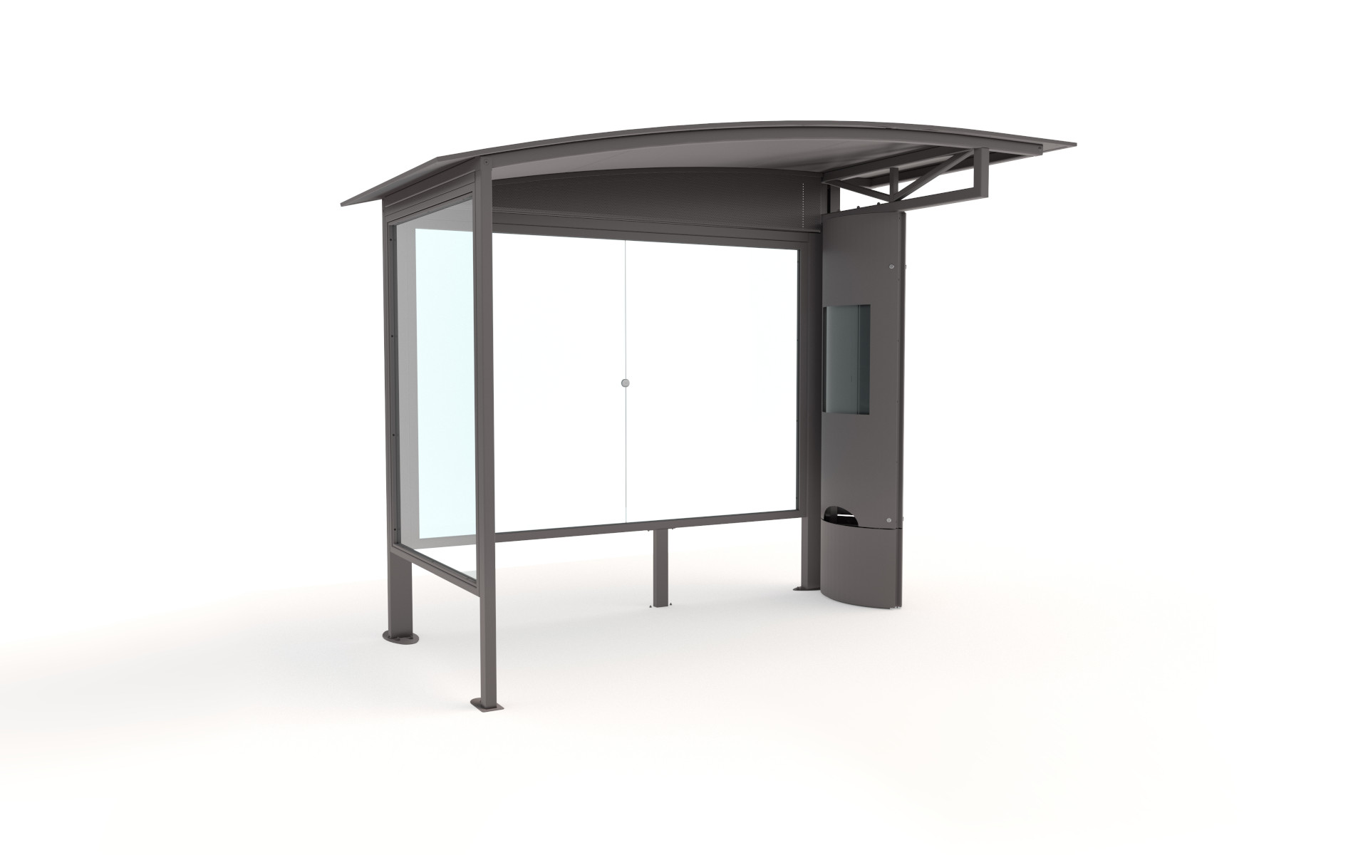 Shelter composed of a supporting structure in steel tube, a back wall composed of a frame in steel profiles with two tempered glass sheets and a cover in shaped steel sheet, with edge in powder coated extruded aluminum. One side of the supporting structure is covered with curved metal sheets that create an elliptical profile: in the lower part it is equipped with a litter bin with bag holder ring and a door with lock, while, in the upper part, it can accomodate a panel for advertising posters. On the opposite side, an aluminum information panel with snap lock is integrated. The glass sheets can be equipped with holes for the installation of an additional aluminum display board with snap closure. The shelter can be completed with a steel bench without backrest, whose seat is decorated with holes.