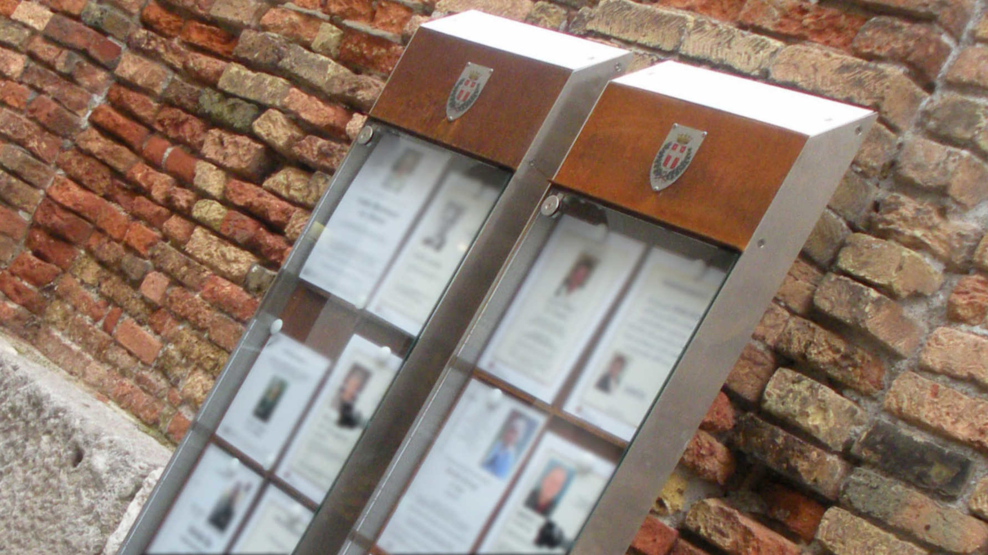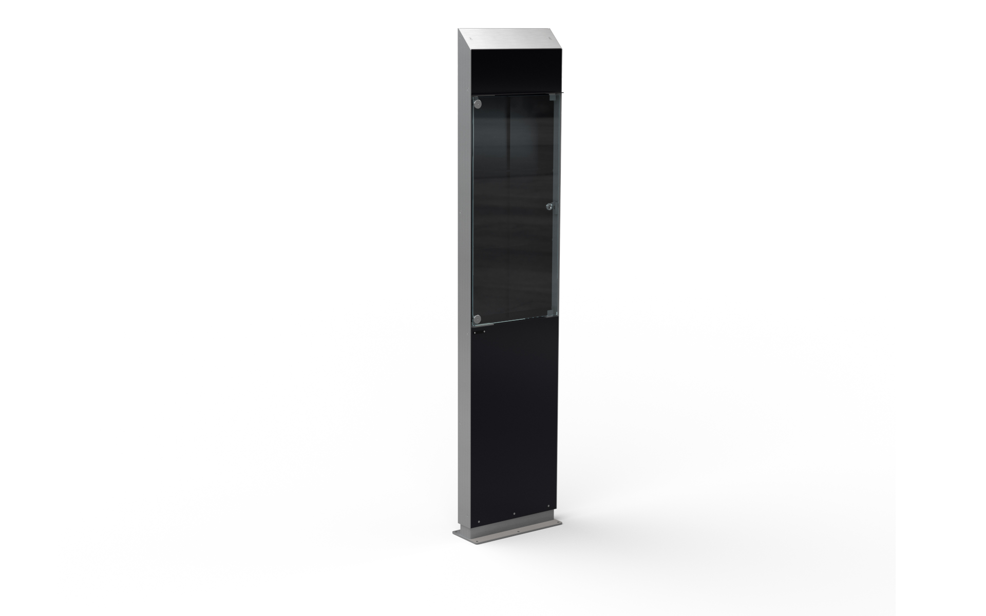 This single-sided display board with a showcase offers an elegant and durable solution for posting information in public and institutional spaces. Made of steel and finished with a sleek stainless steel flat bar edge, it ensures long-lasting performance and refined aesthetics. The display surface, measuring 934×455 mm, is protected by a tempered glass panel supported by hinges and equipped with a key lock, providing secure and reliable protection for the posted content.