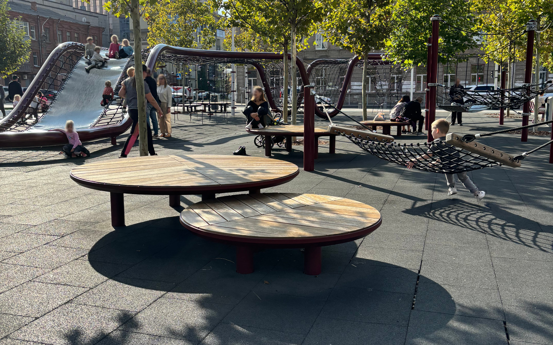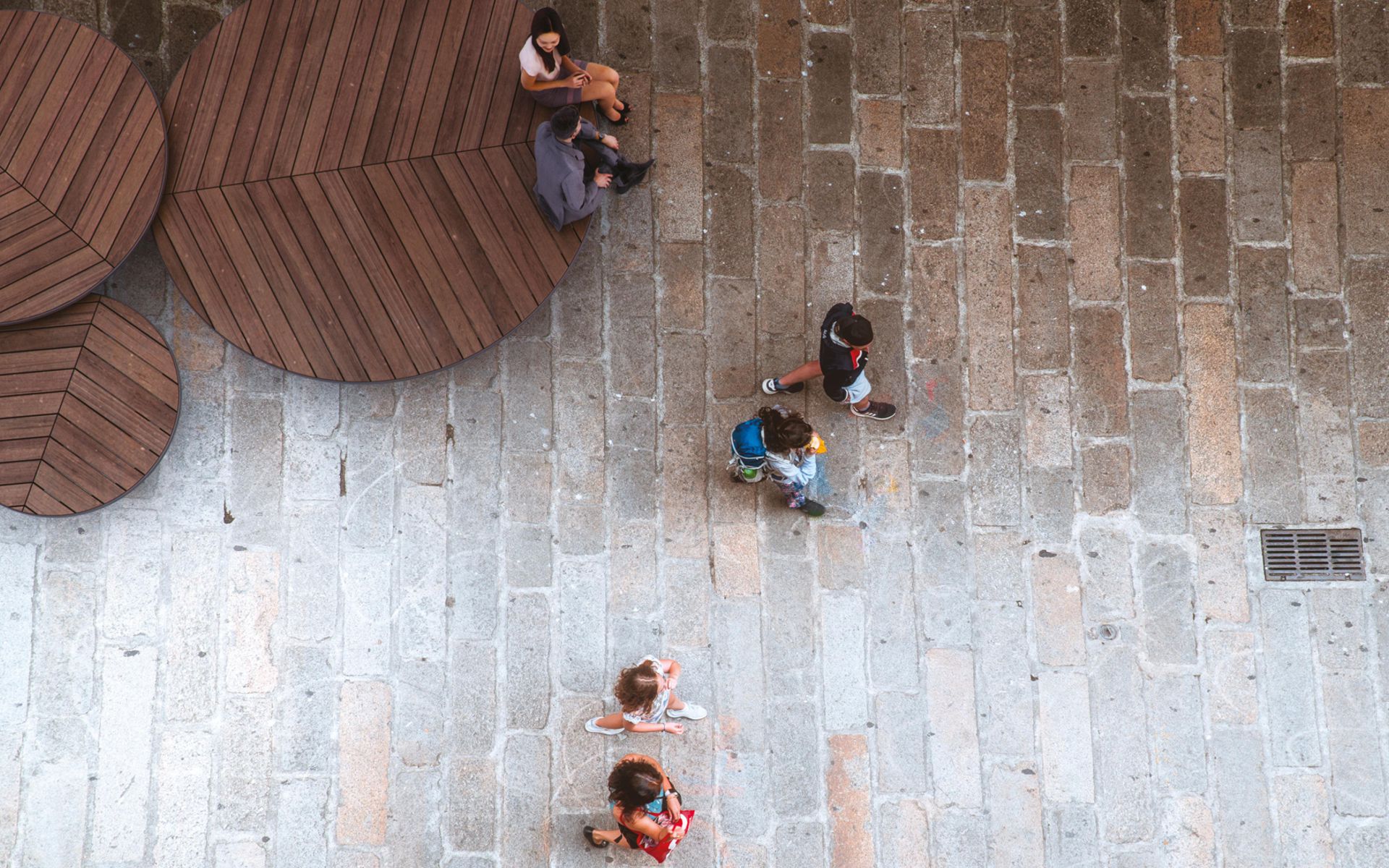 The circular seating collection combines design and functionality, offering an elegant and comfortable element for public spaces. Each seat is made with a sturdy frame and supports in painted steel, with options for mounting either via a base plate or embedding. The perimeter frame in painted aluminum adds a refined touch, while the seating surface, made of hardwood slats arranged in a herringbone pattern, ensures comfort and long-lasting durability. This blend of materials and design makes the seat perfect for parks, squares, and other urban areas.
