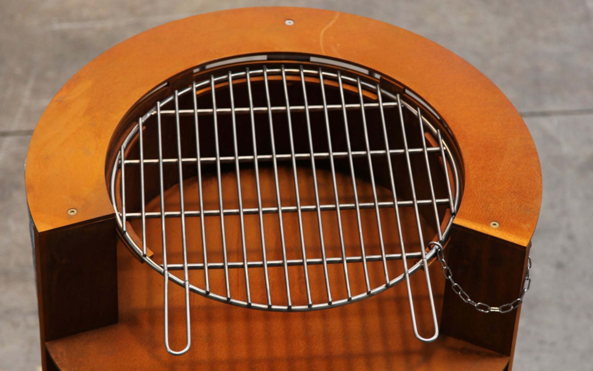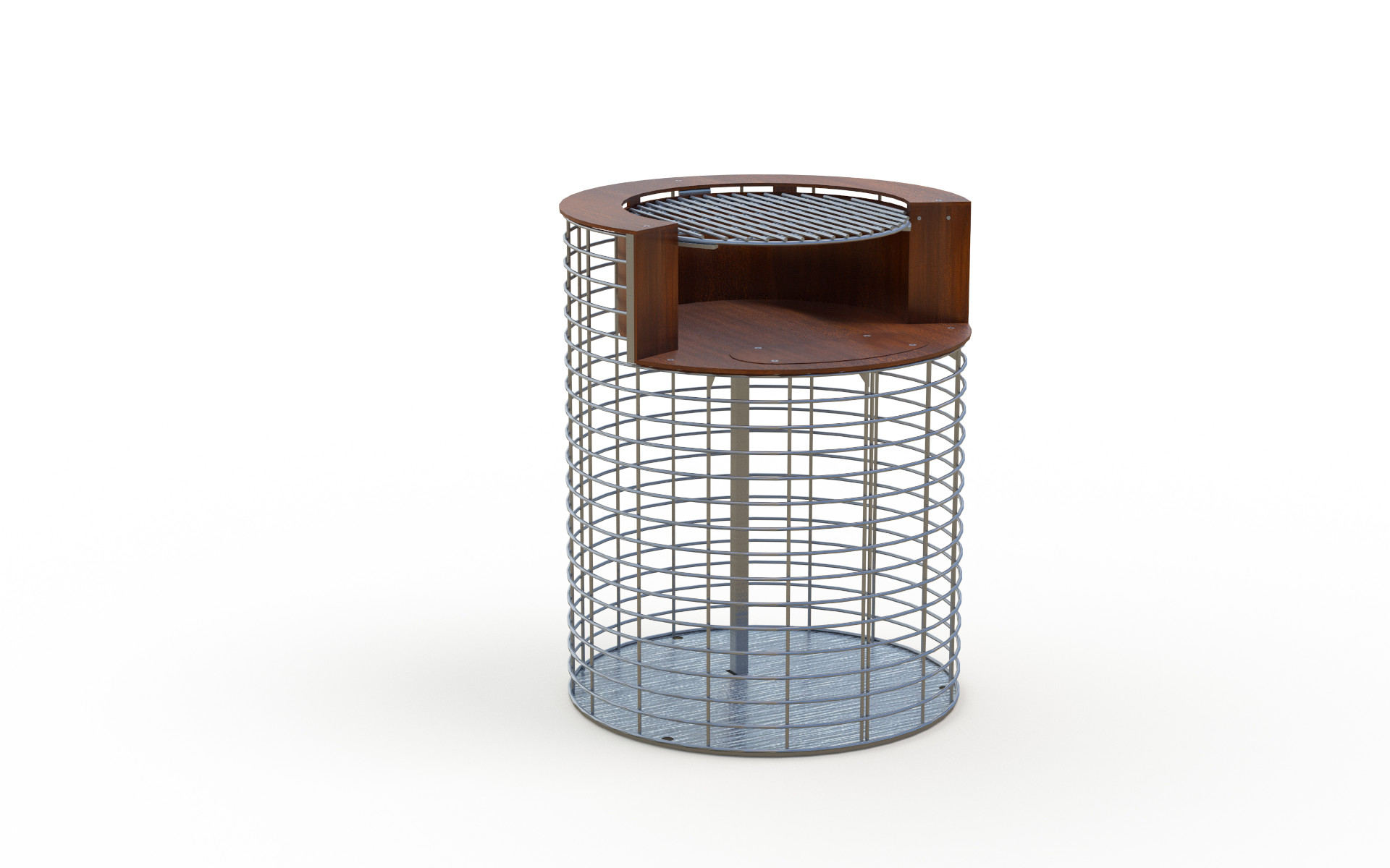 The steel barbecue collection is designed to offer a social and durable outdoor cooking experience, combining strength, practicality, and refined design. Each unit features a welded mesh frame with a sheet metal base to be filled with inert material chosen by the client, and includes an integrated Corten steel firebox for long-lasting performance. The stainless steel grill comes with an anti-theft chain, making it suitable for public use. Available in two models: one with a simple firebox and one with a lower compartment for wood storage, ensuring functionality and neatness.