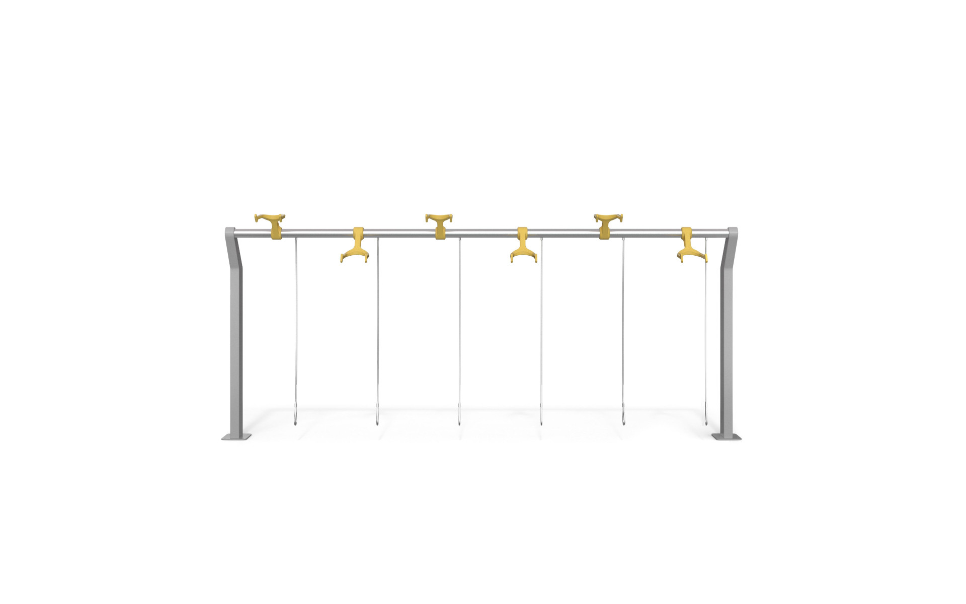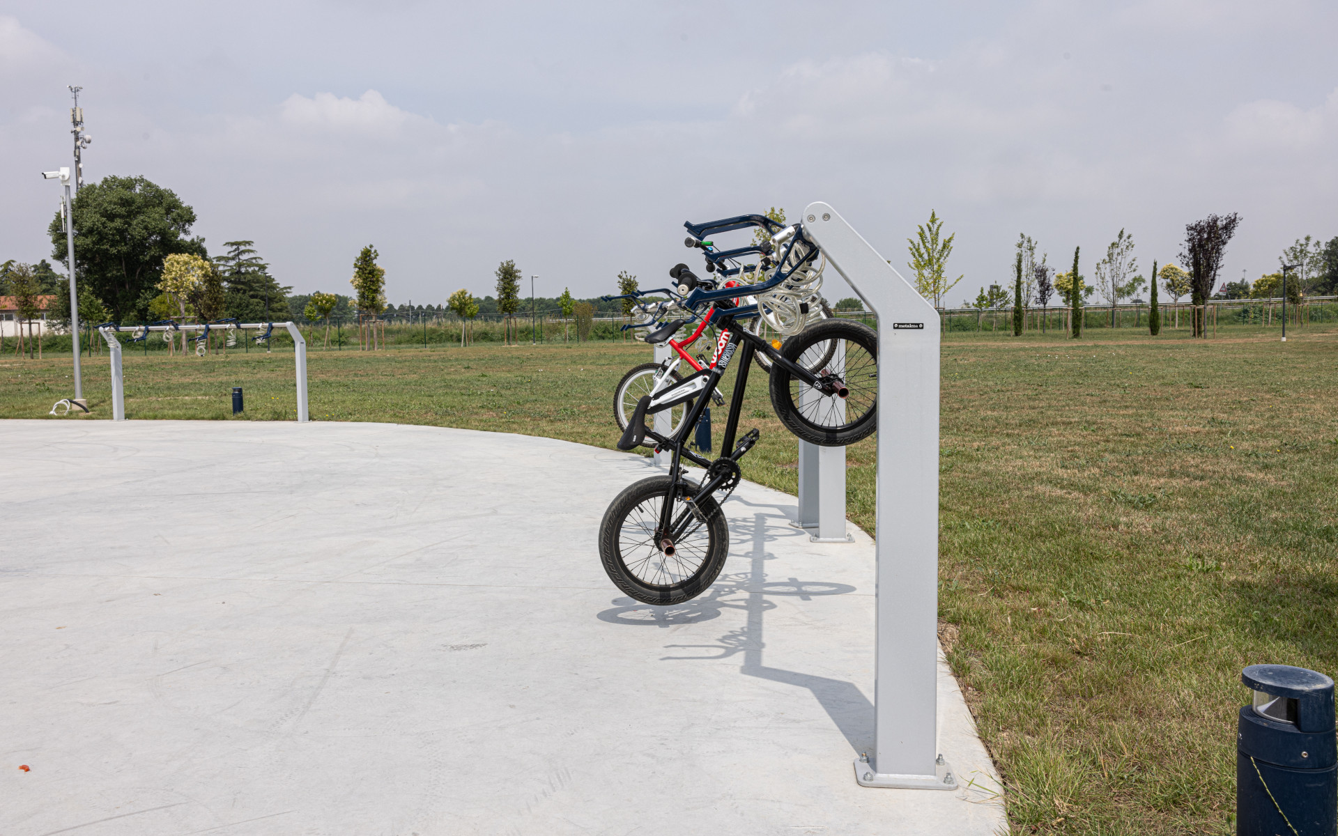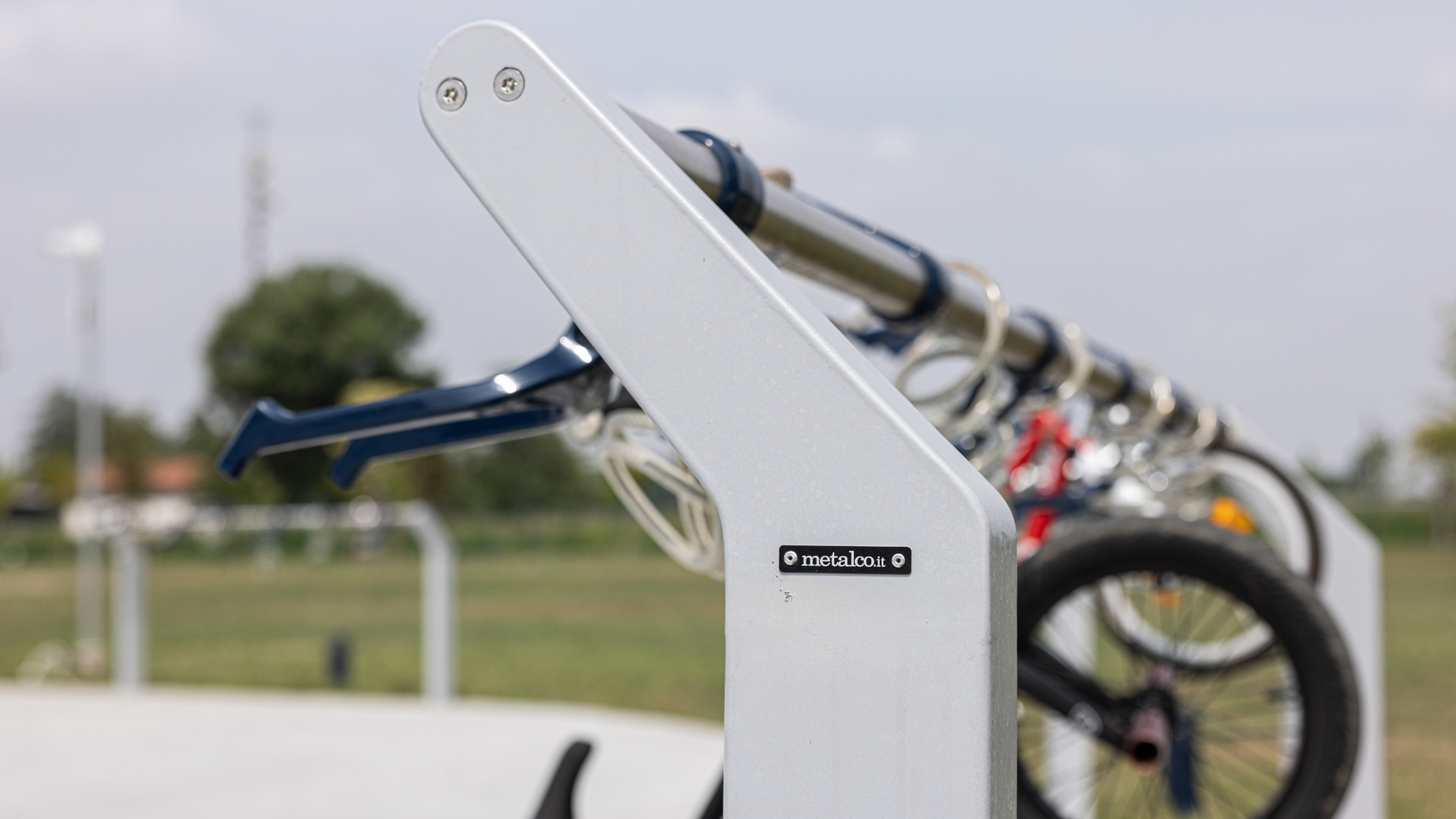 The modular bike rack offers a stylish and practical solution for urban mobility. Its robust steel frame is paired with an aluminum horizontal bar equipped with handlebar supports at two different heights, making it suitable for various types and sizes of bicycles. Each stall includes a PVC-coated steel cable that allows users to securely lock the bike frame, ensuring both convenience and safety in public or private spaces.