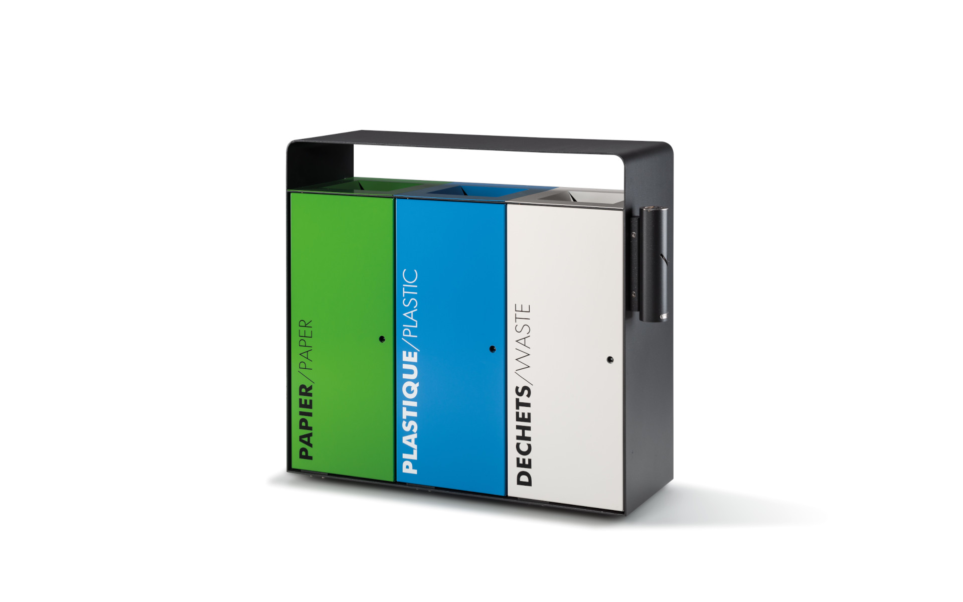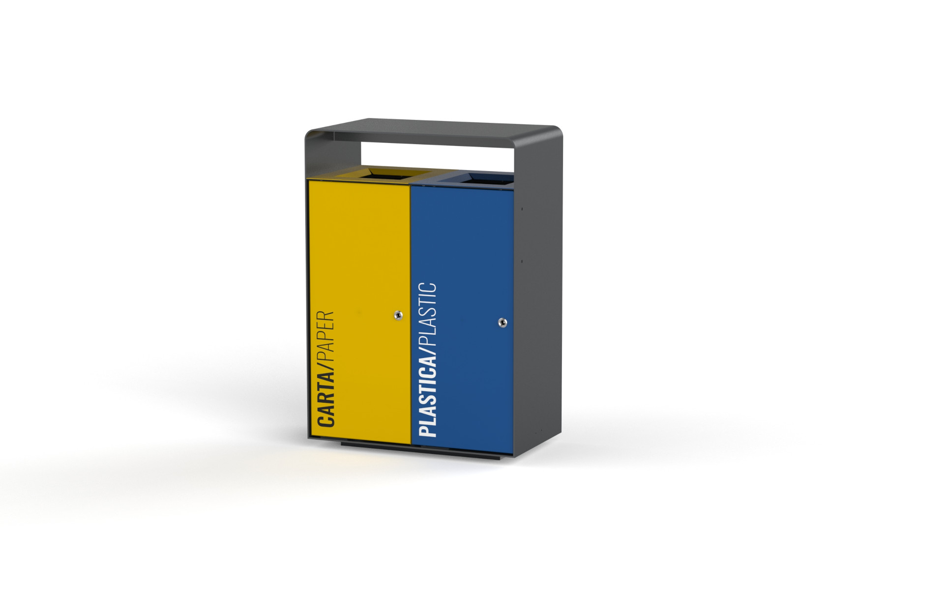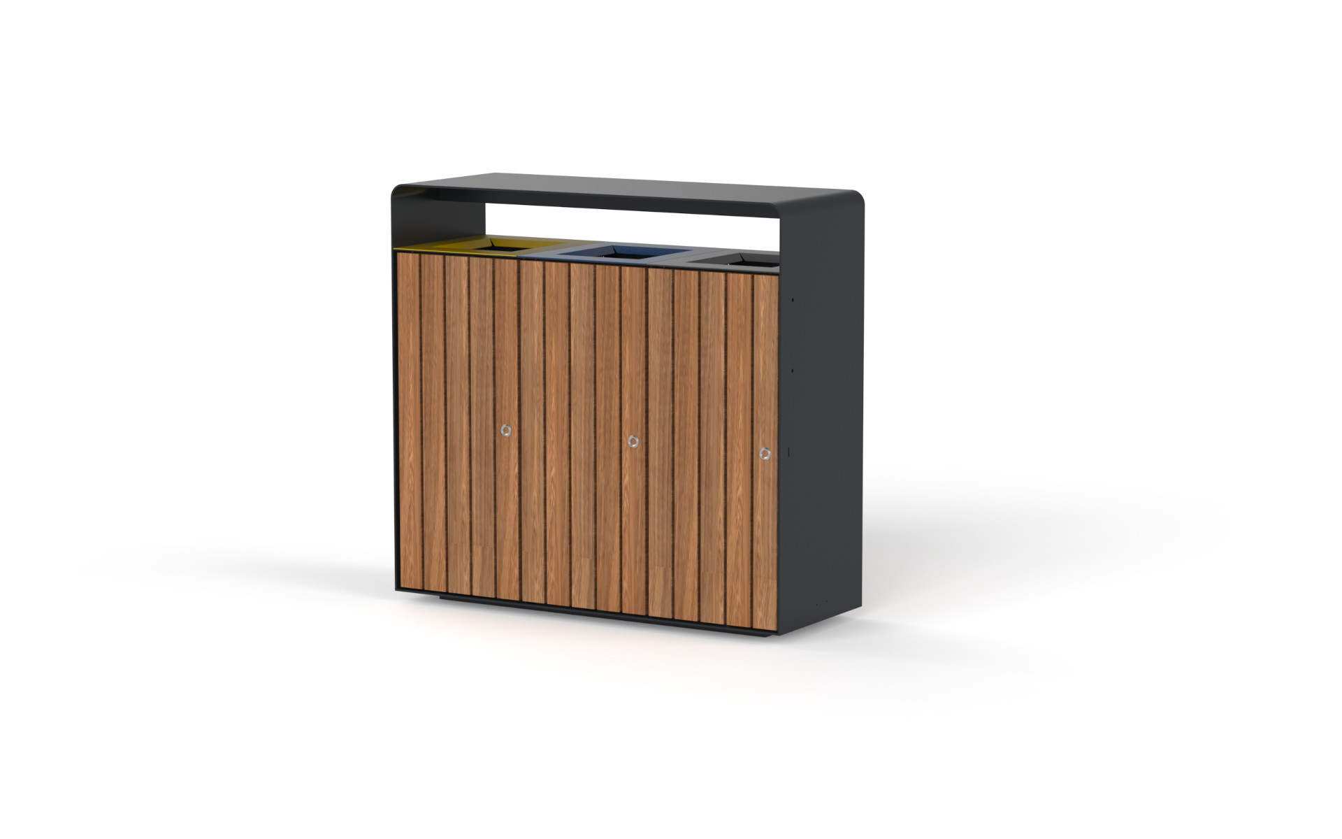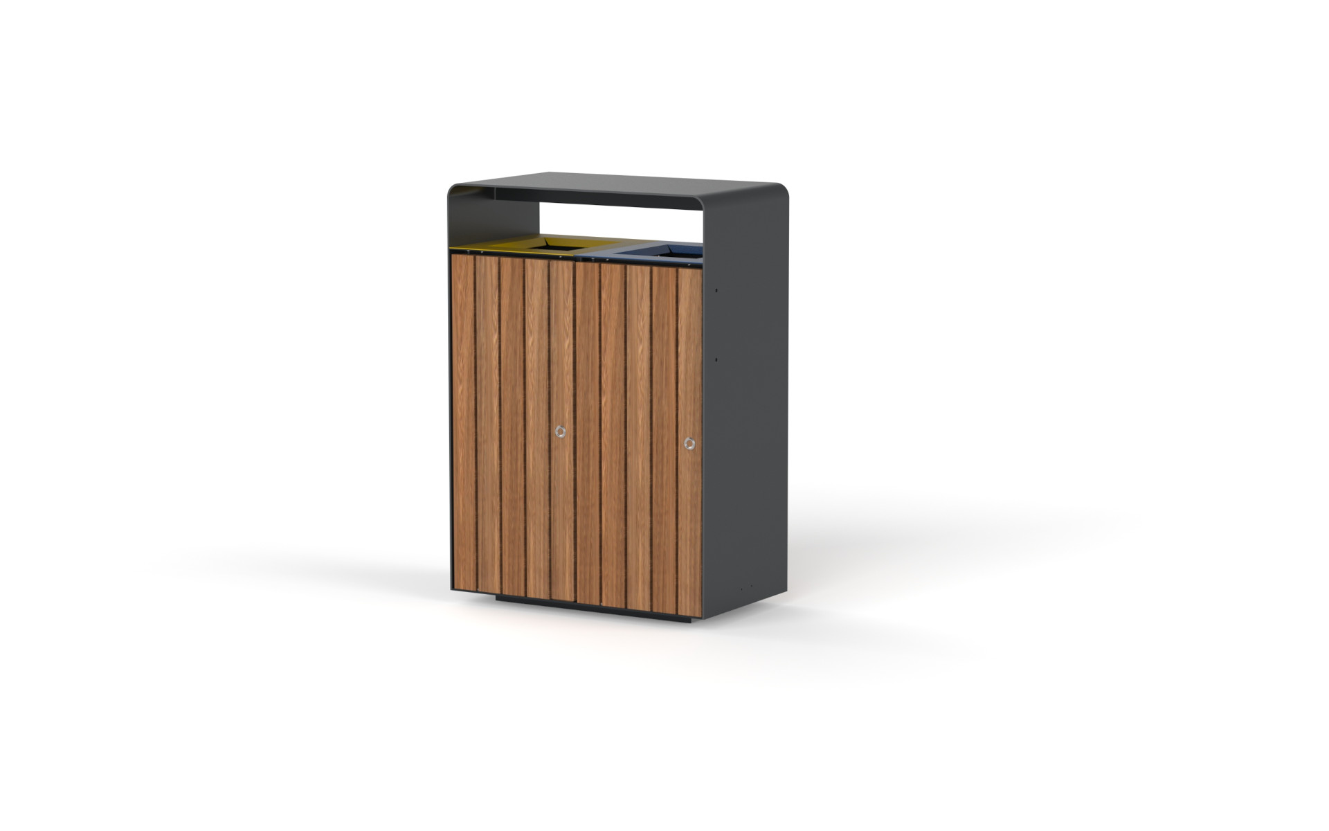 The rectangular bin is designed with a sturdy frame made of thick steel sheet, ensuring strength and durability. The rear is closed with a steel panel, while the front features two or three doors, made of smooth steel or natural IPE wood, equipped with a snap-lock for added security. The rain cover protects the contents, while the chutes allow for easy and orderly waste disposal. With two or three sack rings, this bin is ideal for waste separation, combining functionality with a robust design.