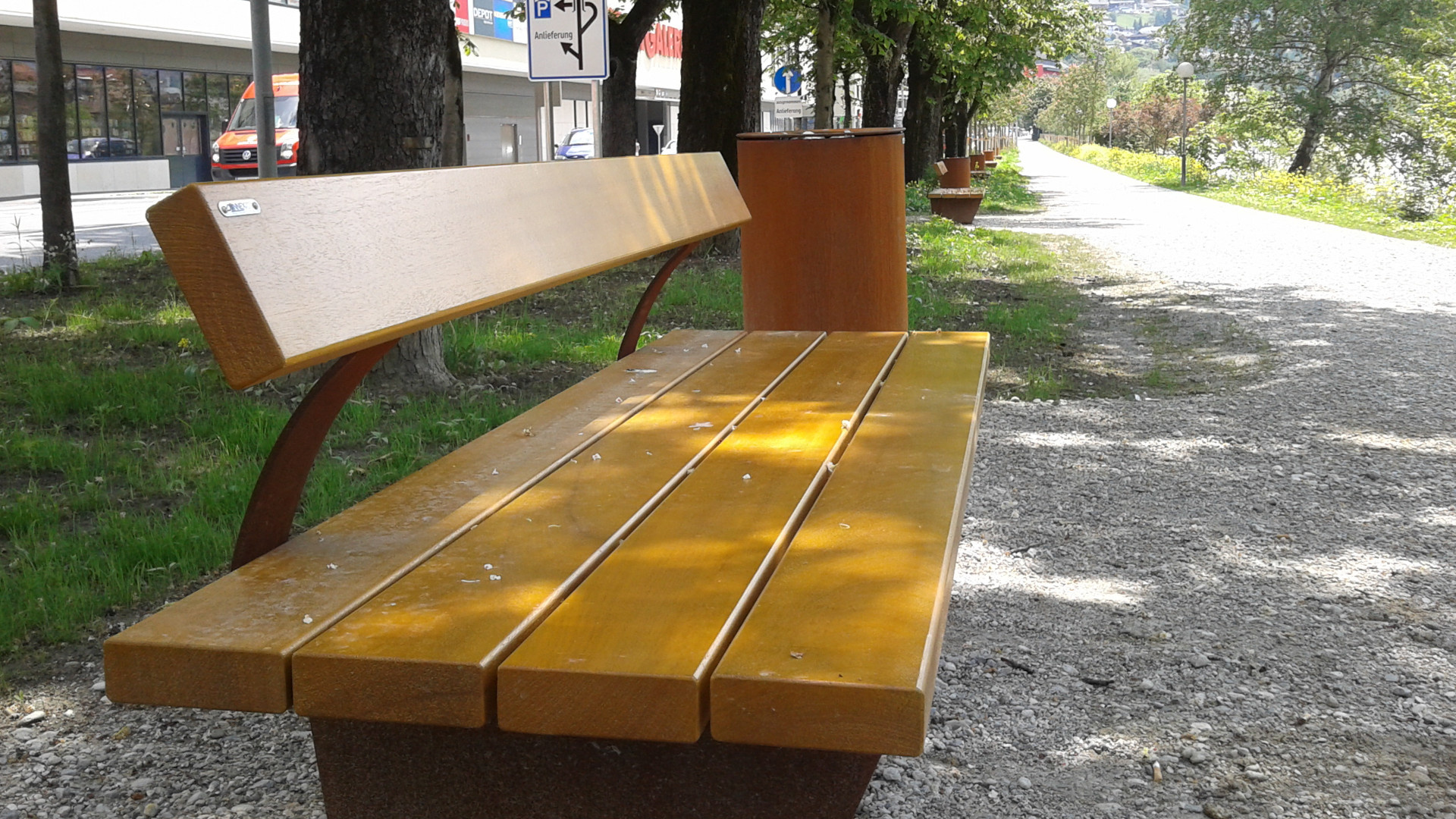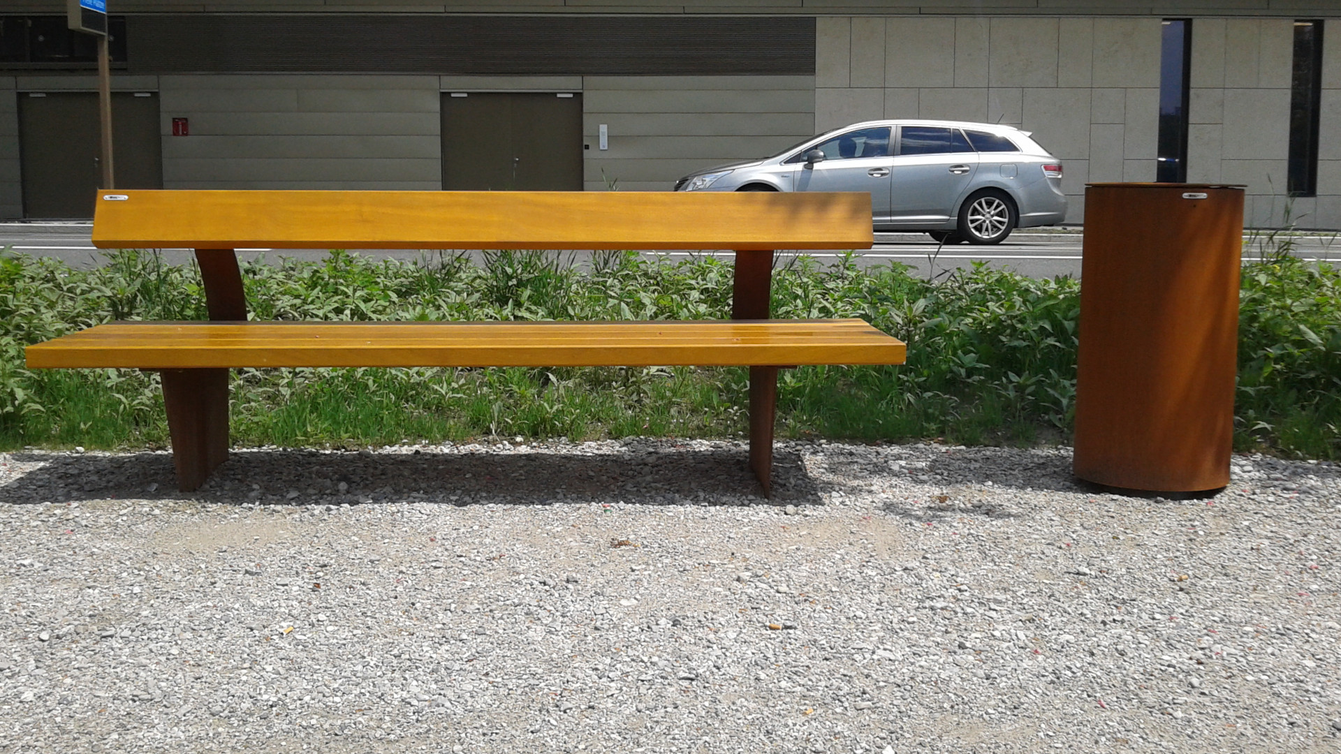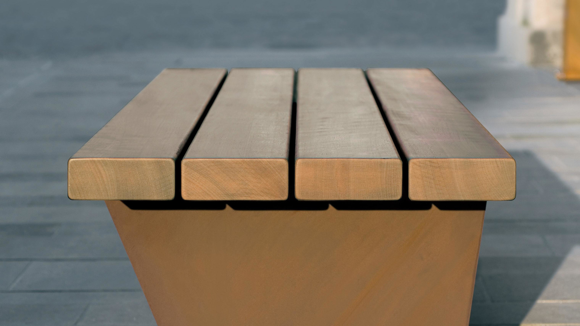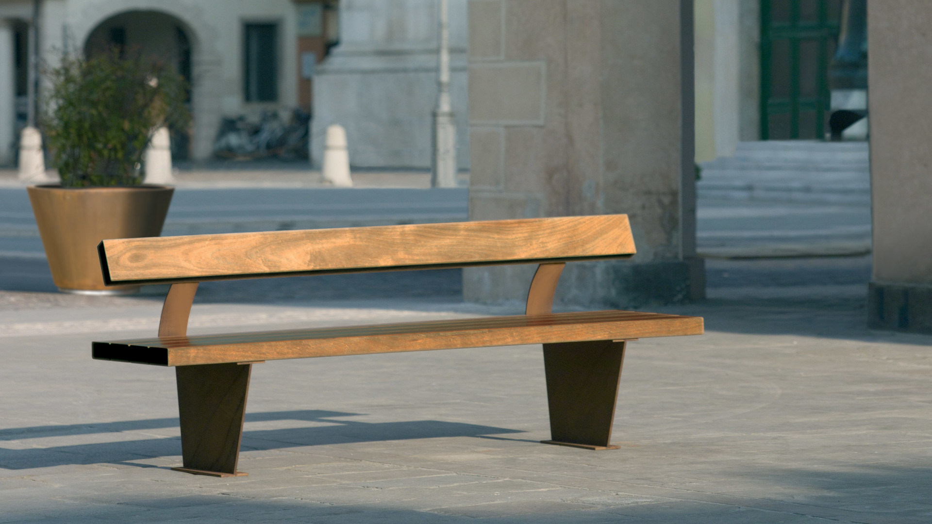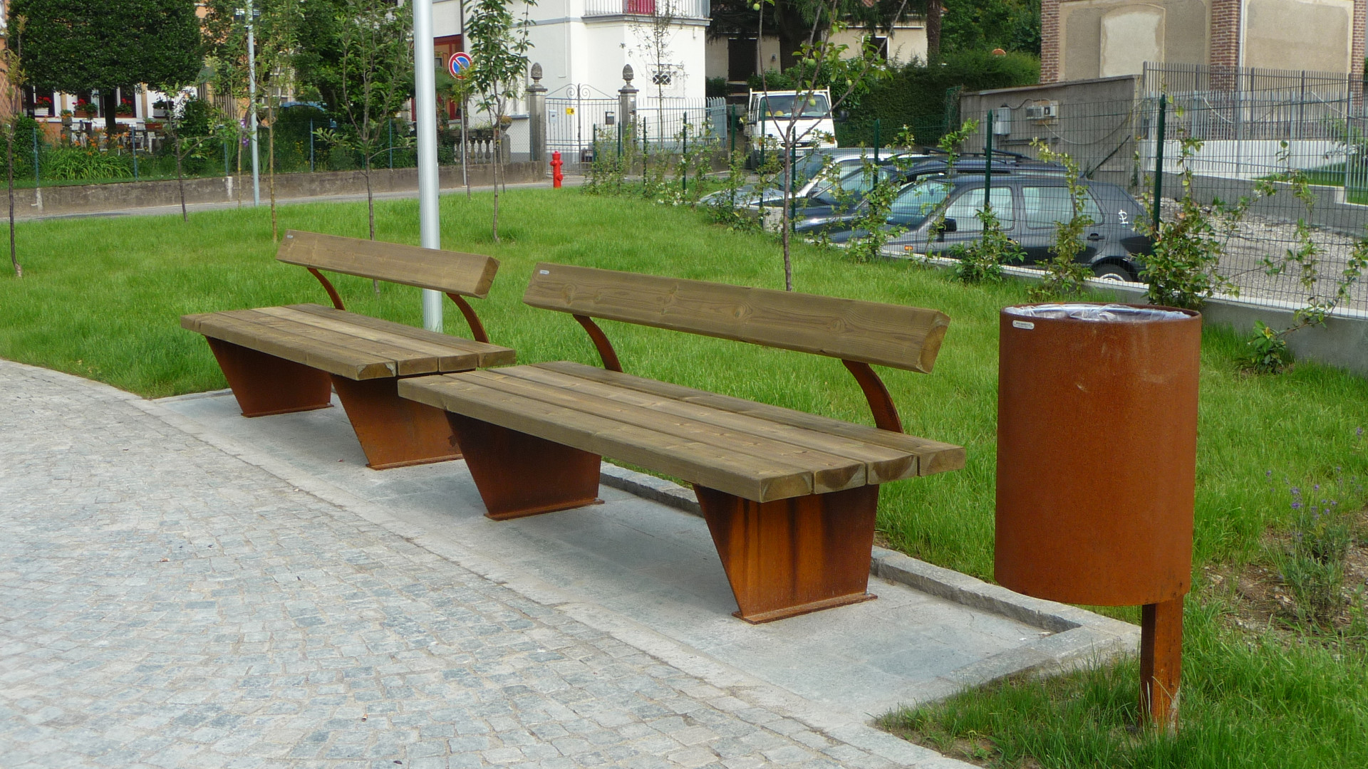 The bench collection includes models with or without a backrest, made with supports in painted steel or Corten and a seat in hardwood or thermally treated pine. This combination of materials ensures durability and resistance, making the benches ideal for urban furniture.