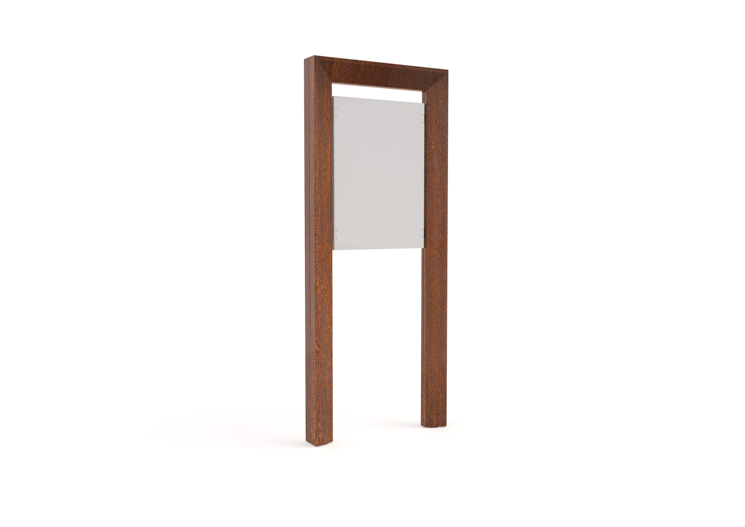 Double-sided display case with a robust and functional design, featuring a supporting structure with two vertical supports in triangular section, made from steel tubing for enhanced strength and stability. The steel panel provides a customizable display surface for stickers, pre-cut lettering, or screen printing. Available in three models with display surfaces of 700×1000 mm, 1000×1400 mm, and 1400×1400 mm, perfect for public and informational spaces, offering clear and visible communication.