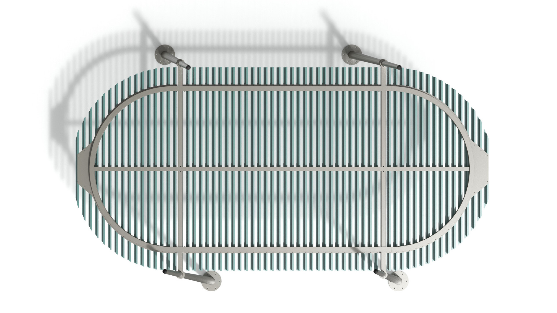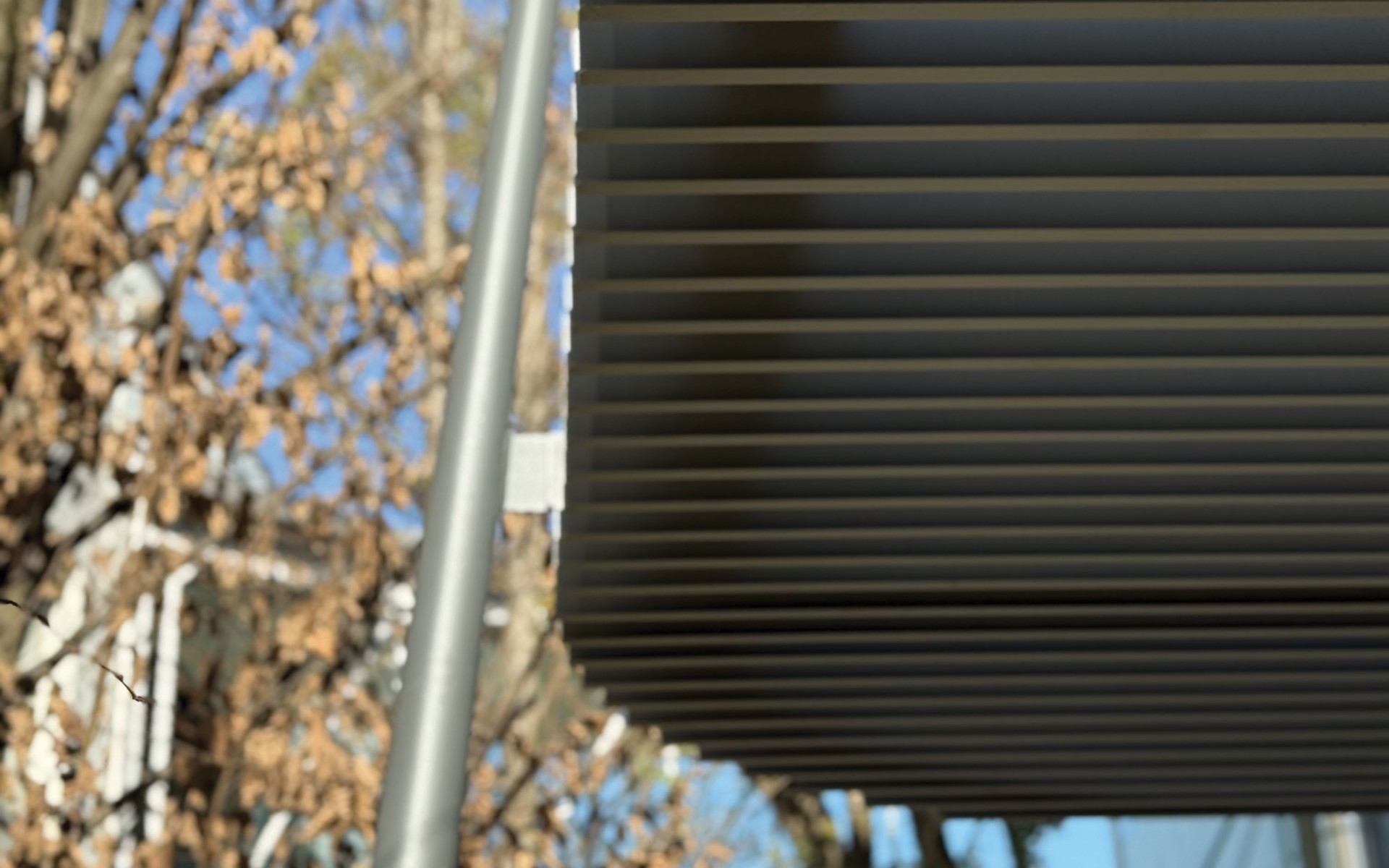 Shade structure collection available in two sizes, designed to combine flexibility and performance in urban environments. Each unit features four painted steel posts, with a choice of three different end fittings: plastic caps, aluminum tips, or integrated lighting terminals. The shading system consists of a painted steel frame with bent and coated acciaio slats, offering durability, effective sun protection, and a consistent, refined aesthetic.