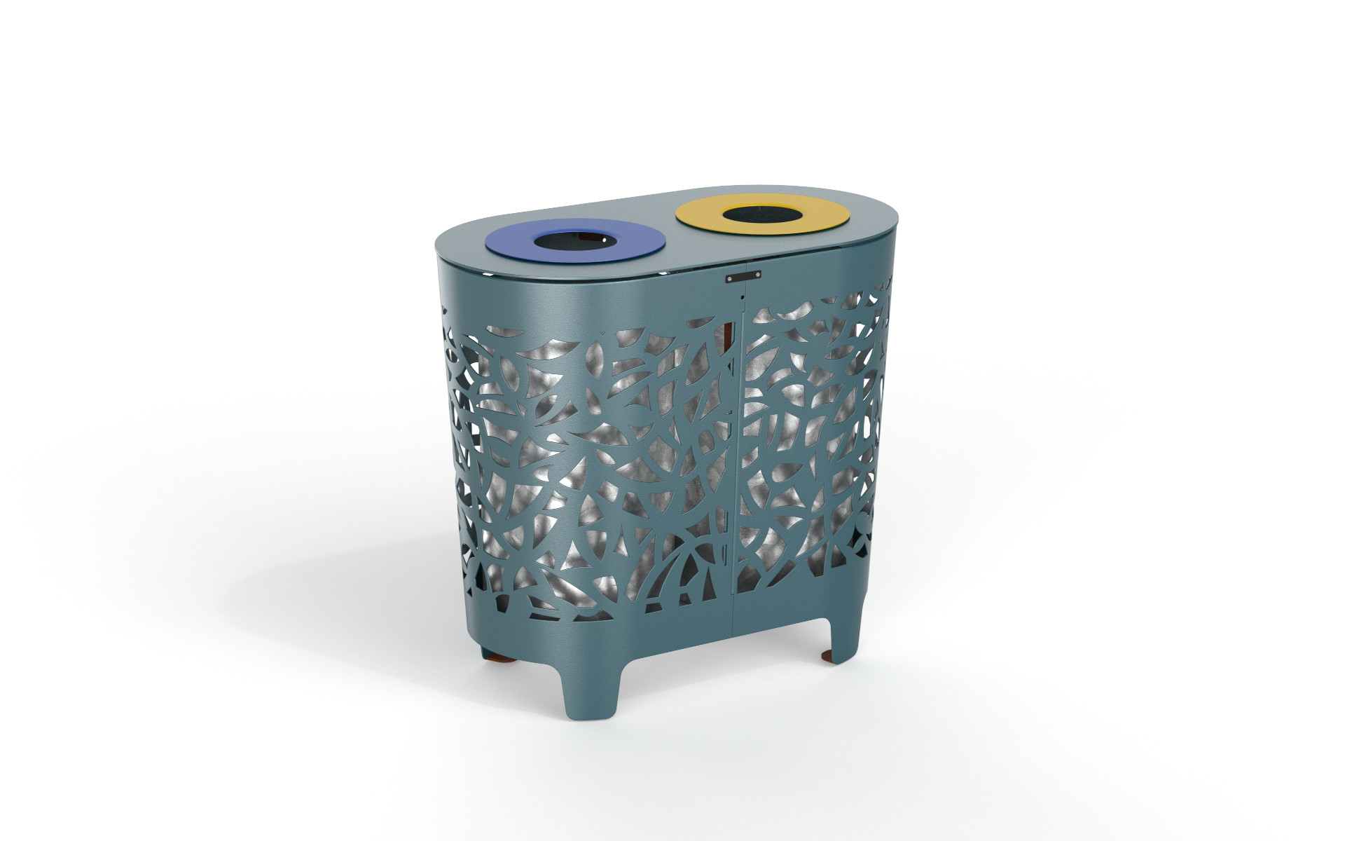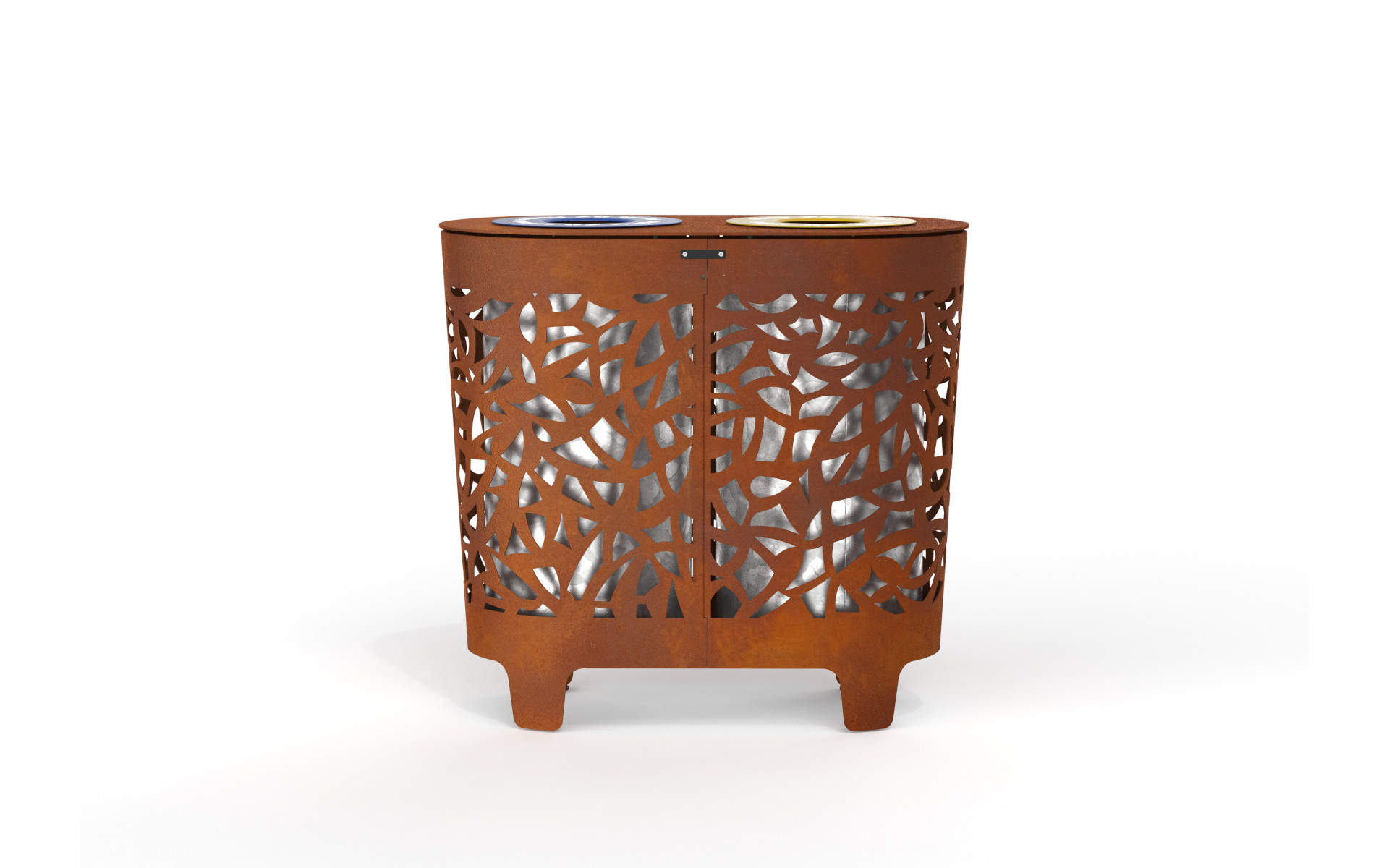 Cone-shaped waste bin made from laser-cut steel sheet featuring elegant botanical patterns. The refined design includes two central hole lids, openable with a snap lock, and two internal steel inner liners. Ideal for public spaces, this bin combines functionality with a carefully crafted aesthetic, perfect for integration into urban environments.