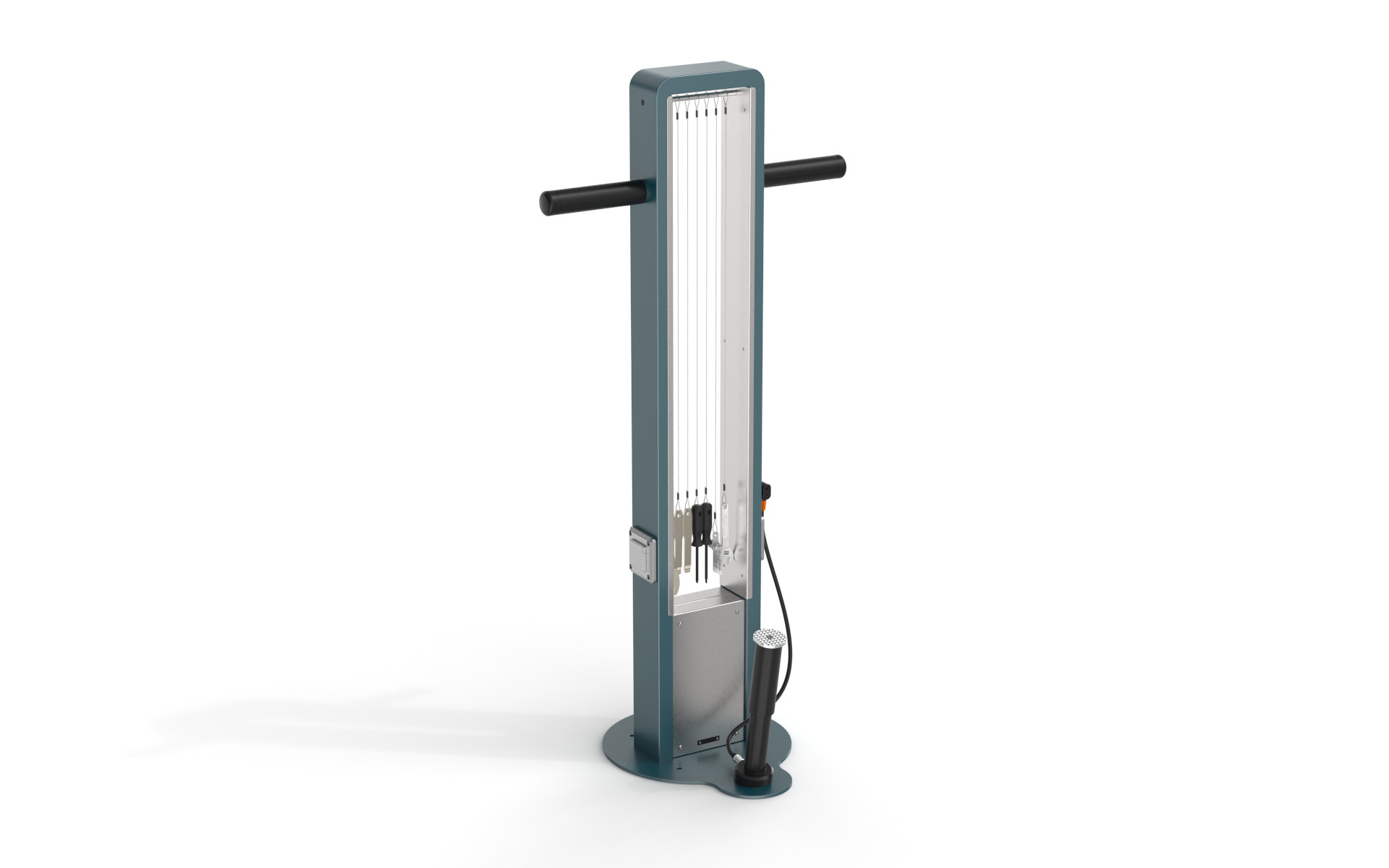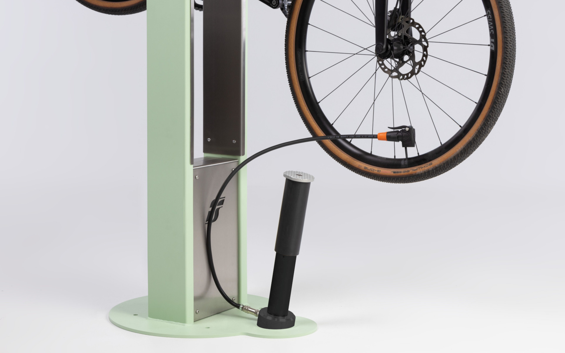 Bicycle repair station with a tubular steel frame welded to a sheet metal base, internally reinforced with AISI304 steel. The top section features two supports coated with heat-shrink tubing, allowing the bicycle to be held securely during maintenance. It can be equipped with standard repair tools and charging outlets.