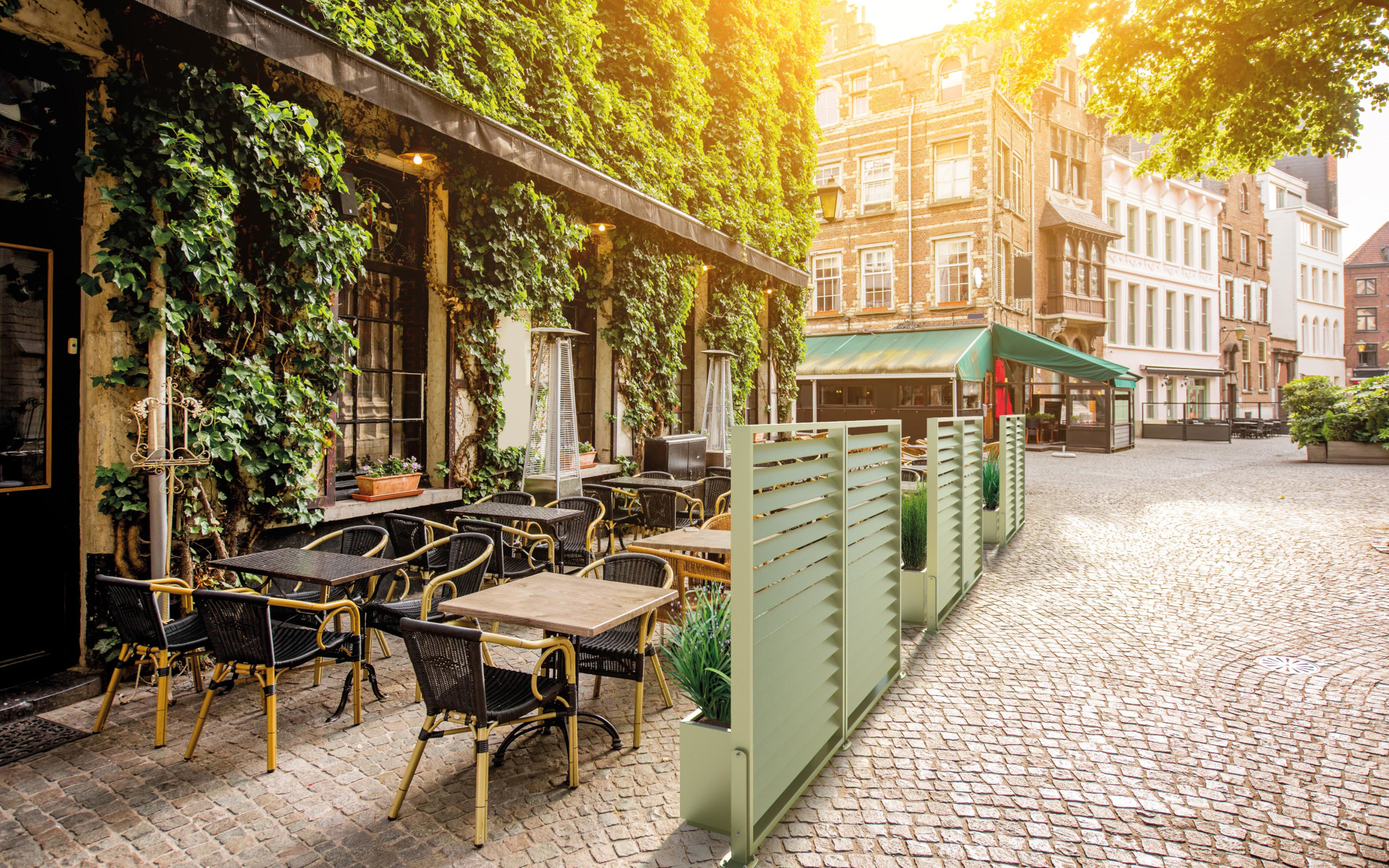 Modular system composed of an aluminum frame equipped with inclined currents, supported by two steel poles and by a rectangular steel planter.