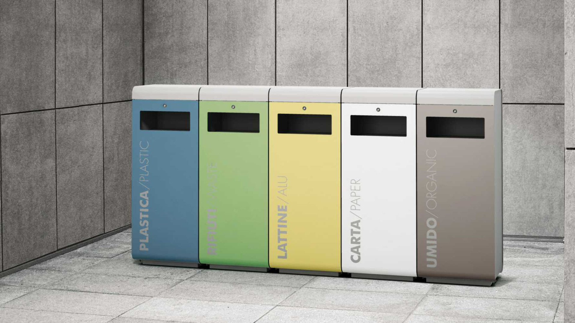 The rectangular waste bin collection features a tubular steel frame, covered with sheet metal and equipped with a rainproof cover. The front door, hinged with gas pistons, is fitted with a sack ring with elastic and a snap lock. Available in two sizes, with or without a top ashtray, these bins can be arranged side by side to create waste separation islands, providing functionality and elegant design for public spaces.