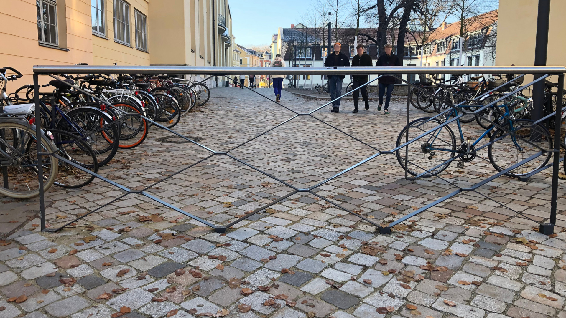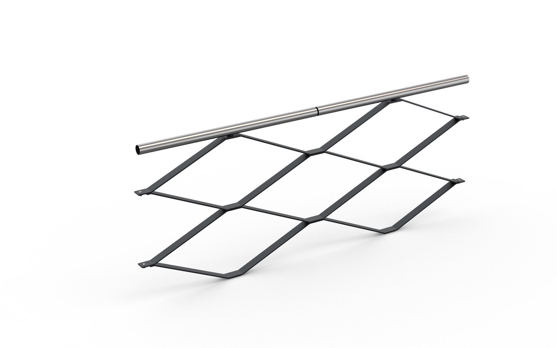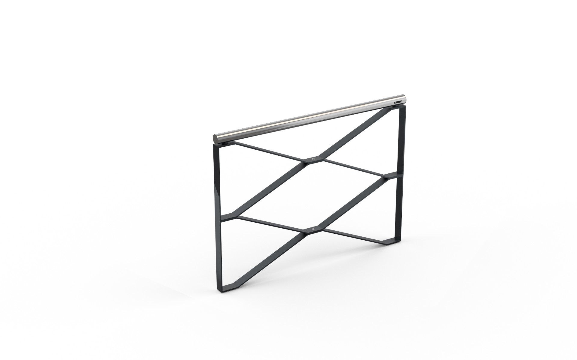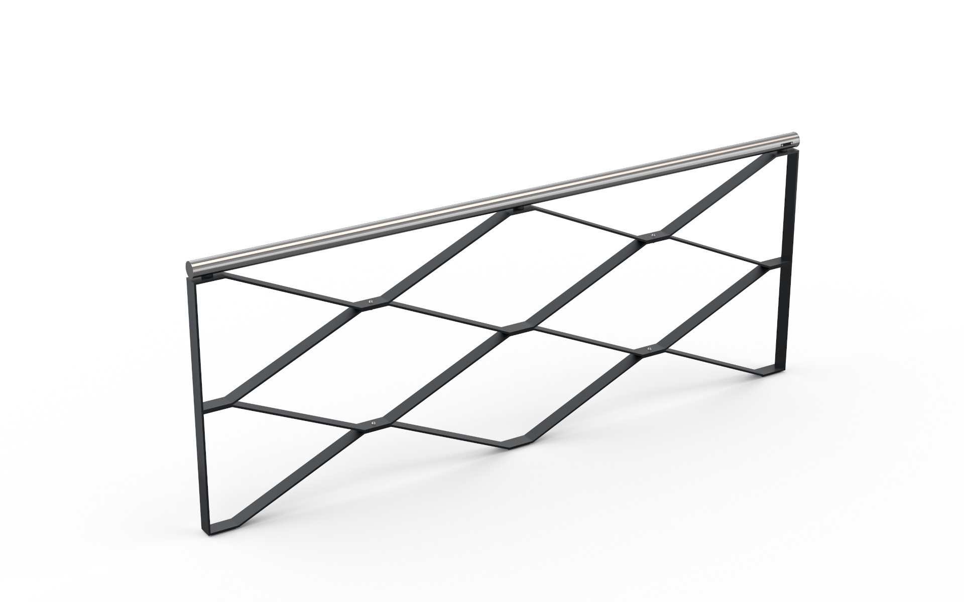 The modular barrier consists of a panel with a stylish diamond pattern made from steel plates, complemented by a handrail in stainless steel tubing for added strength and durability. The collection includes two modules: the terminal module (for beginning/end) and the composition module, which allows for customizable barrier layouts to fit any public space, combining functionality and distinctive design.