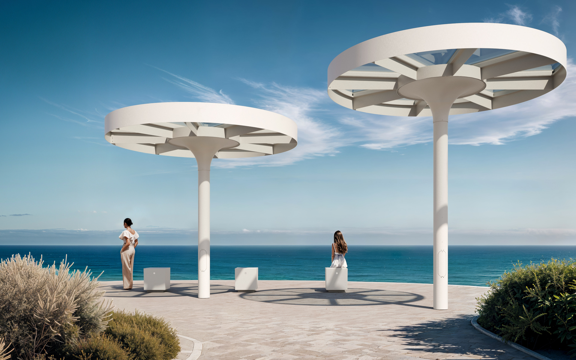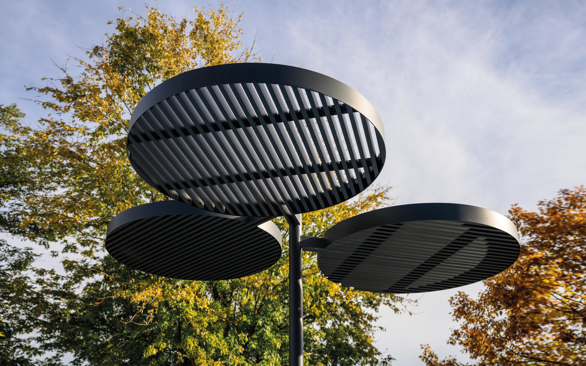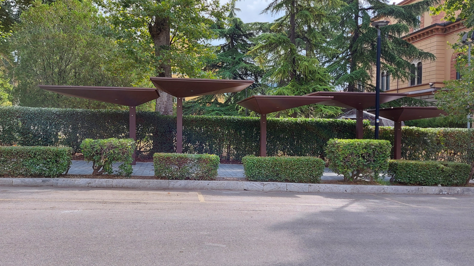 The collection of covers, designed as canopies, features a steel supporting column that holds an inverted pyramid-shaped structure, made of steel tubing. The underside is covered with sheets, while the top is fitted with Okumè plywood panels, protected by a waterproof membrane that channels rainwater into the column through a PVC pipe. The structure is designed to accommodate an LED lighting system and is available in various sizes and heights, making it adaptable to different urban spaces.