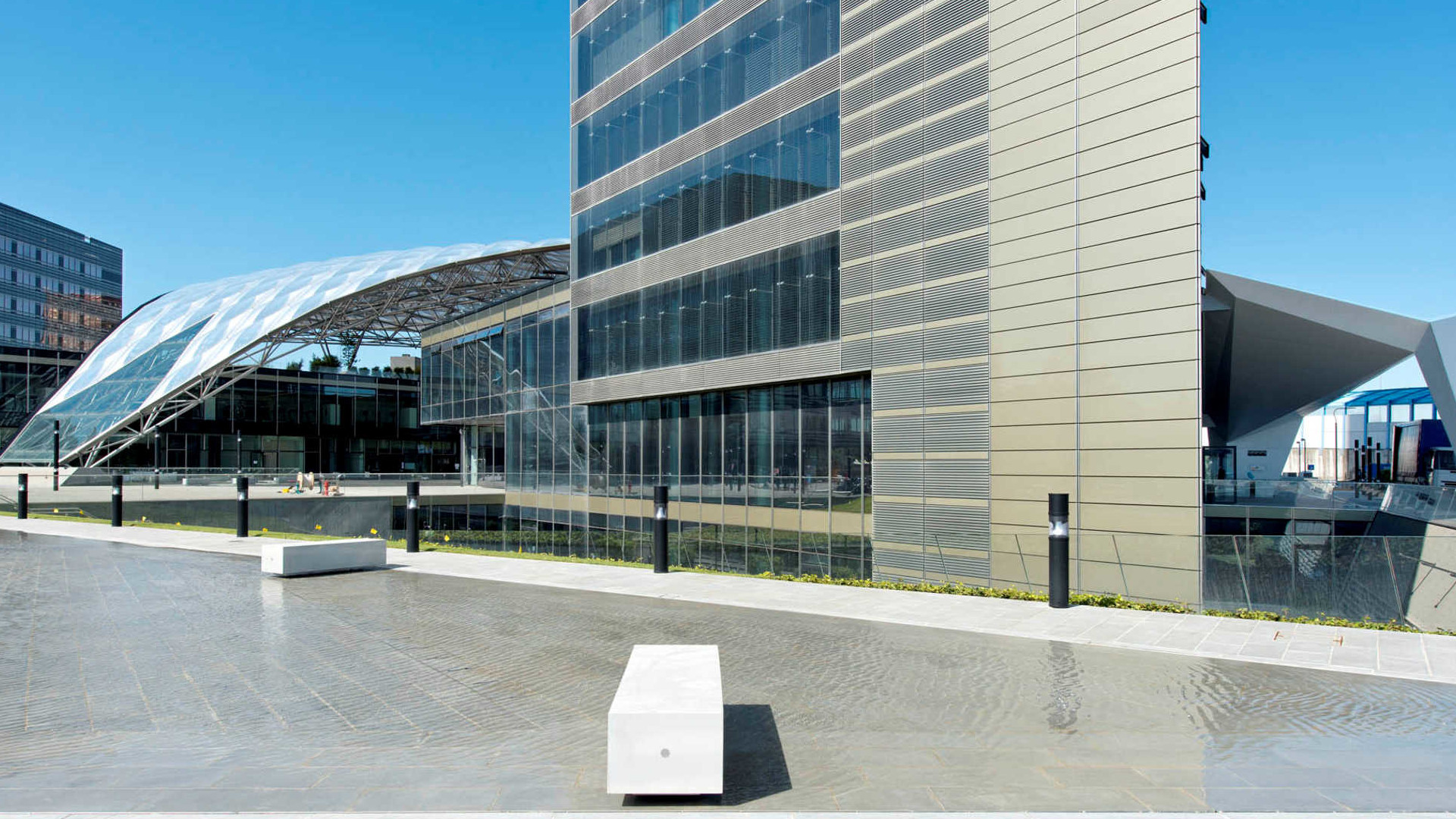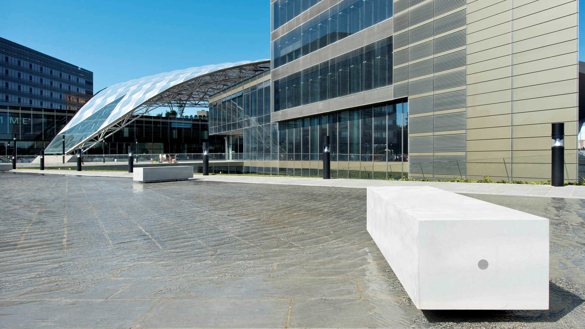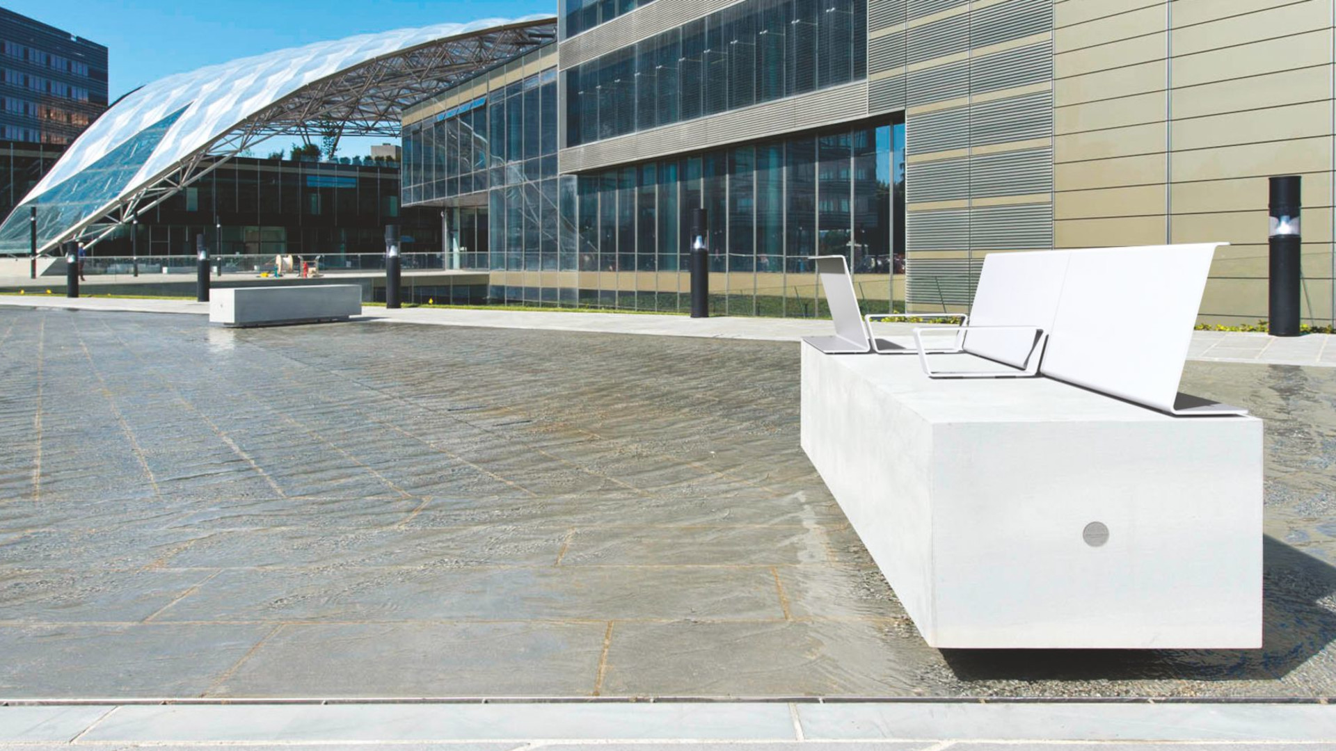 Essential and sculptural, the monolithic seats in this collection are made of lightweight HPC (High Performance Concrete), combining structural strength with contemporary design. Modular and backless, they feature a recessed base for easier ground maintenance and adapt seamlessly to urban spaces, allowing for both freeform and linear compositions.