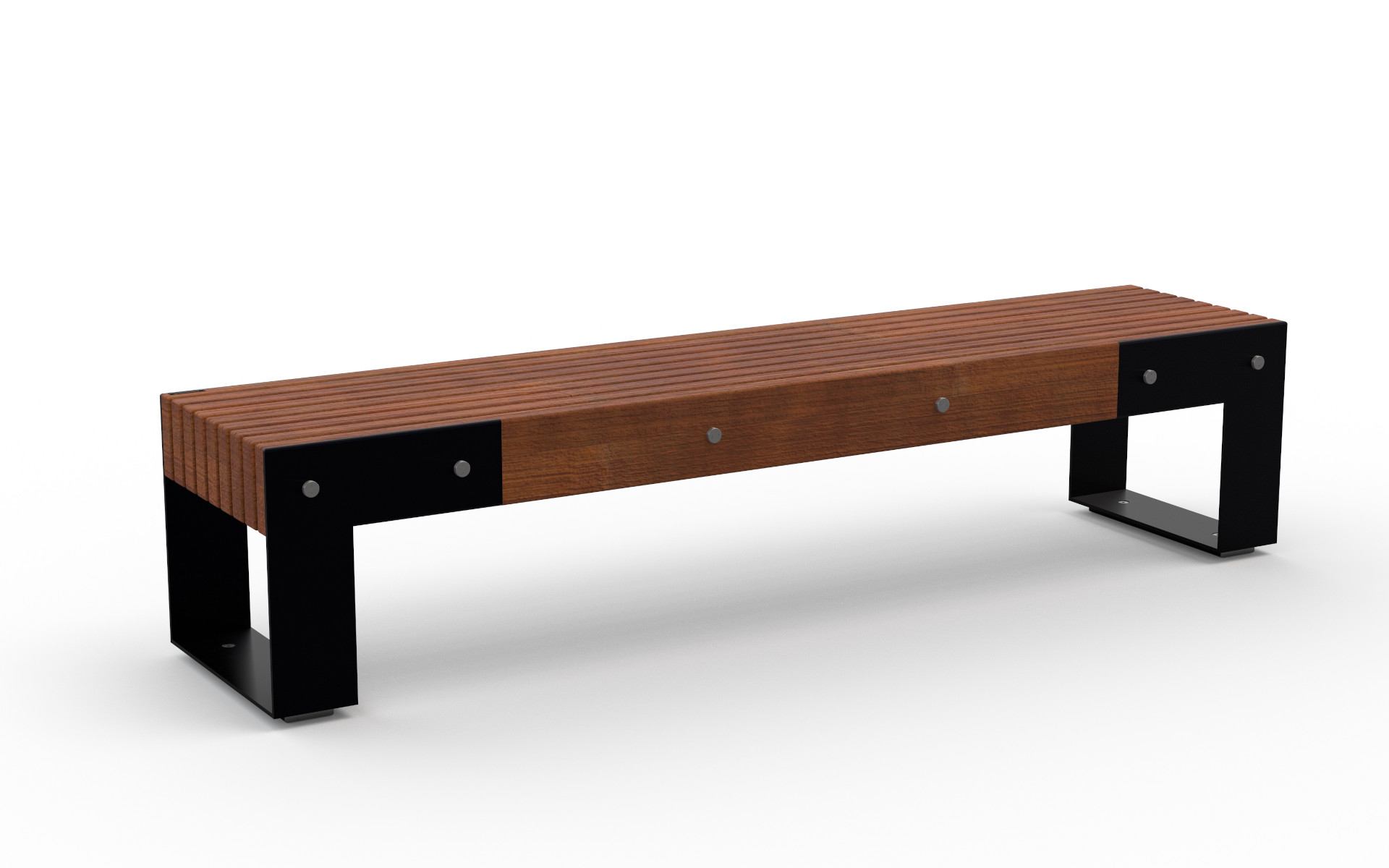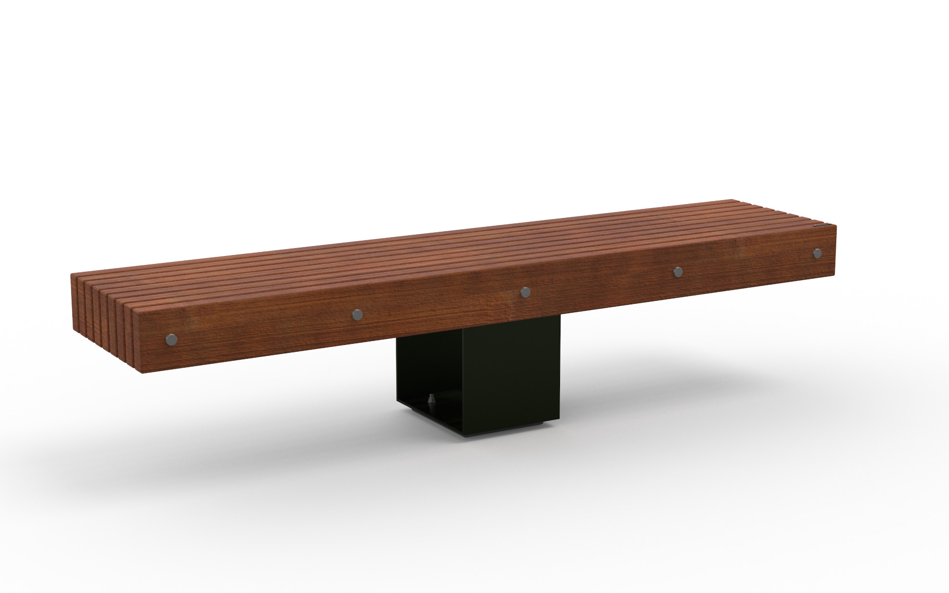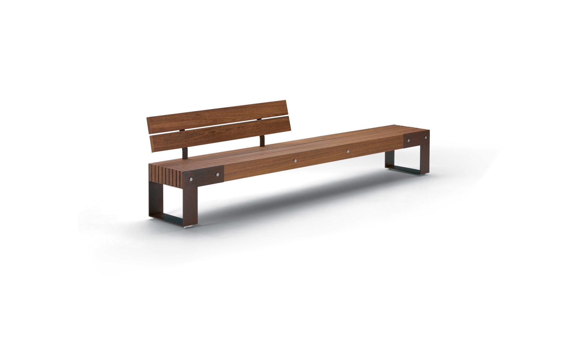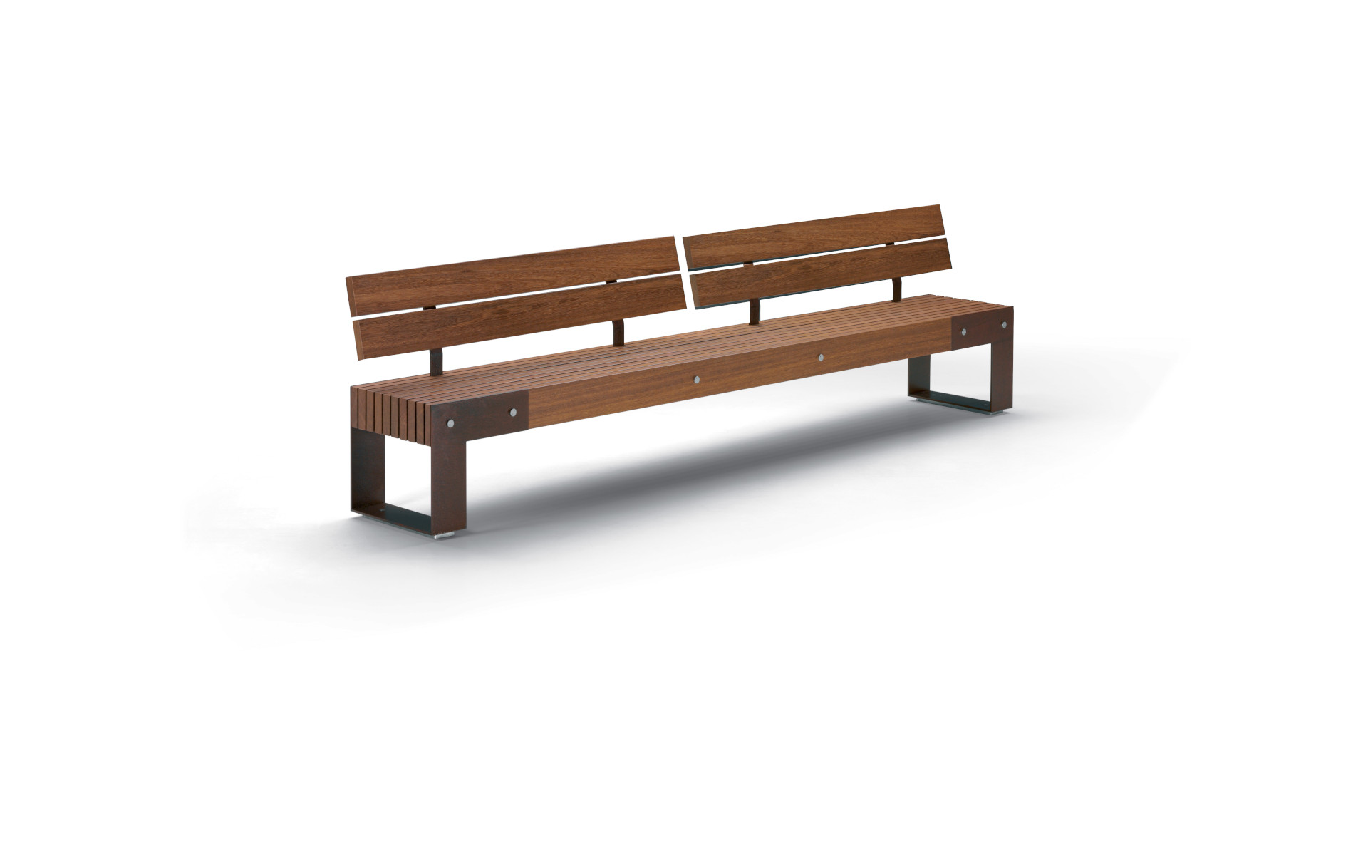 The bench collection features a seat made of wooden planks (hardwood or thermotreated pine wood), arranged vertically and connected by a steel connecting bar (painted or corten), with stainless steel end caps. The supports, also in steel, ensure stability. Available in two sizes, with or without a backrest, this bench combines functionality with a natural design, making it ideal for urban environments or public spaces.