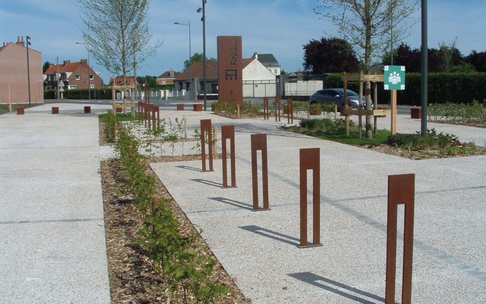 Bike rack made of rectangular steel plate with rounded corners equipped with steel tube support with base plate.