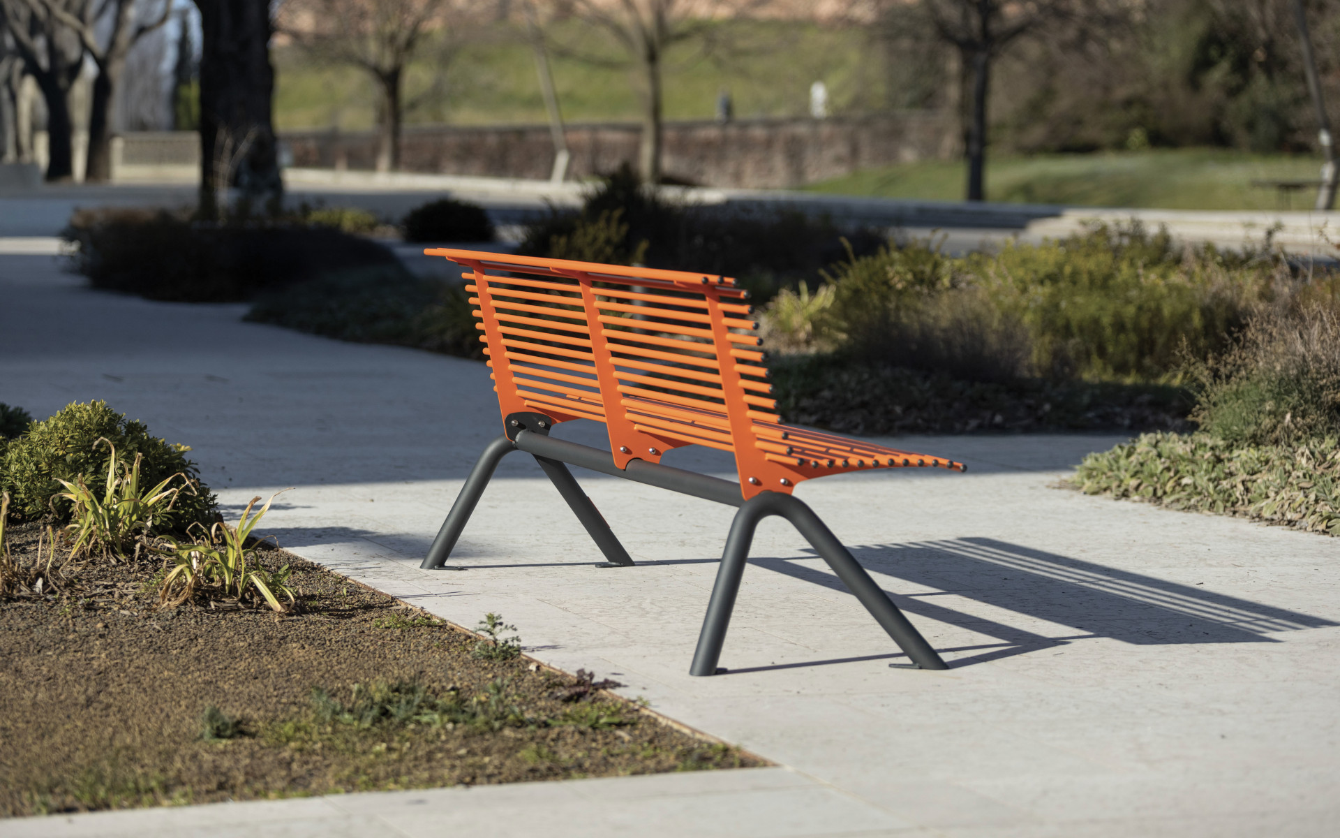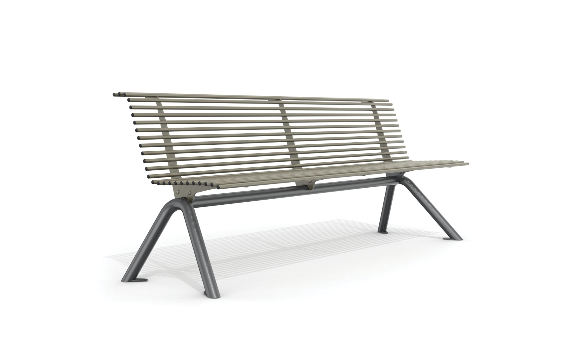Collection of benches, with or without backrest, equipped with a support consisting of a horizontal beam and two V-shaped supports in tubular steel. The seat surface and backrest are made up of a series of painted steel tubes, welded on sheet metal support shoulders.