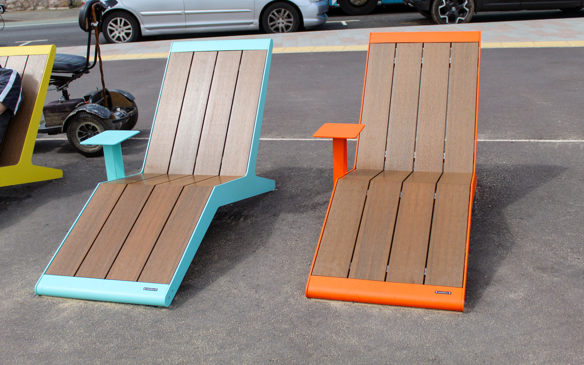 The chaise longue is made from high-quality WPC (Wood Polymer Composite) boards, ensuring durability and a natural aesthetic. The side panels are crafted from laser-cut steel sheet, offering an elegant and modern design. Reinforcements in painted steel tubing provide stability and long-lasting performance, making this chaise longue an ideal choice for both public and private spaces.