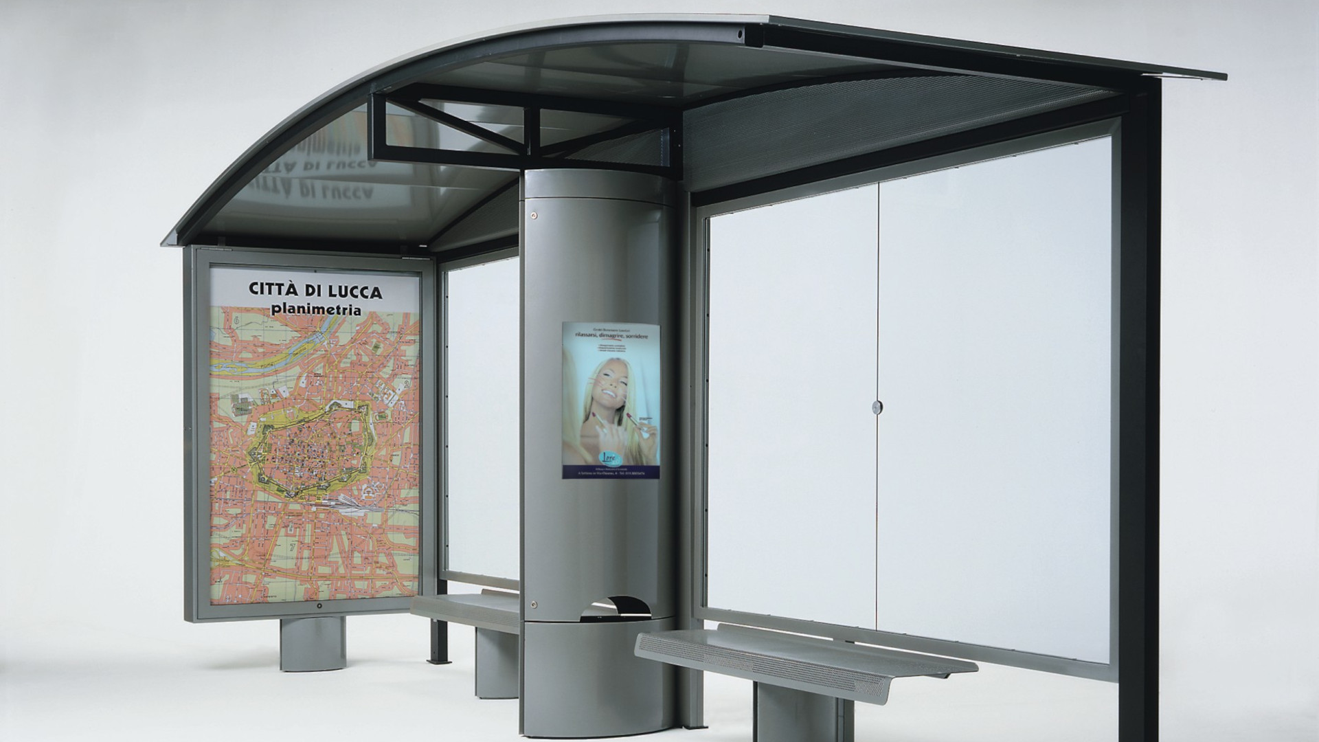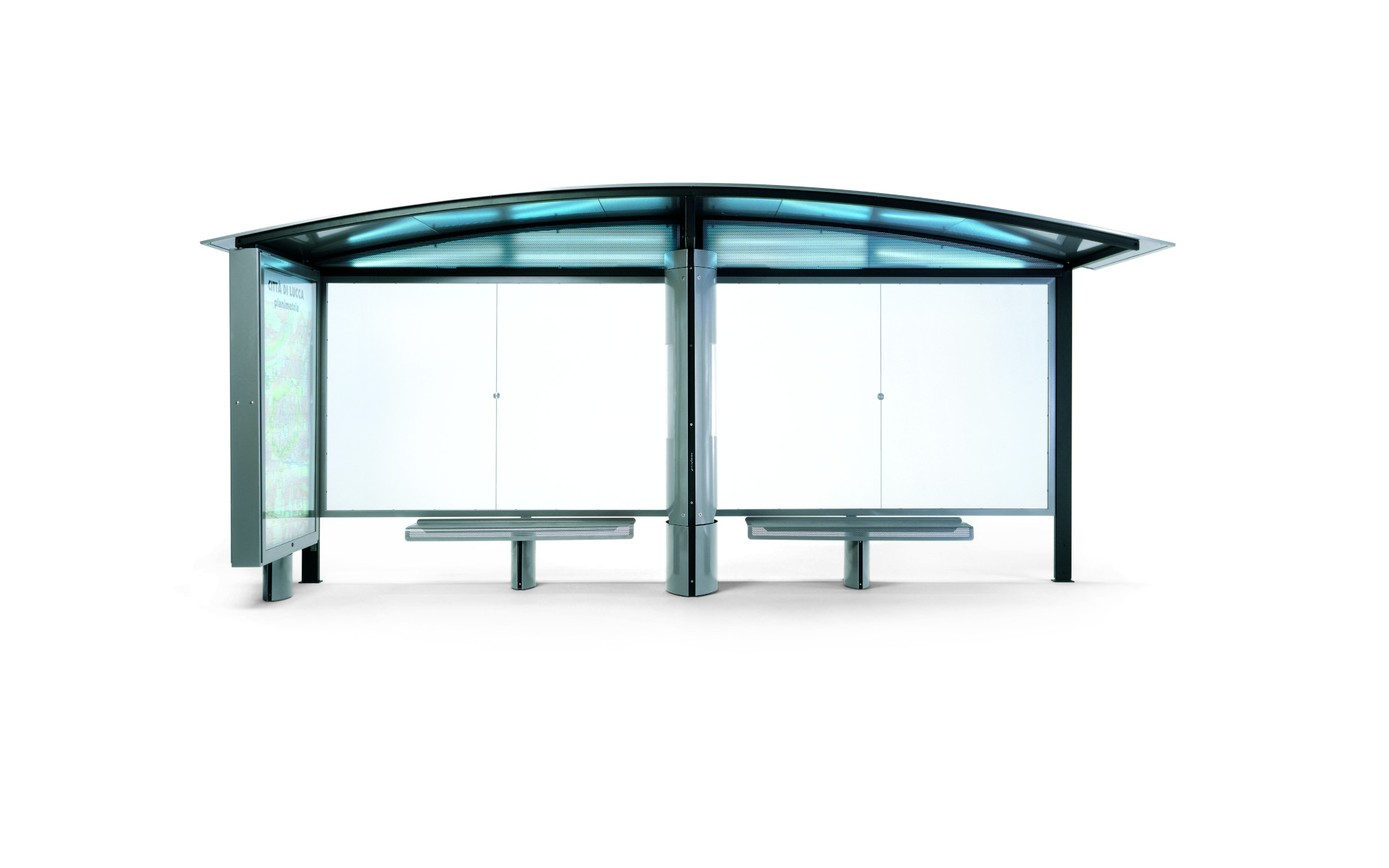 This collection’s shelter offers an elegant and functional solution, featuring a tubular steel frame and a rear wall made from steel profiles with tempered glass panes. The roof, shaped from steel sheet metal with a painted aluminum extrusion edge, gives it both style and durability. The design includes an integrated waste bin with a bag holder ring and a lockable door, and an aluminum display case with a snap lock for posting information. The structure is also prepared for the installation of an advertising panel. The shelter can be completed with a backless steel bench, featuring a seat decorated with perforations, making it perfect for public spaces and urban areas.