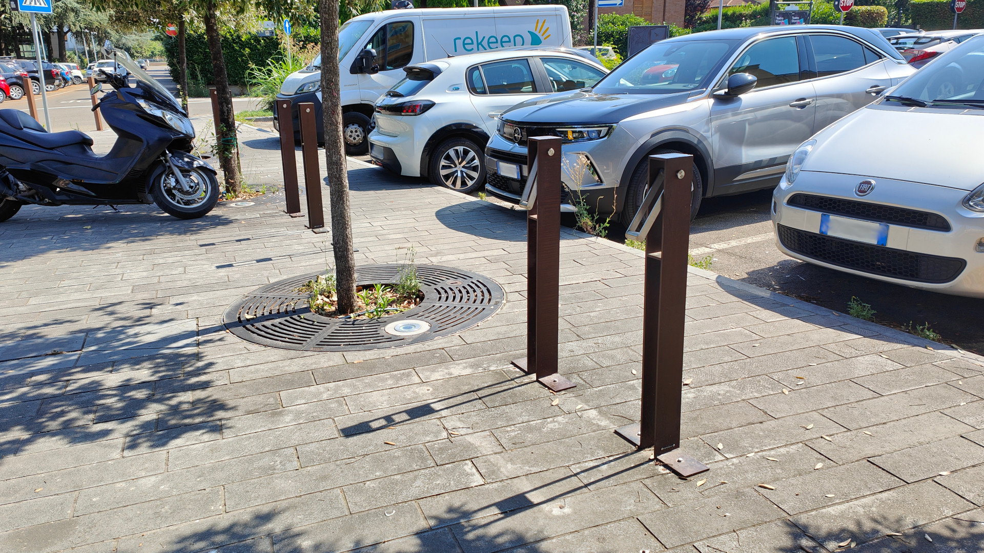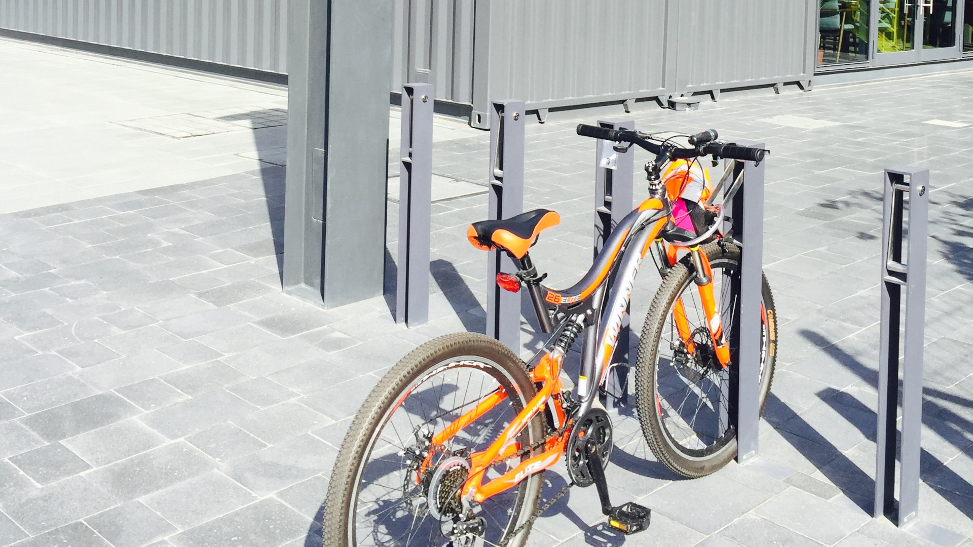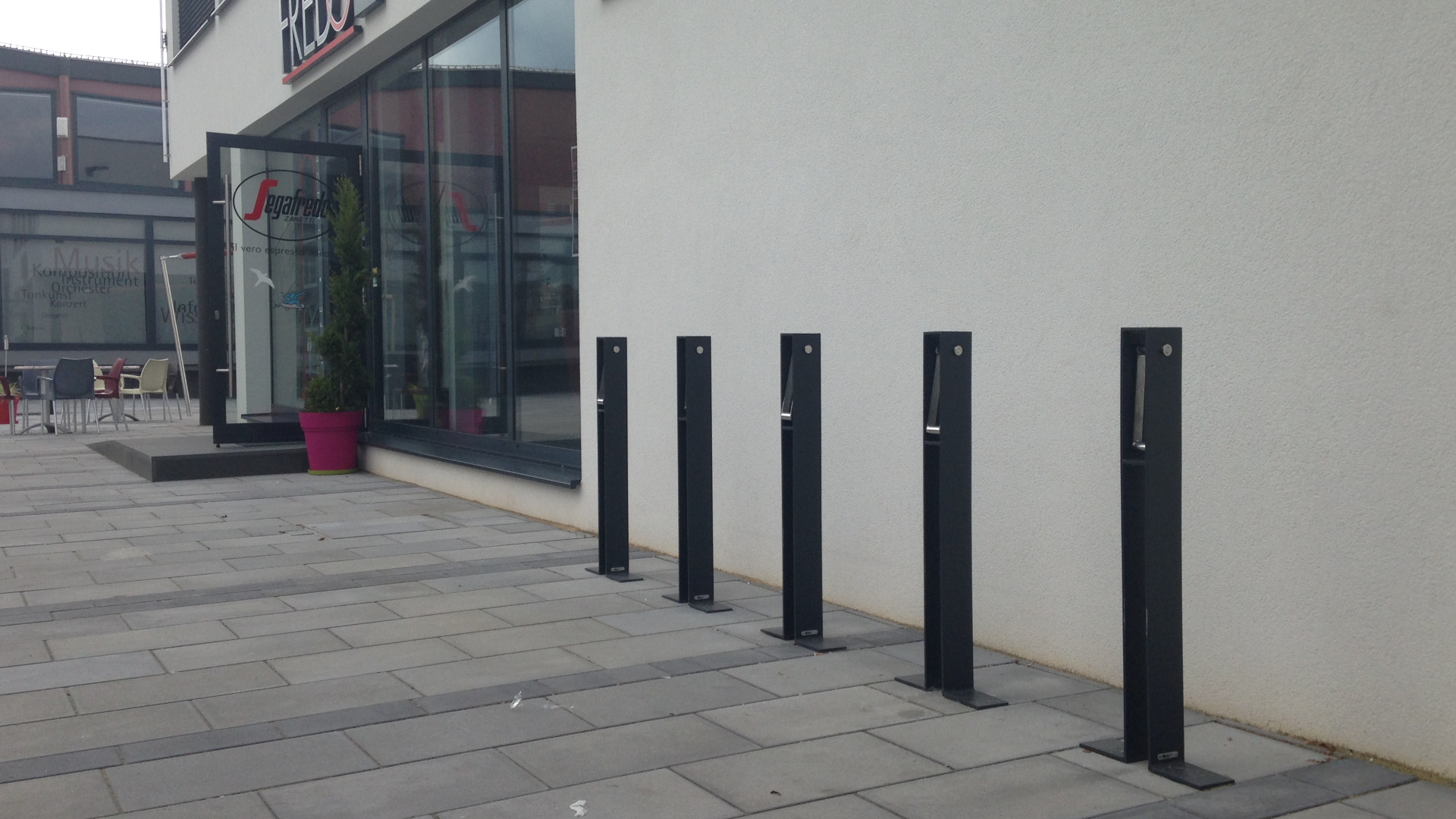 The bicycle rack is made of steel plate and features a movable stainless steel linkage, allowing the bike to be securely locked through the frame. This system is practical and effective for urban use, providing a robust and durable solution for bike parking.