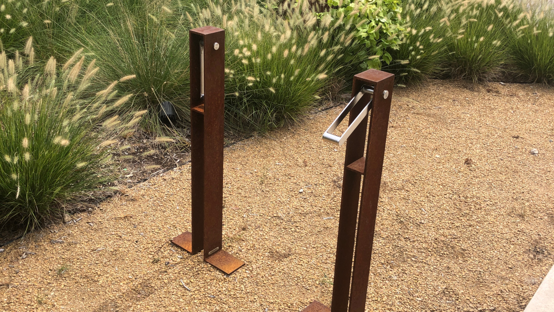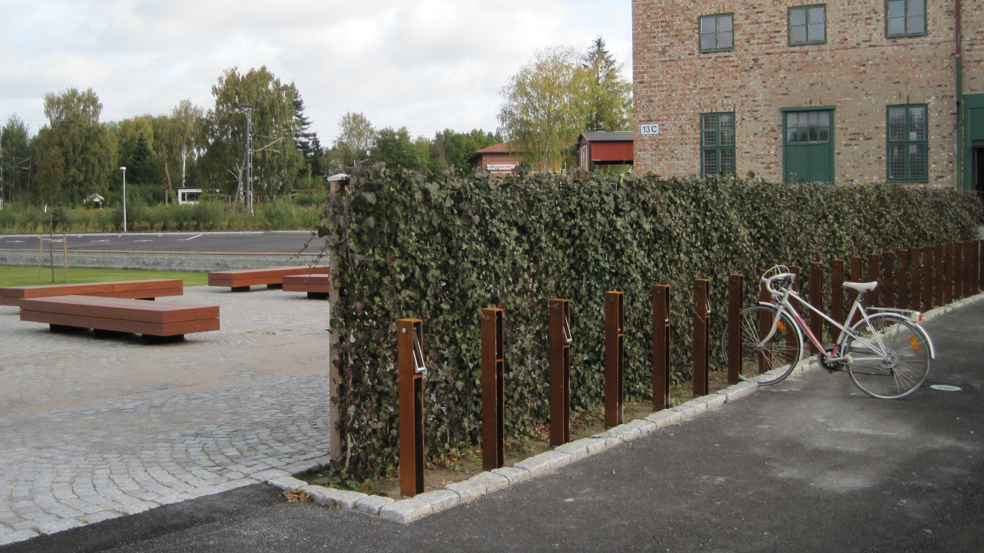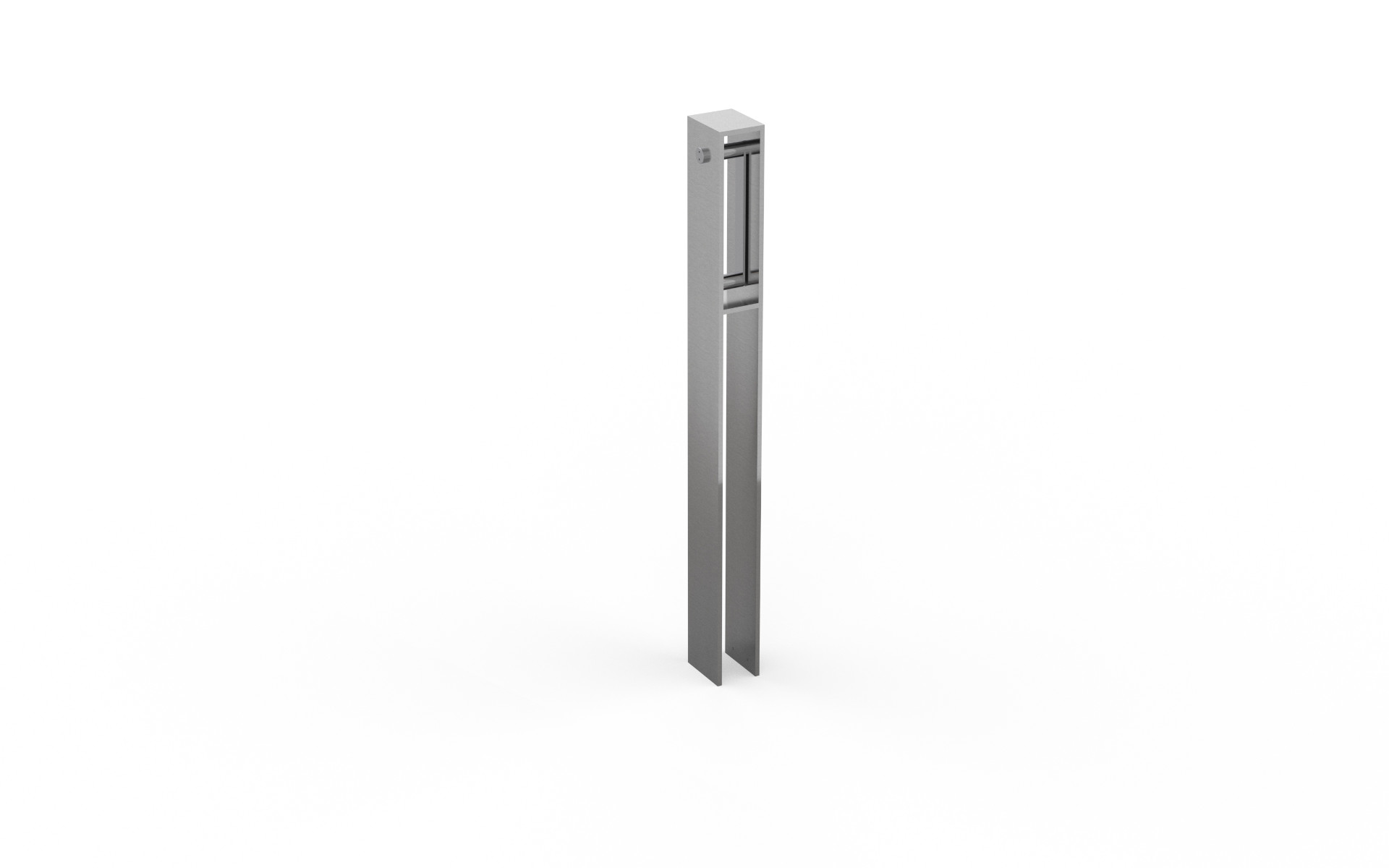 The bicycle rack is made of steel plate and features a movable stainless steel linkage, allowing the bike to be securely locked through the frame. This system is practical and effective for urban use, providing a robust and durable solution for bike parking.