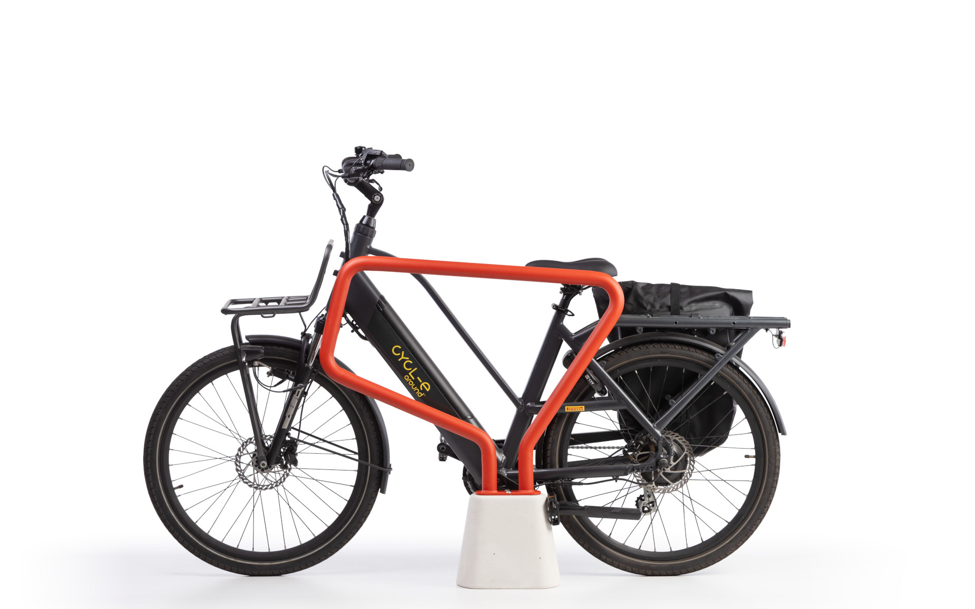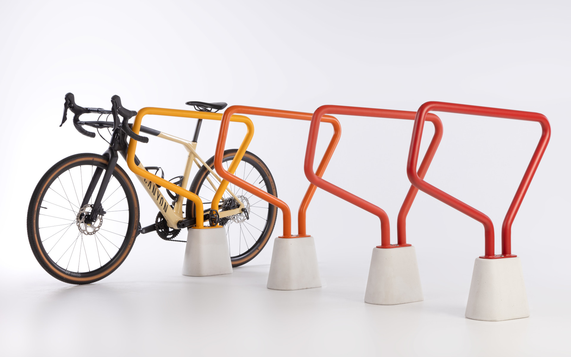 Single bicycle rack consisting of a base in HPC (High Performance Concrete) with a smooth, natural velvet finish, combined with a frame made of painted steel tubing and sheet metal. A solid and functional urban furnishing element, designed to ensure strength, stability, and seamless integration into various public environments.