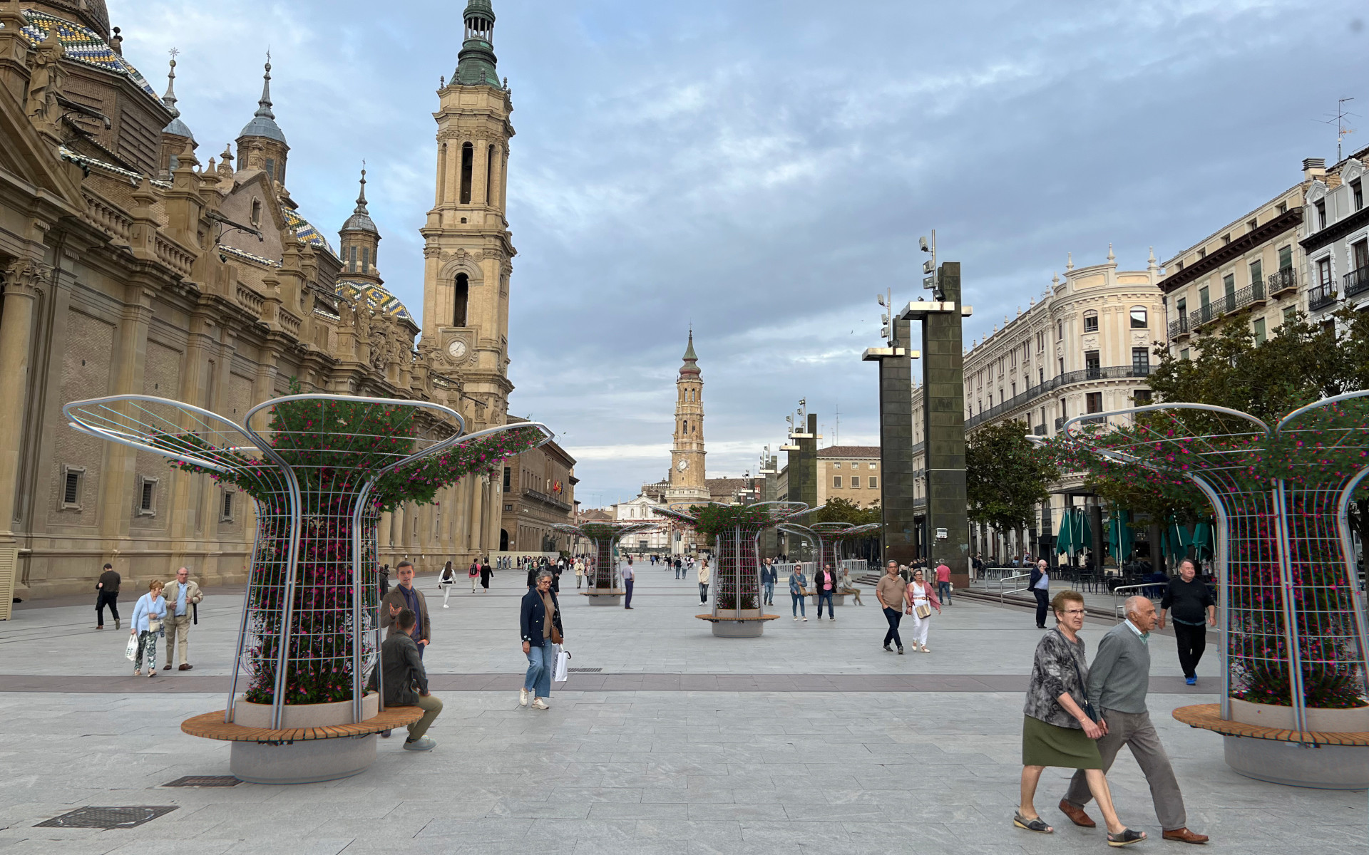 Shading structure consisting of a circular planter in PDM (Reconstituted Stone) Ø1200, which serves as the base for a frame made of tubular and round steel, designed to support climbing plants and greenery. The perimeter frame also incorporates a comfortable seat made of hardwood slats, combining vegetation support and urban furniture in a single, integrated solution.