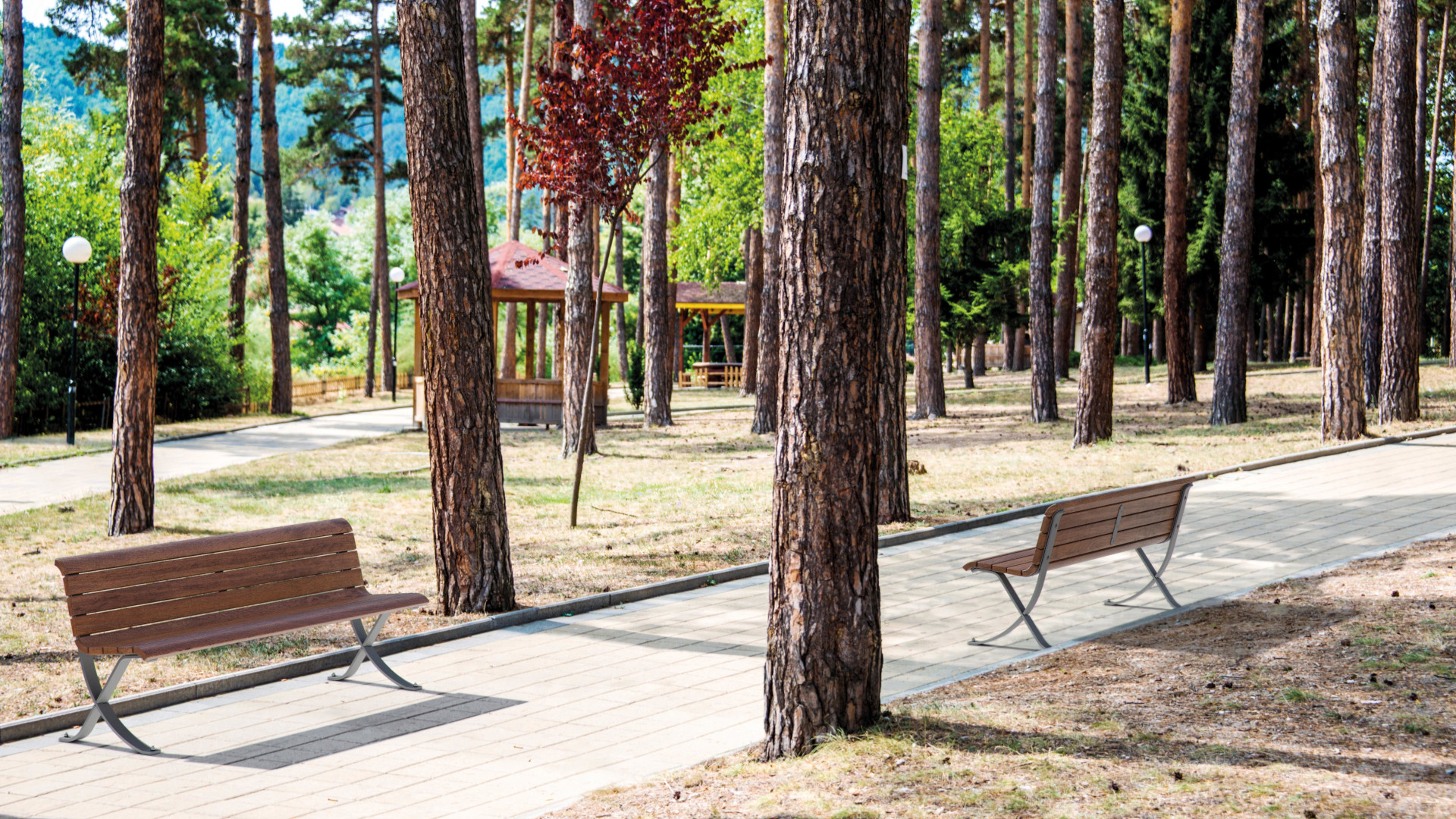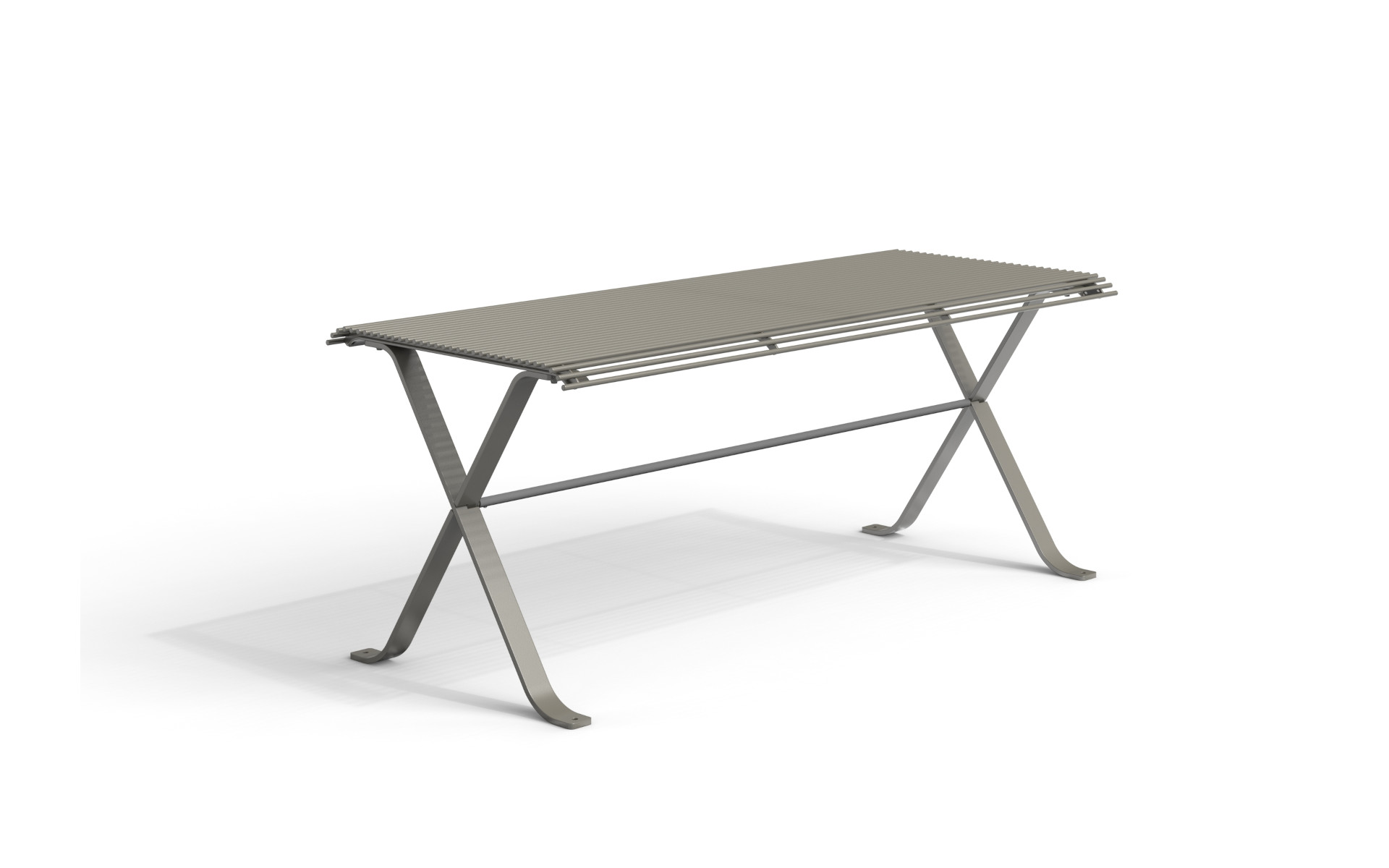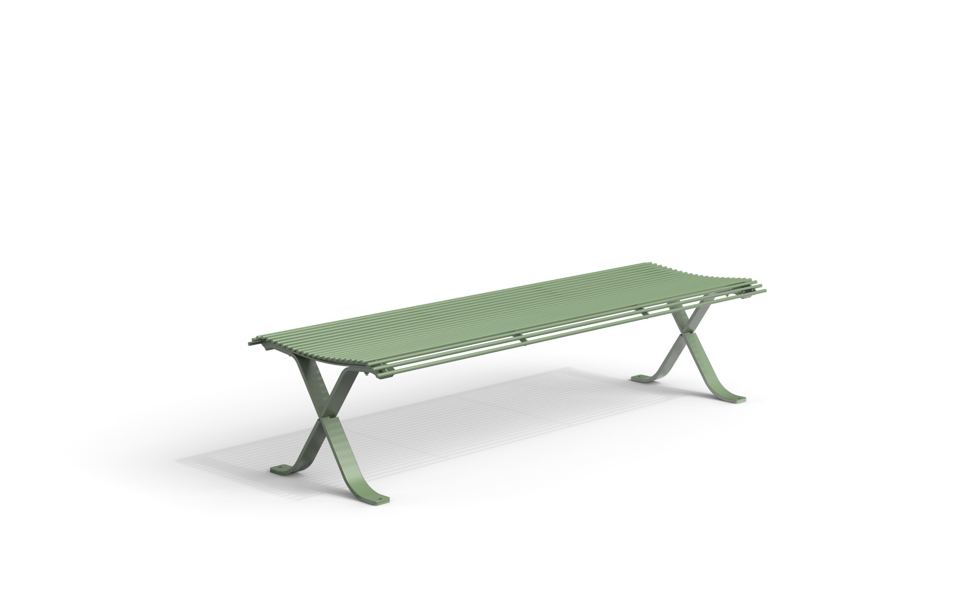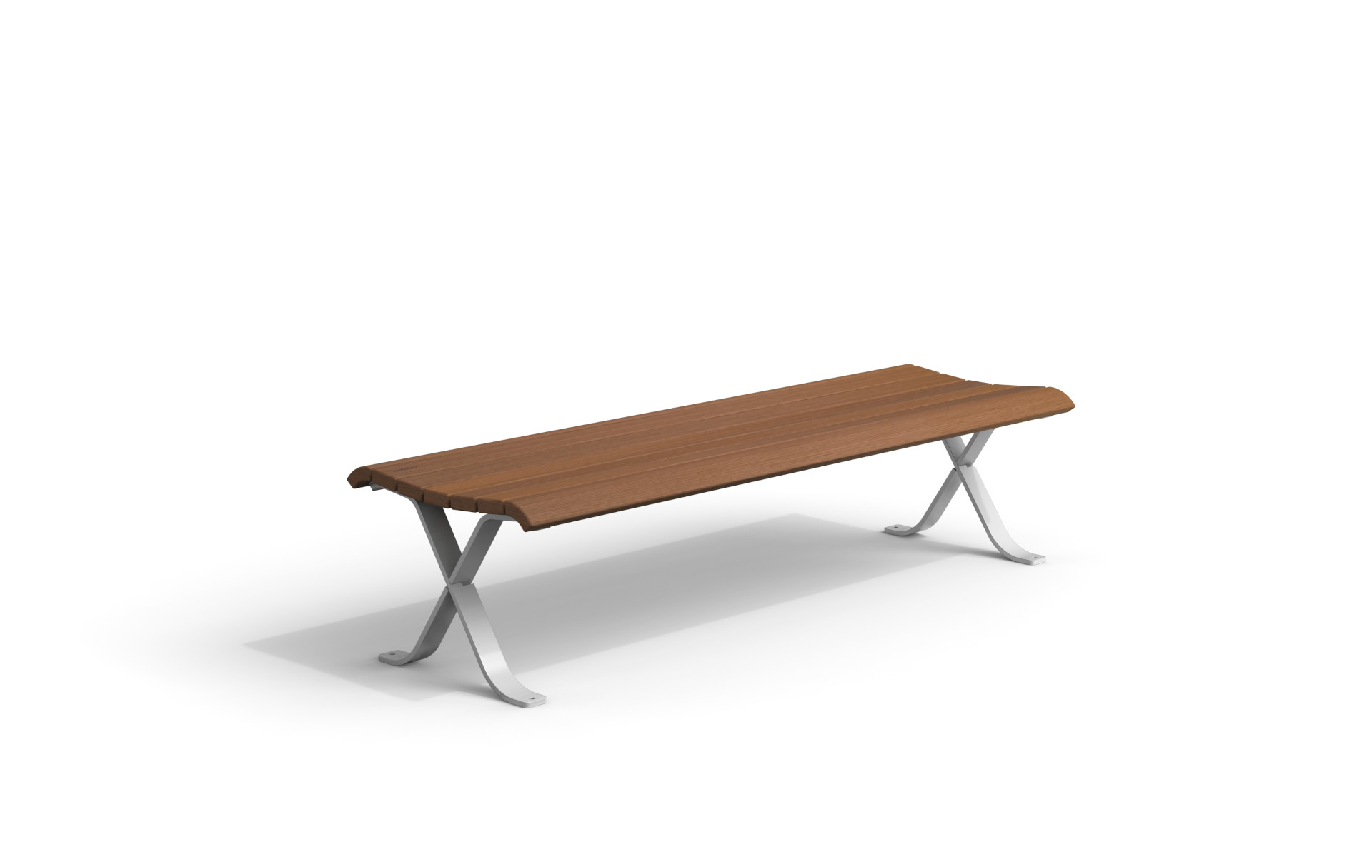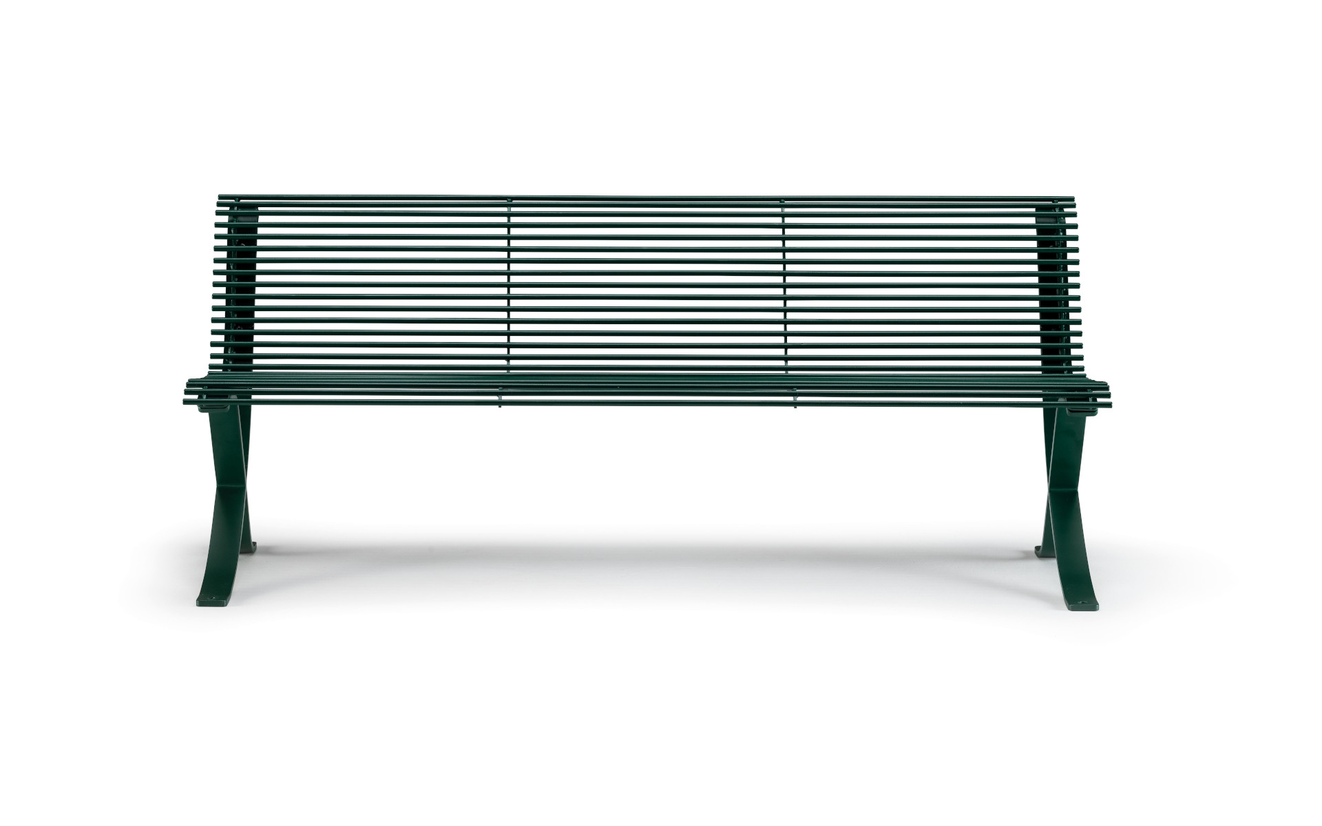 Collection of benches with backrest and seat in hardwood or steel rods, featuring two cross supports in steel plate. Available in two sizes, this bench combines aesthetics and strength, perfectly fitting public and urban spaces. Its solid structure and elegant design make it ideal for any environment, ensuring durability and comfort.