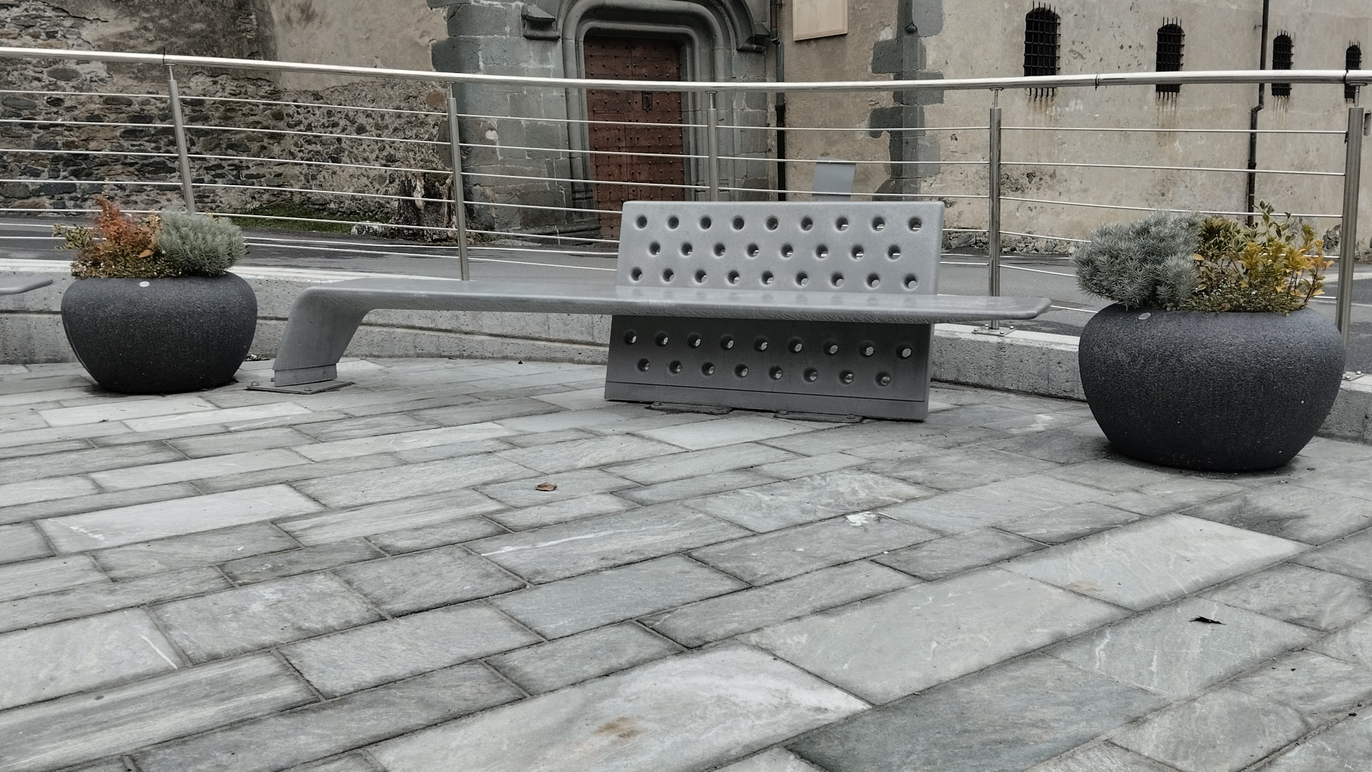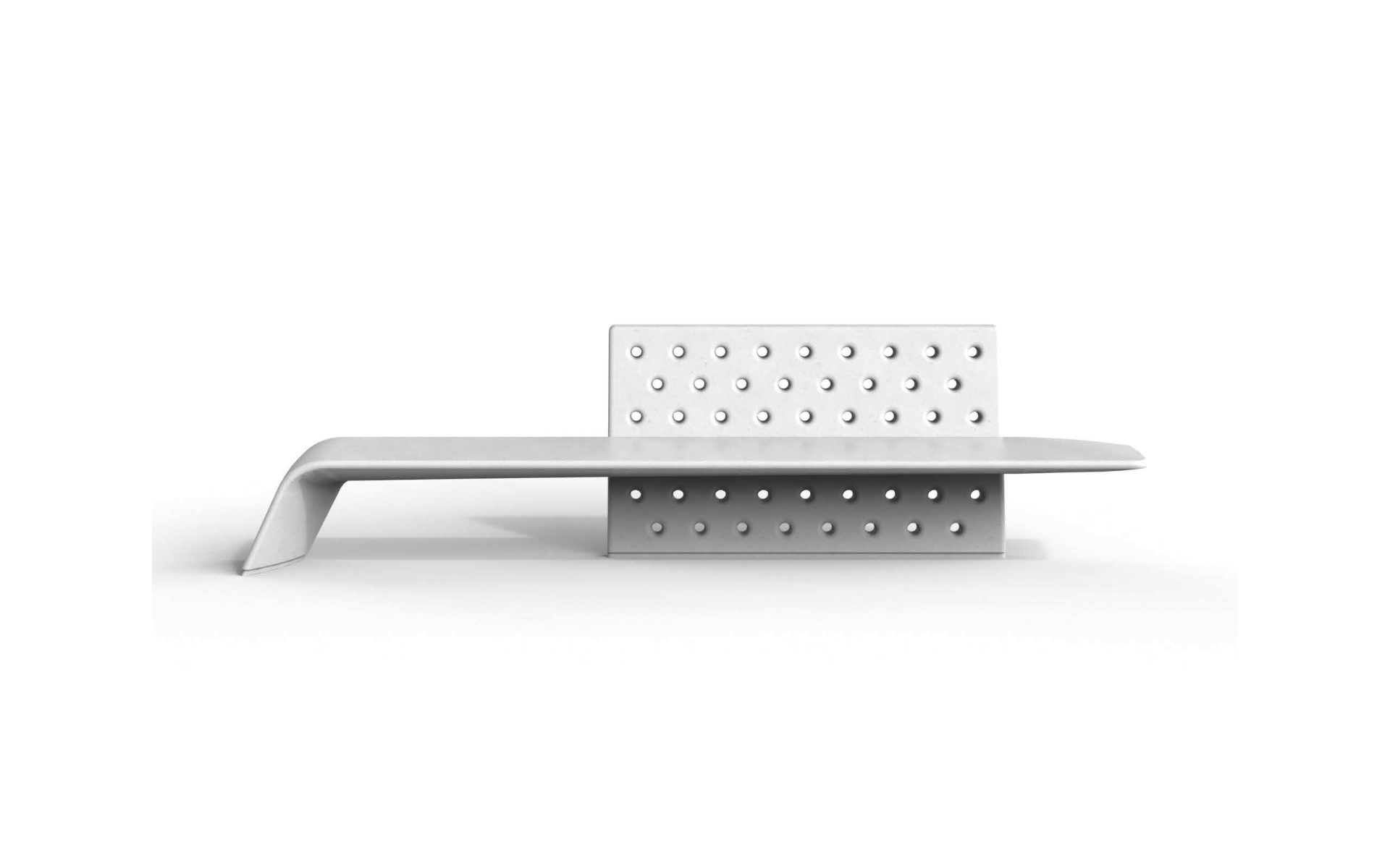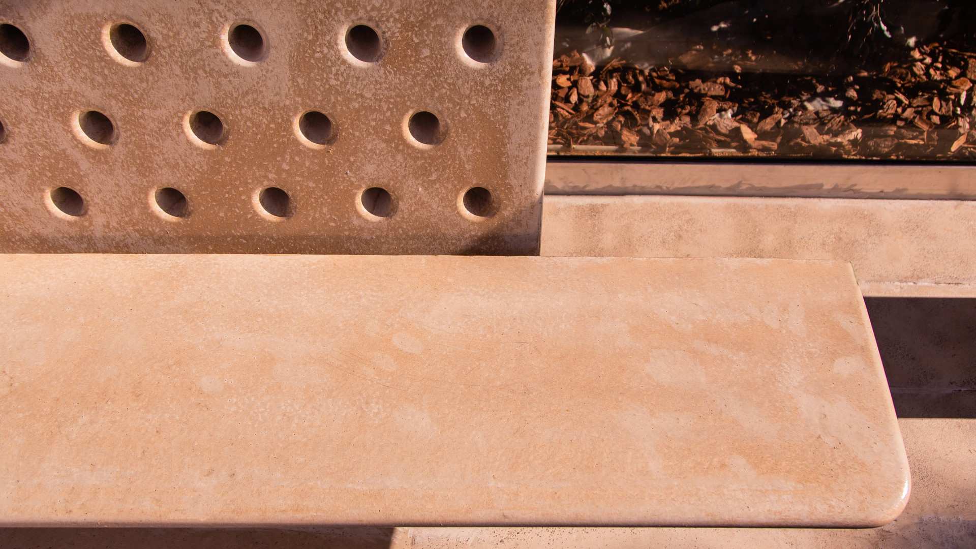 The cantilever bench in HPC (High Performance Concrete) features a backrest made of steel sheet coated in wood, or a monolithic backrest decorated with holes, occupying half of the seating area. This innovative design blends aesthetics and functionality, making it ideal for modern public and urban spaces where durability and comfort are essential.