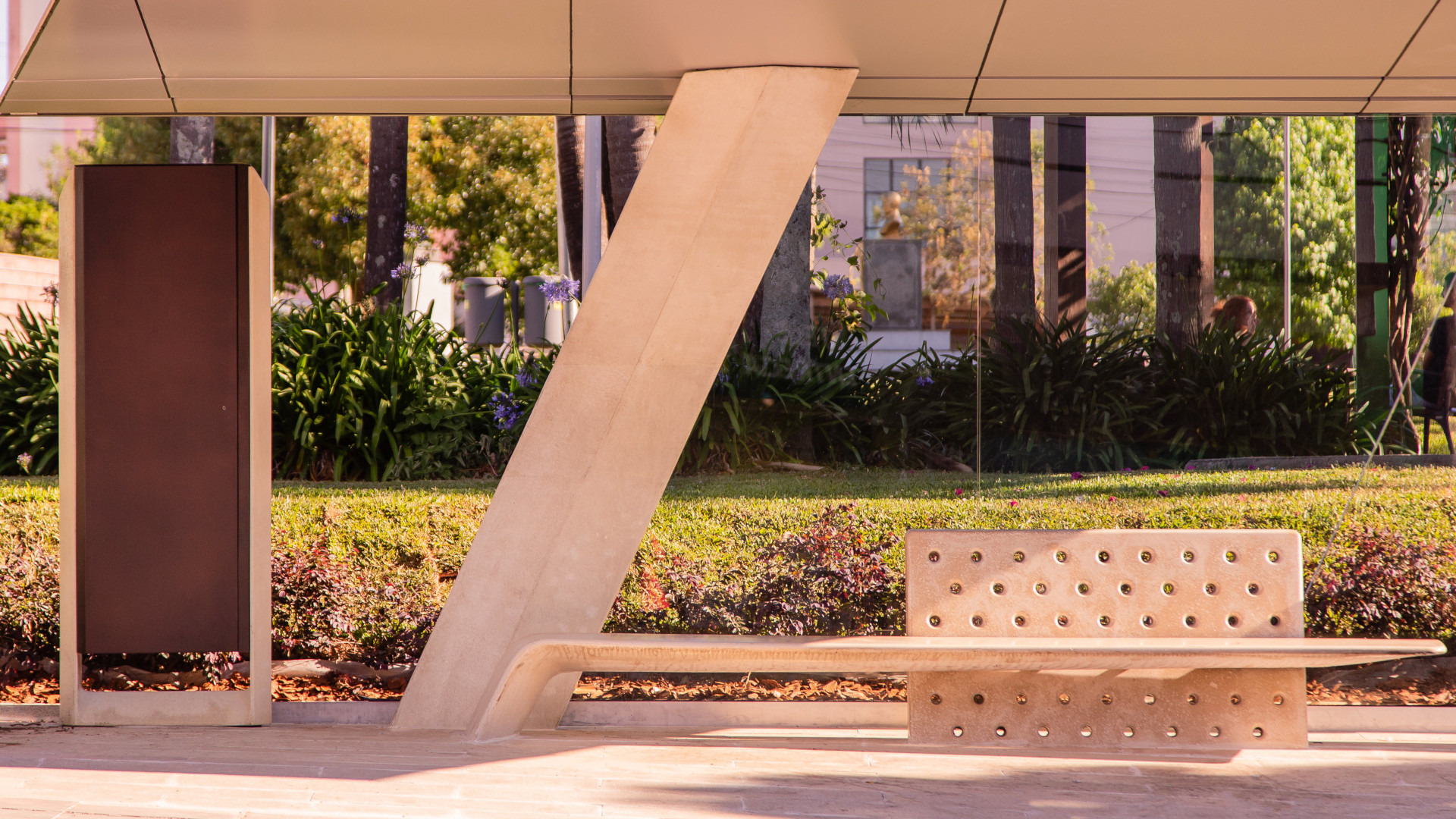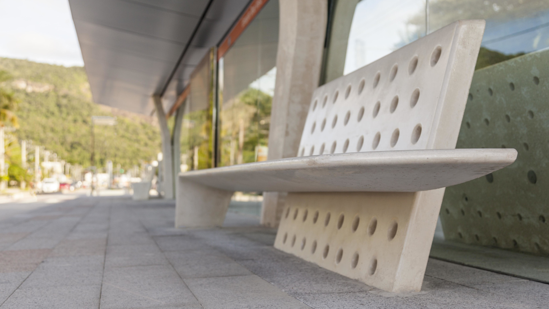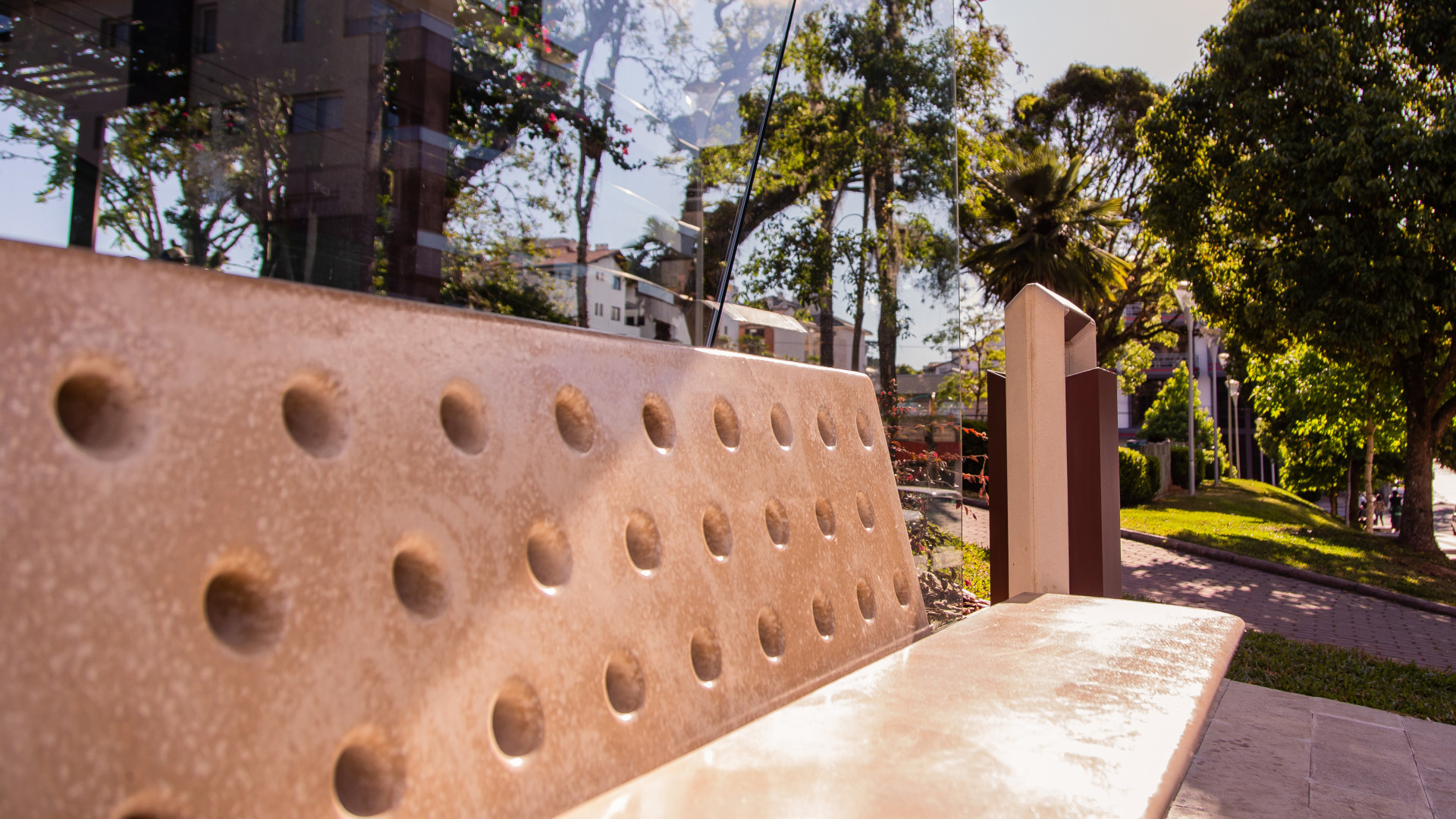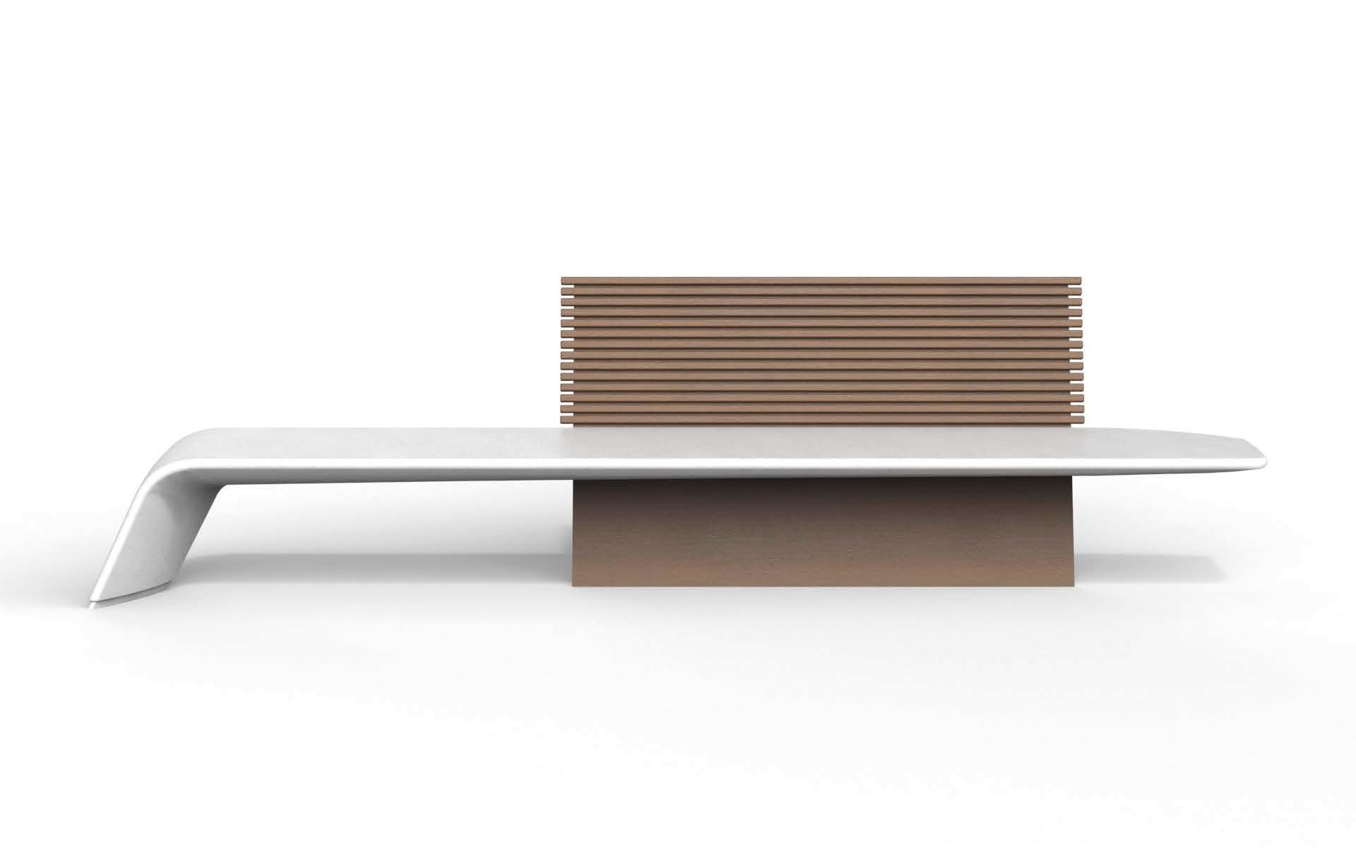 The cantilever bench in HPC (High Performance Concrete) features a backrest made of steel sheet coated in wood, or a monolithic backrest decorated with holes, occupying half of the seating area. This innovative design blends aesthetics and functionality, making it ideal for modern public and urban spaces where durability and comfort are essential.