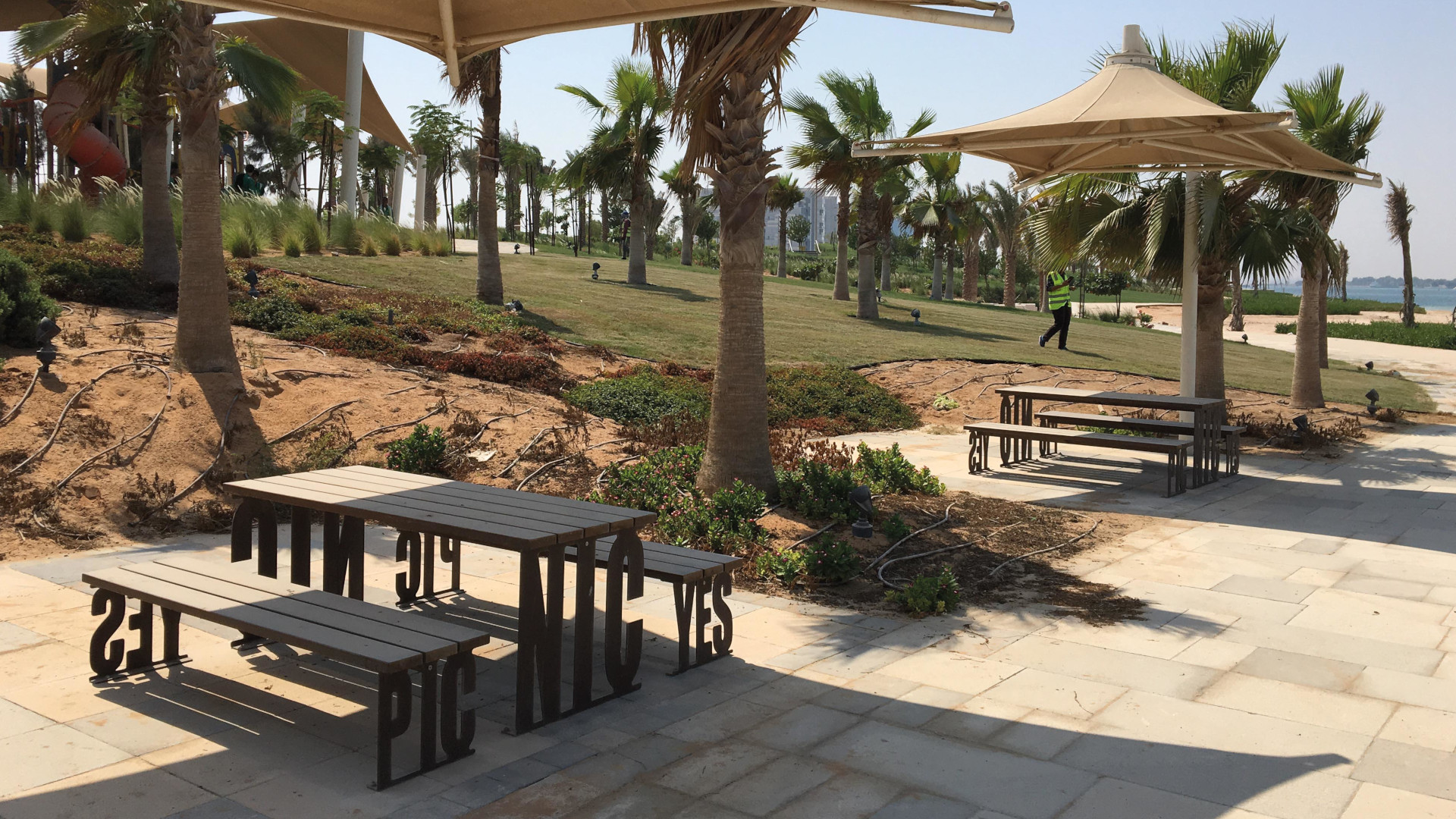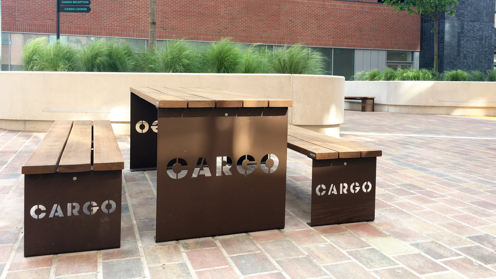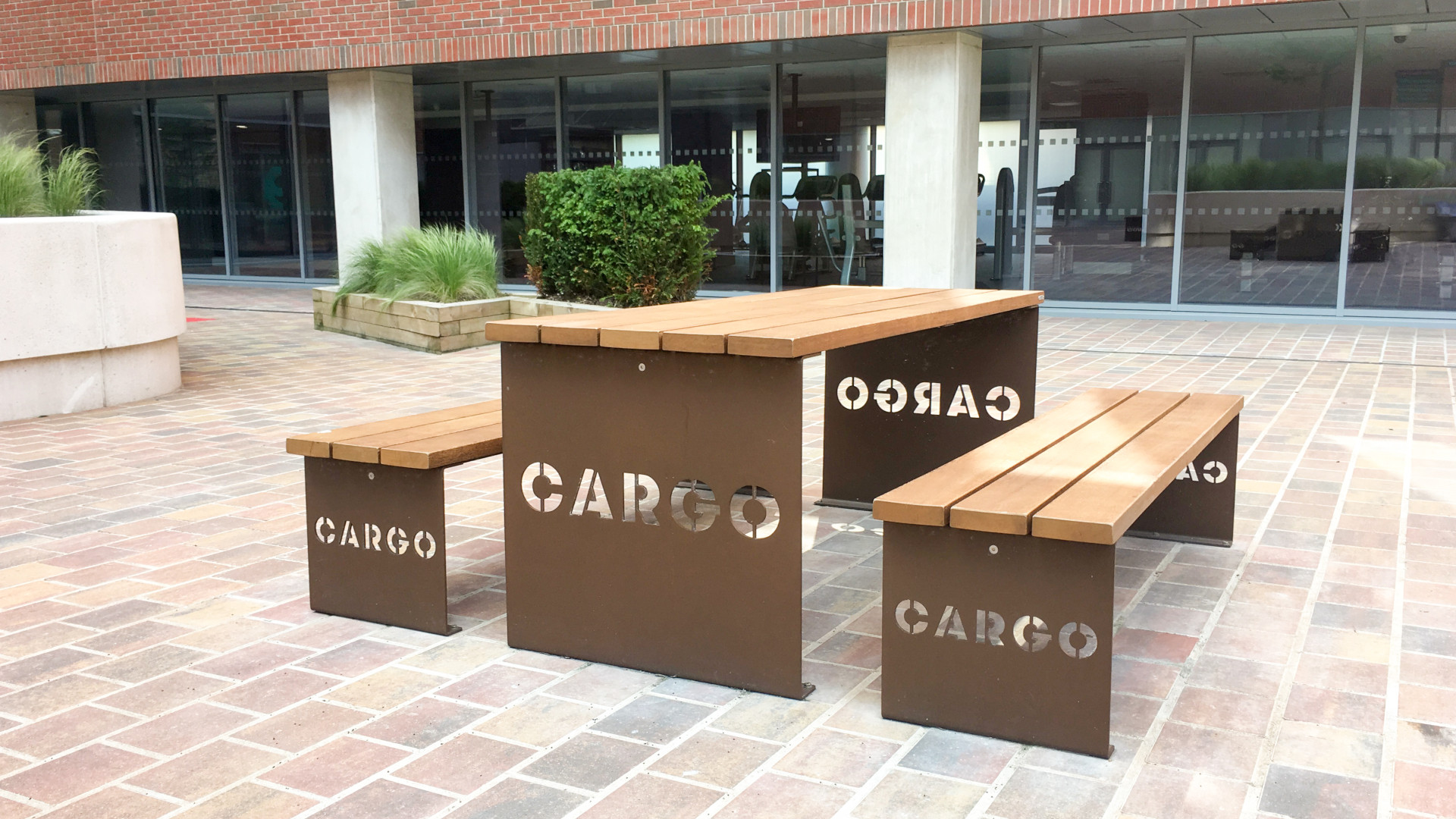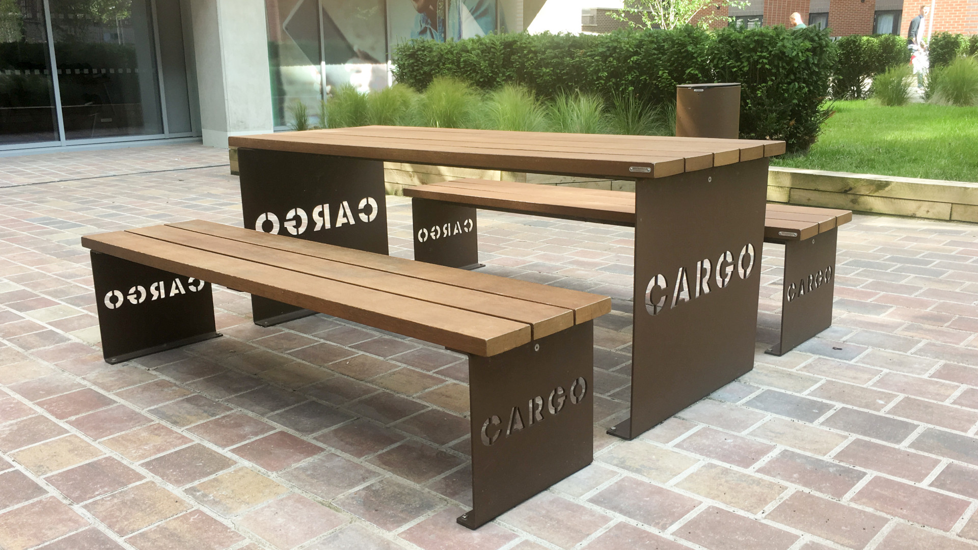 Picnic table with matching seating, featuring two laser-cut and decorated steel supports, and a durable wooden tabletop. The benches, without backrests, are made of two laser-cut and decorated steel supports and a wooden seat. An ideal solution for public spaces and outdoor areas, combining functional design and aesthetic appeal.
