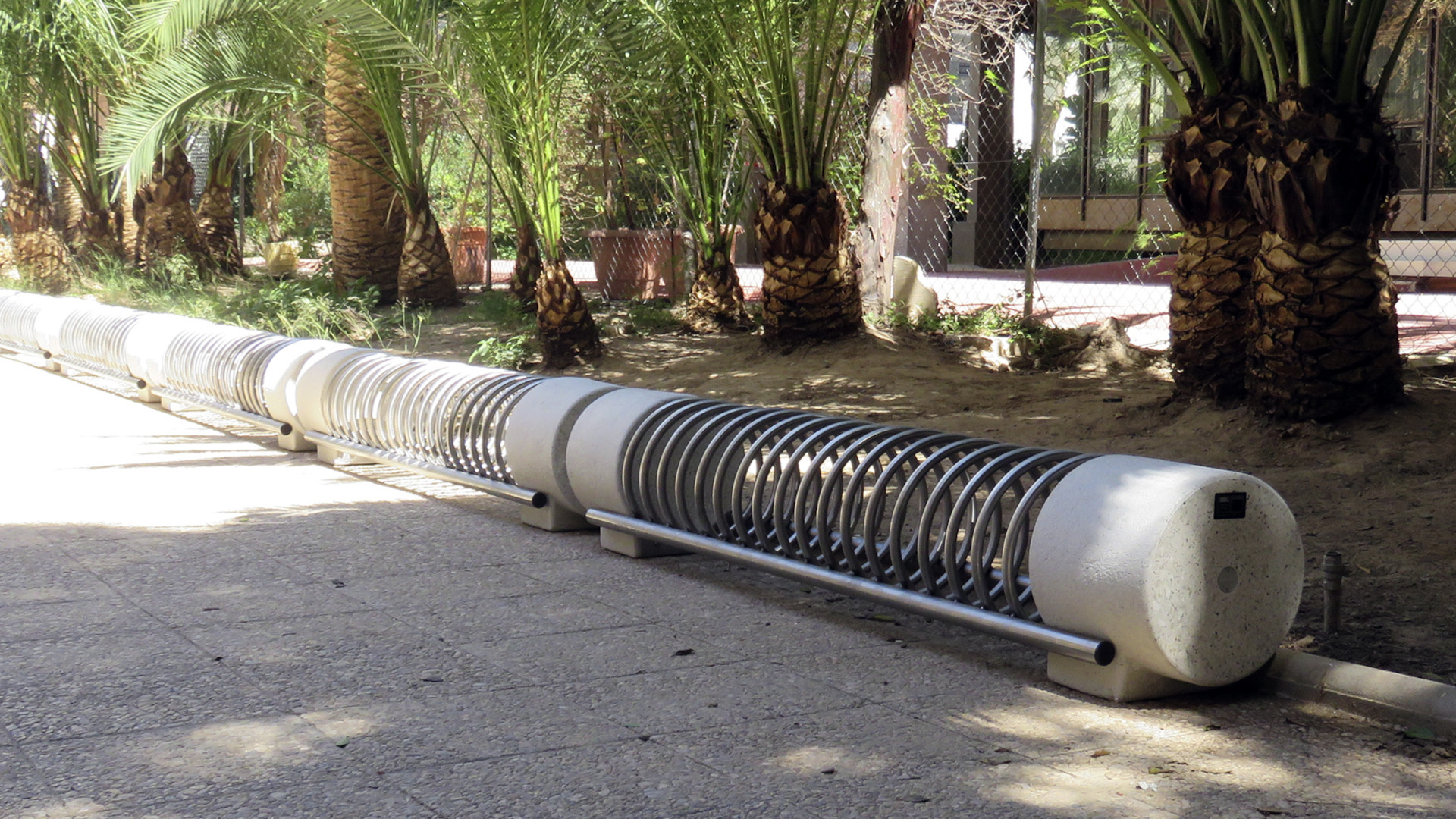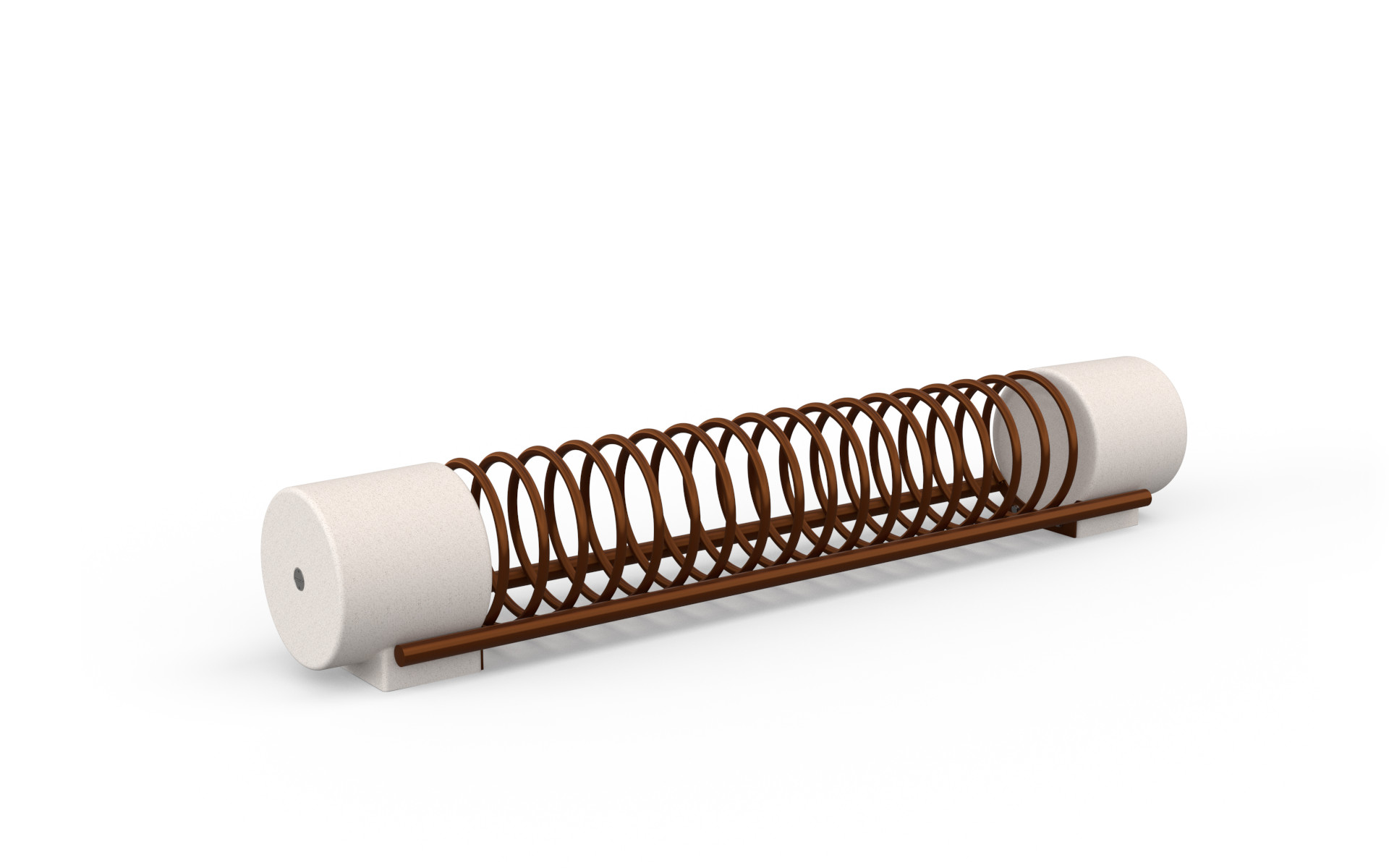 Bicycle rack made of steel tubing, consisting of a continuous spiral connected to two horizontal tubes. The metal structure is fixed to lateral bases in PDM (Reconstituted Stone).