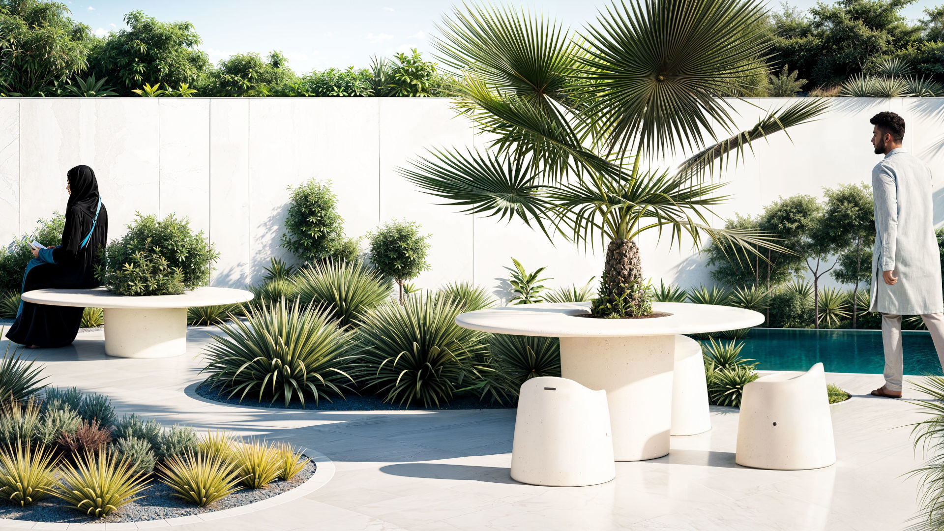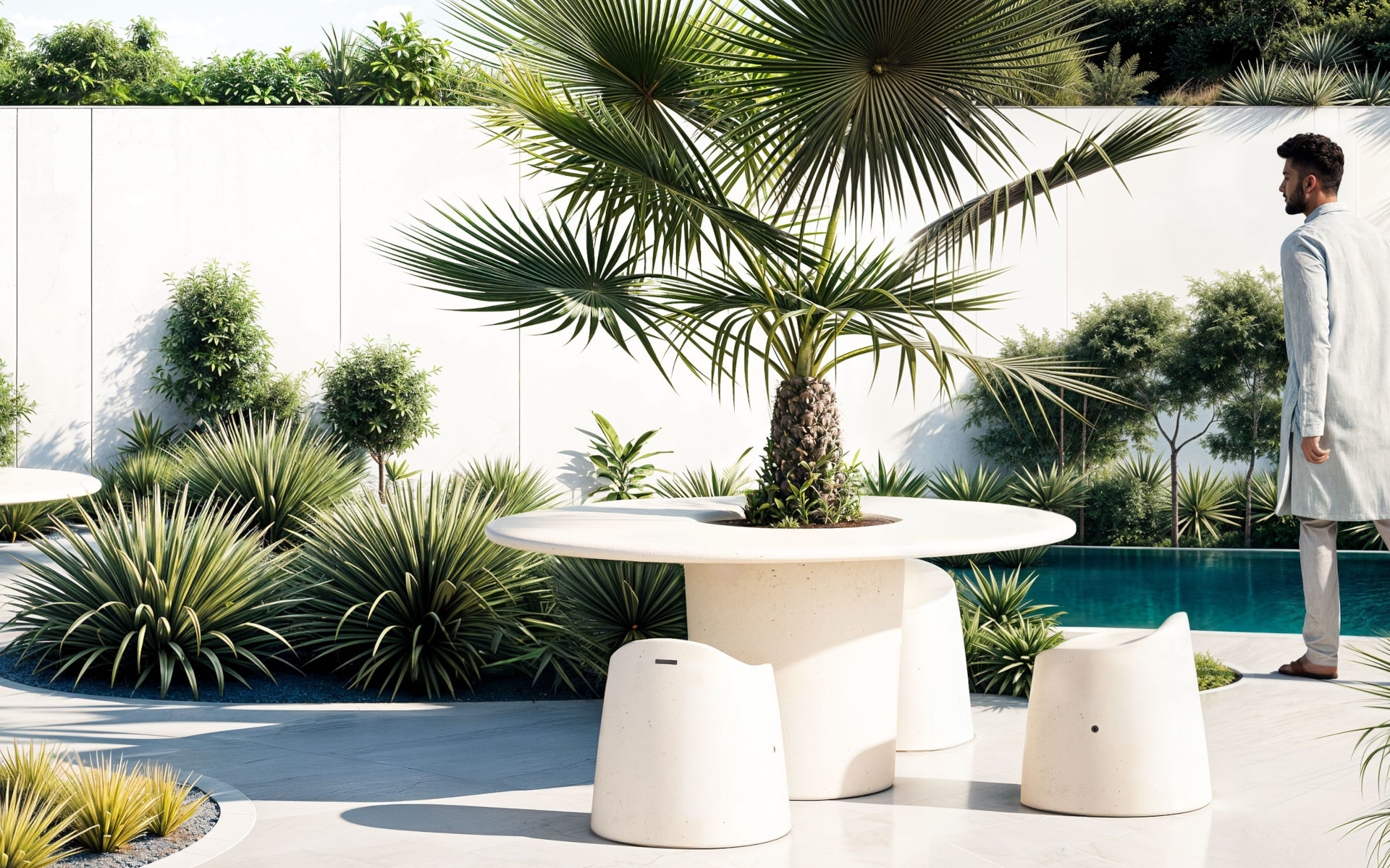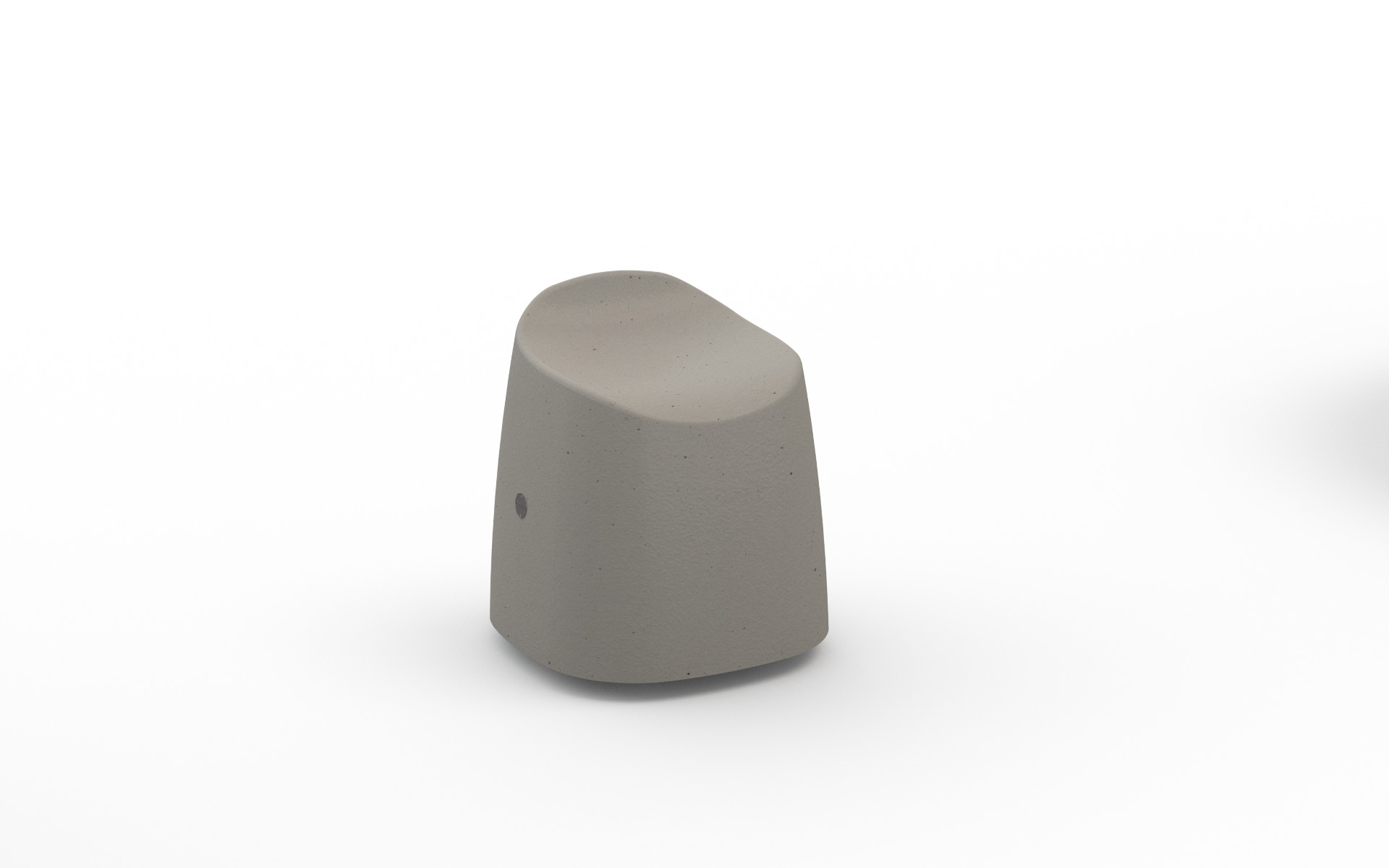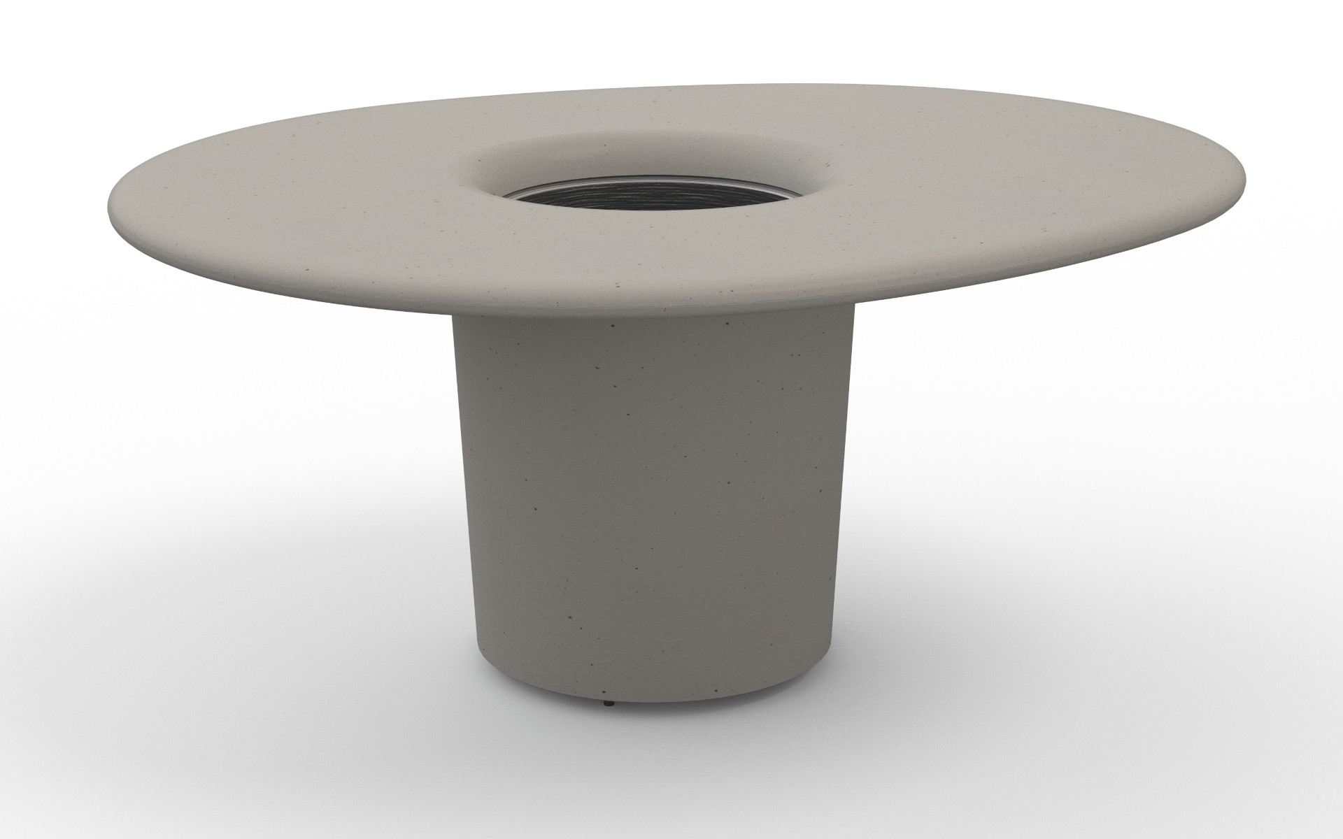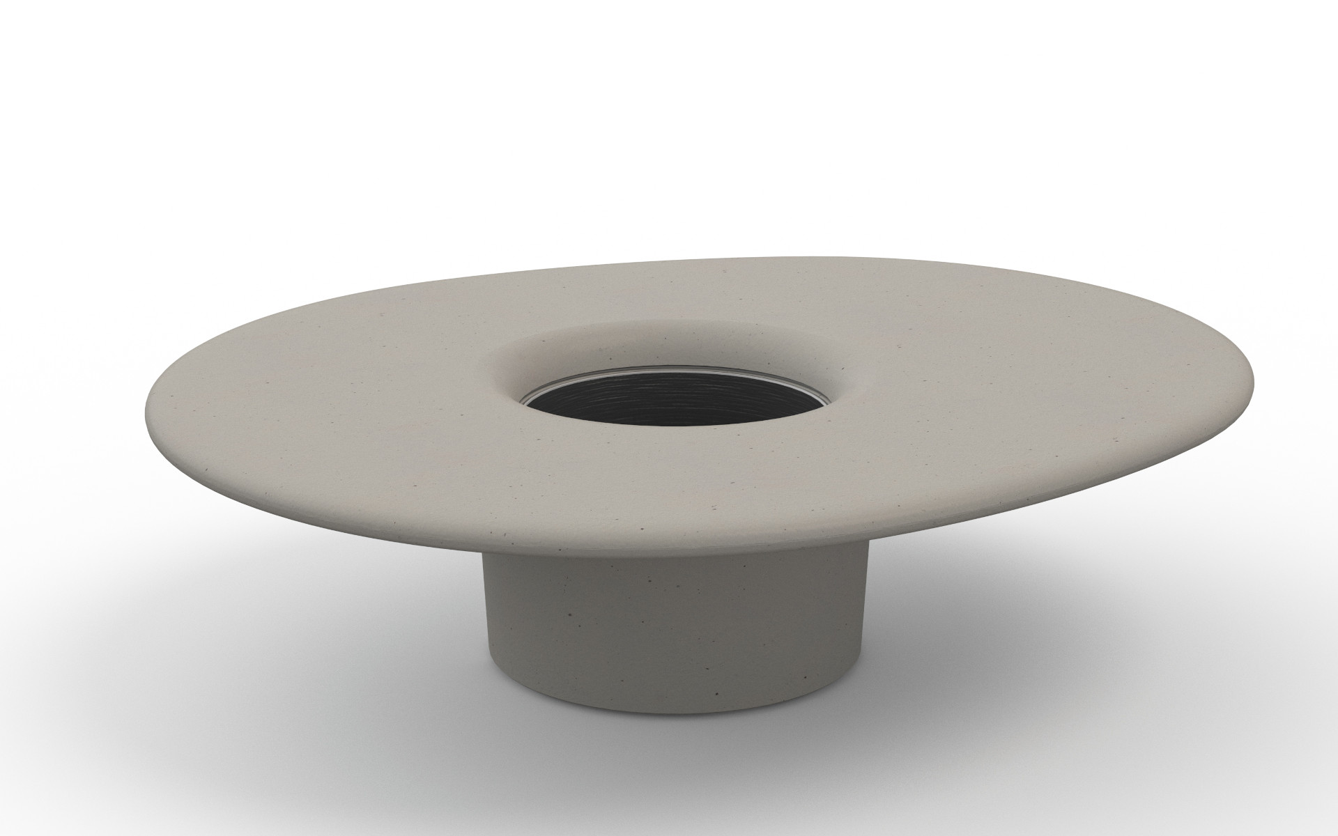 The collection includes a stool and table, available in high or low versions, both crafted from a single shaped monolith of HPC (High Performance Concrete) with a smooth, natural velvet finish. The table features a functional design with a conical central support holding a tabletop that includes a central hole, securely fixed with a steel sheet disc. Completing the set is a circular planter made of powder coated steel sheet, adding a touch of urban greenery and customization to public spaces.
