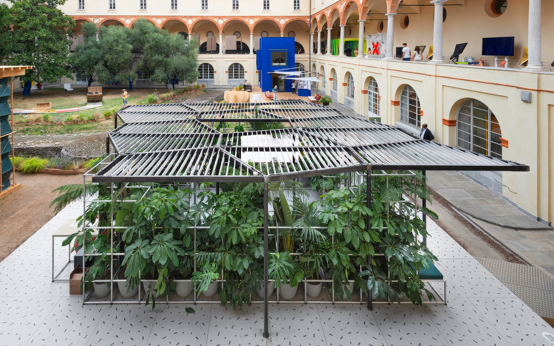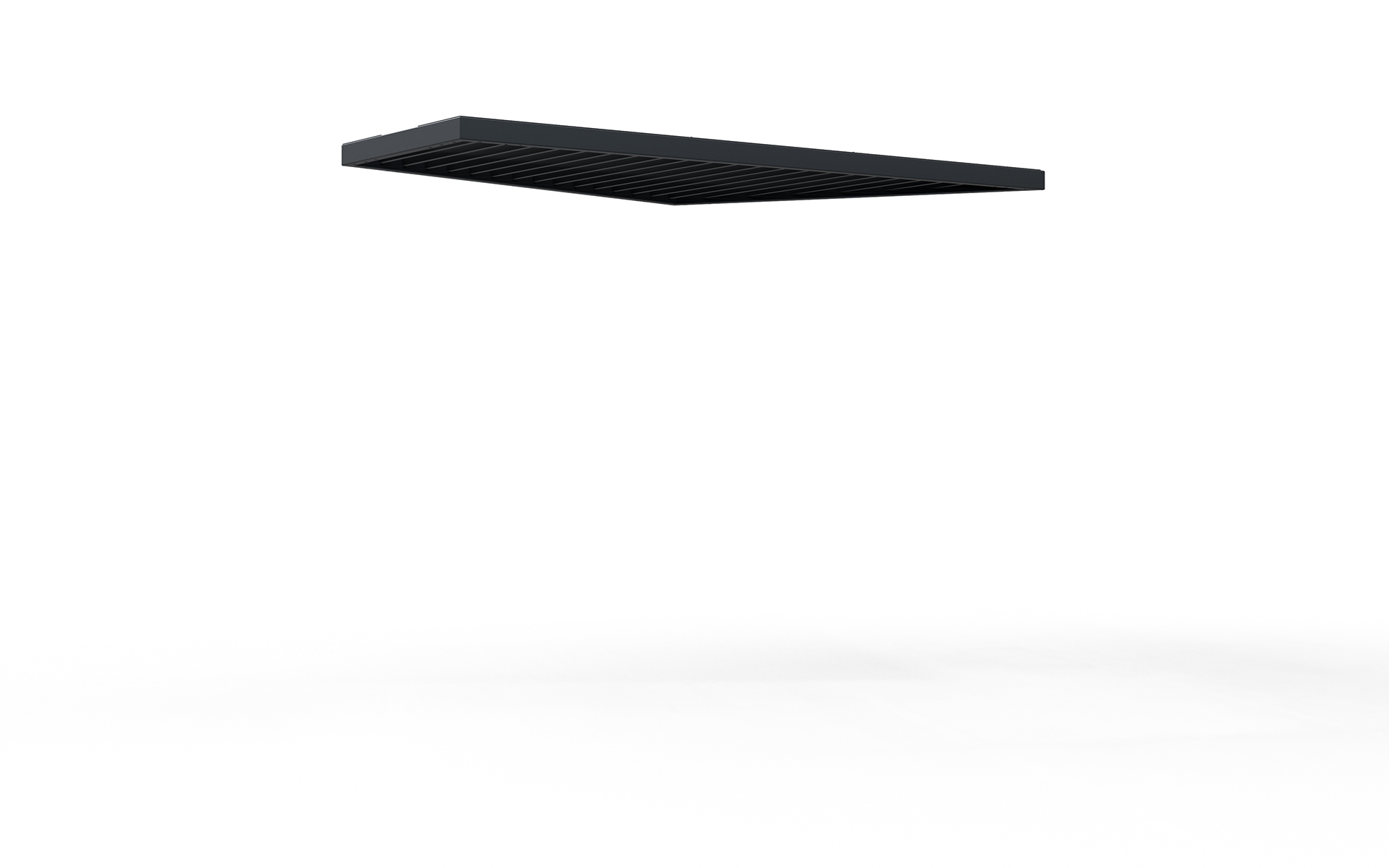 Modular shading structure consisting of supporting columns and trapezoidal steel frames, with aluminum sunshade profiles. The frames are connected with steel plates. Available in two configurations: linear for pedestrian paths or island. Can be installed individually or in compositions.