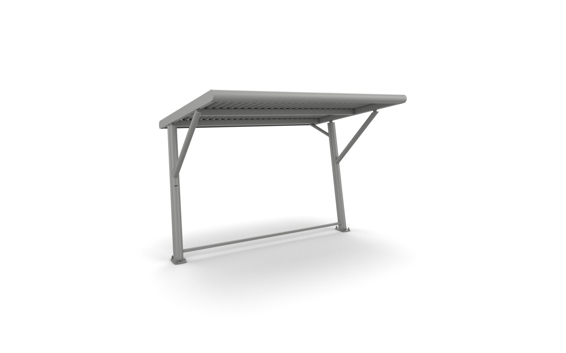 This modular bicycle shelter combines functionality, durability, and design precision, providing an effective and stylish solution for secure bike parking. The load-bearing structure, made of steel, includes an inclined column and a tubular steel brace, both supporting a frame with a corrugated metal roof finished with painted aluminum edge profiles. The sloped design allows rainwater to flow directly into an integrated aluminum channel, ensuring optimal drainage. For enhanced comfort and usability, the shelter can be equipped with a perforated metal ceiling and an integrated LED lighting system, making it safe and welcoming even after dark.