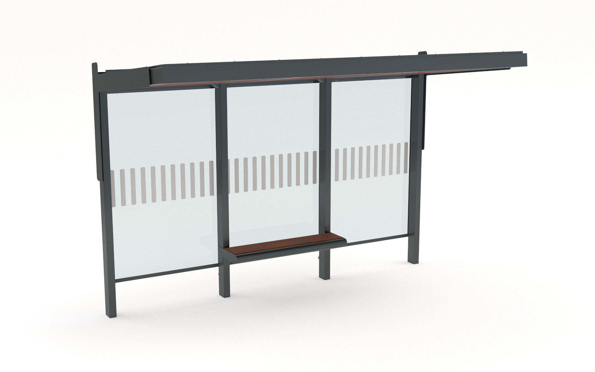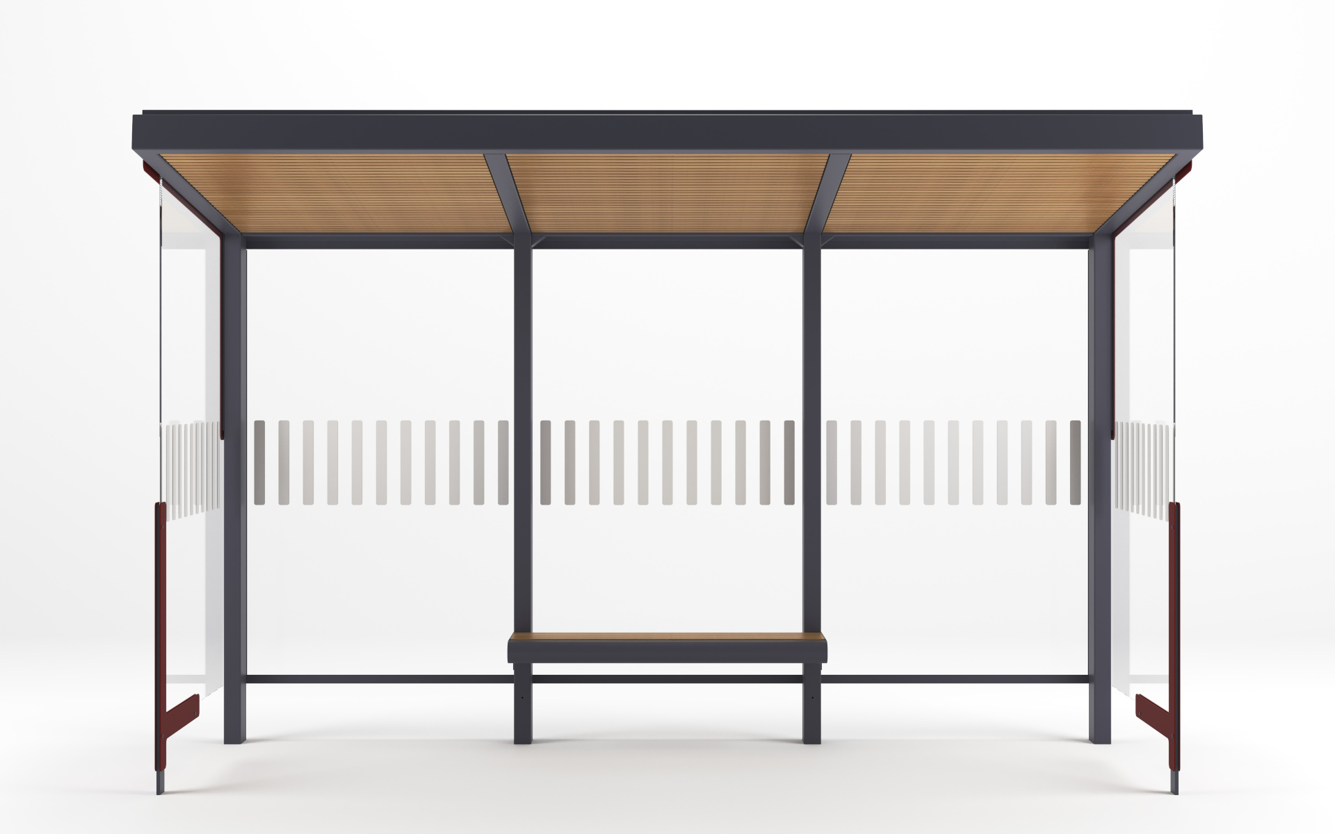 Each shelter includes one or two integrated backless benches, with a steel frame and wooden seating. Optional accessories include a side wall and integrated LED lighting, ensuring safe and comfortable use even in low-light conditions.