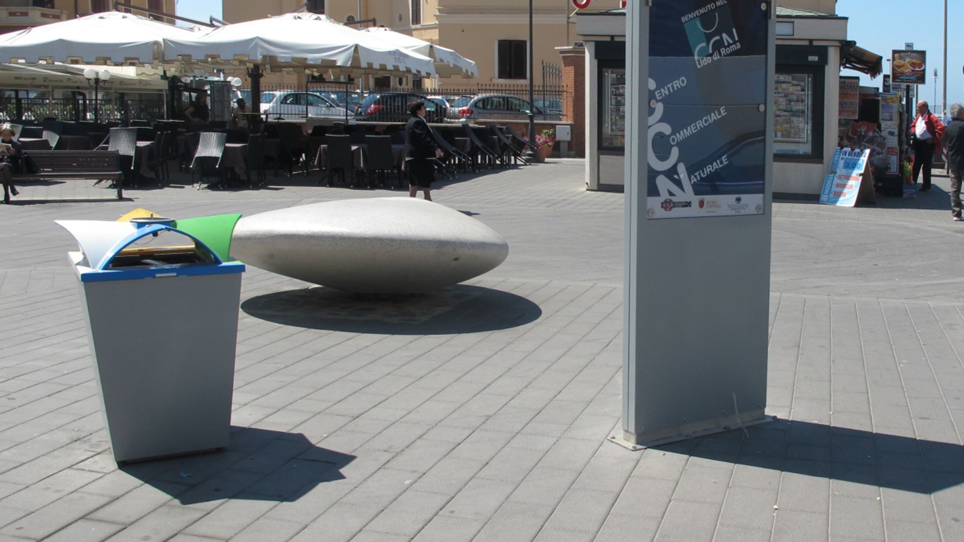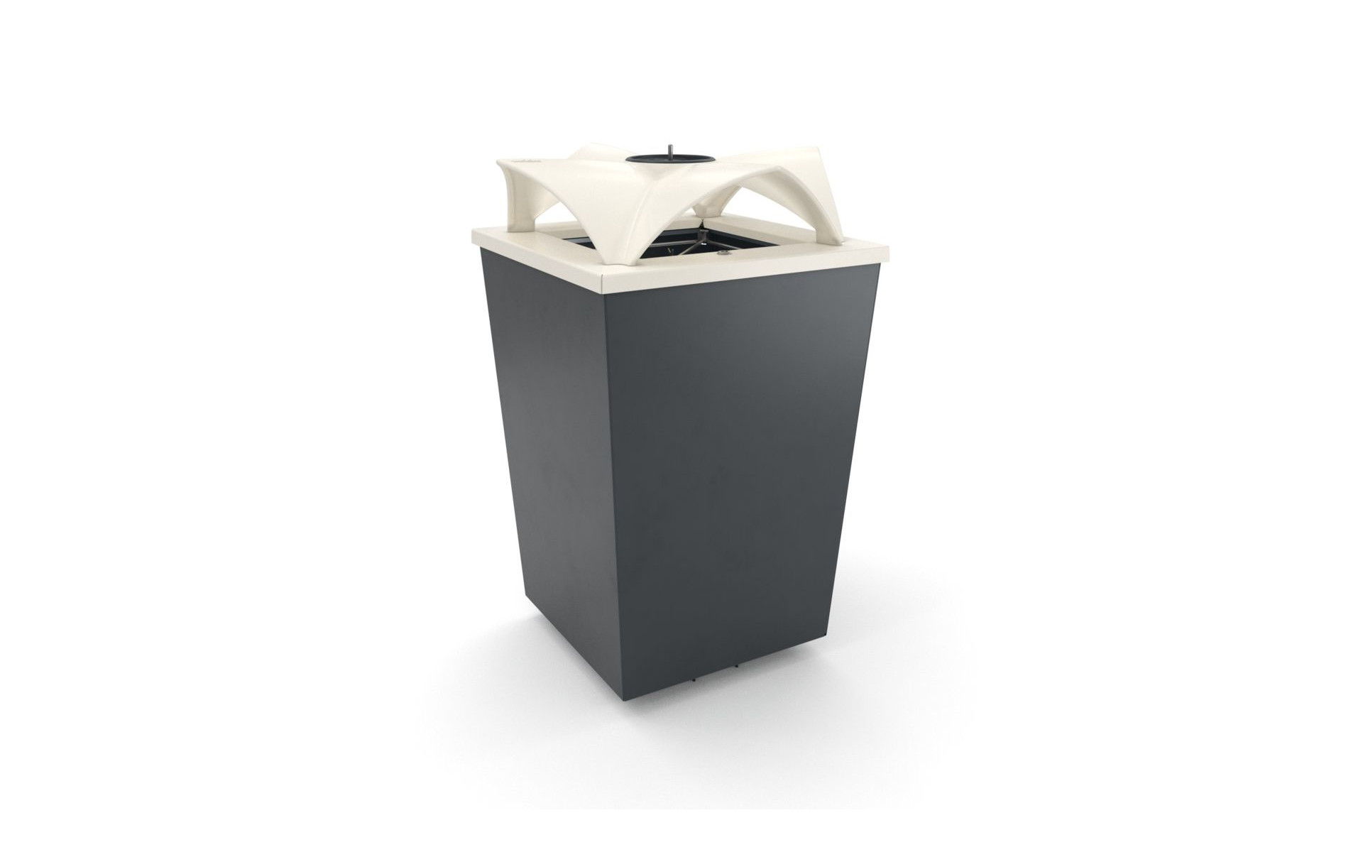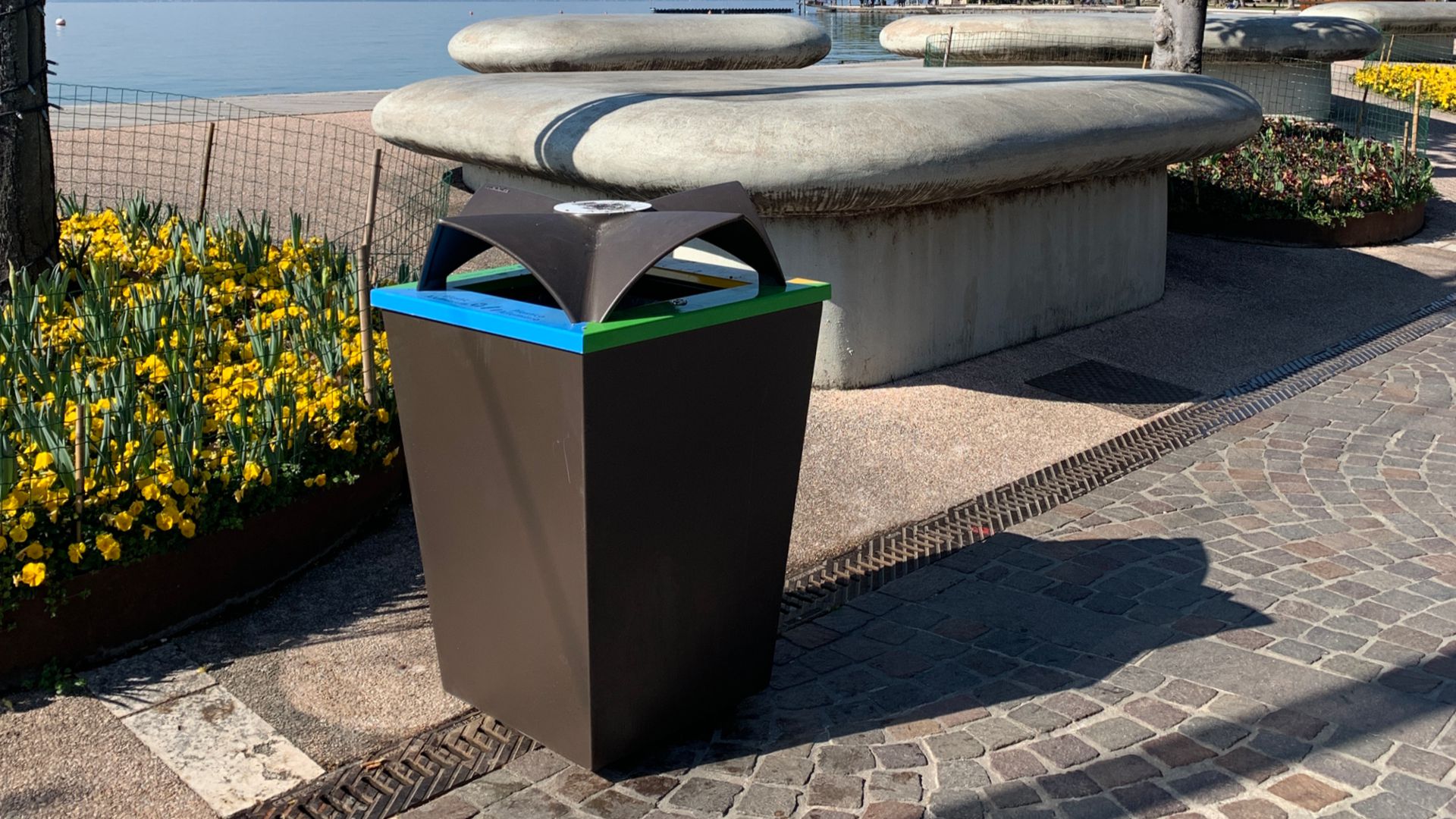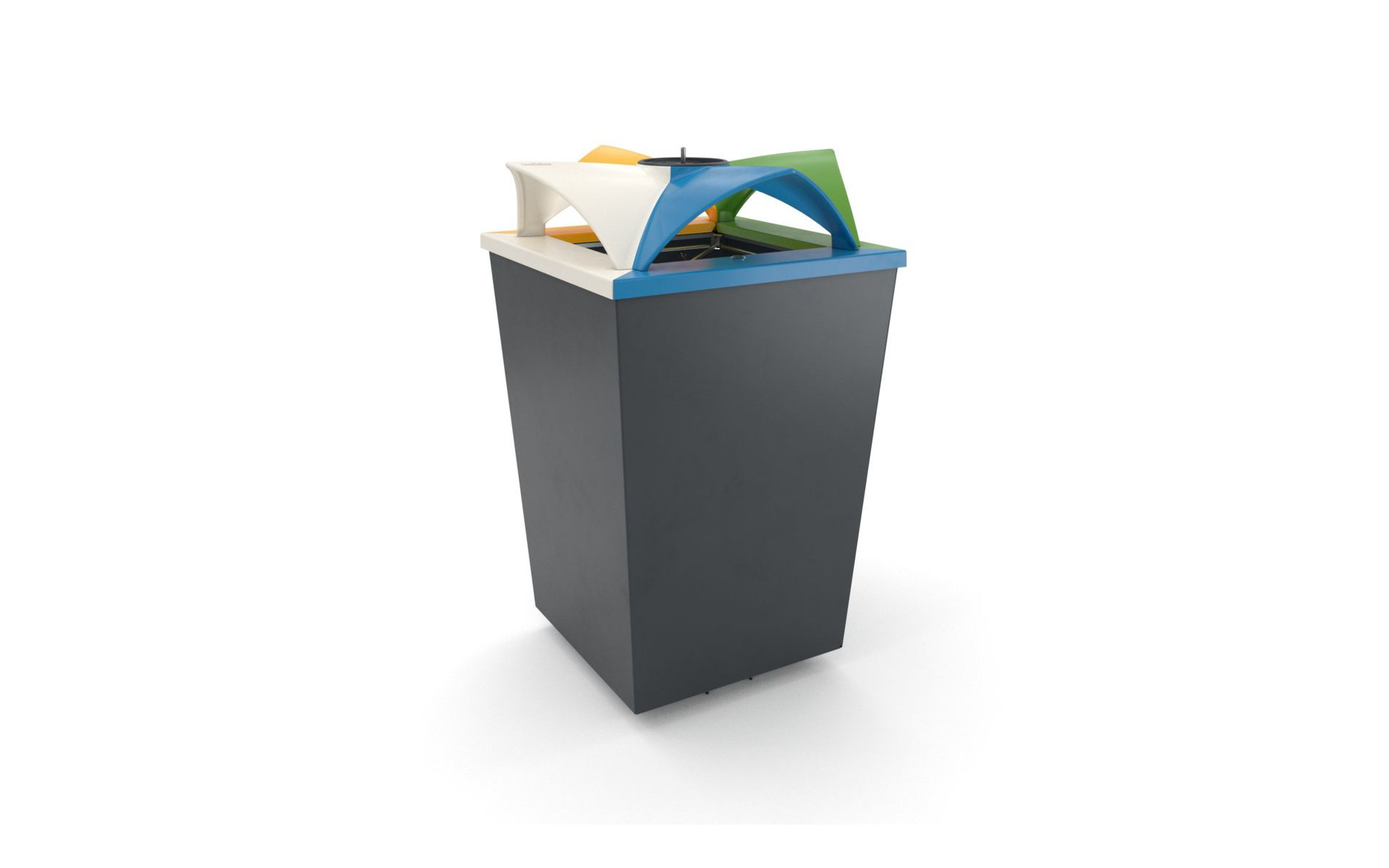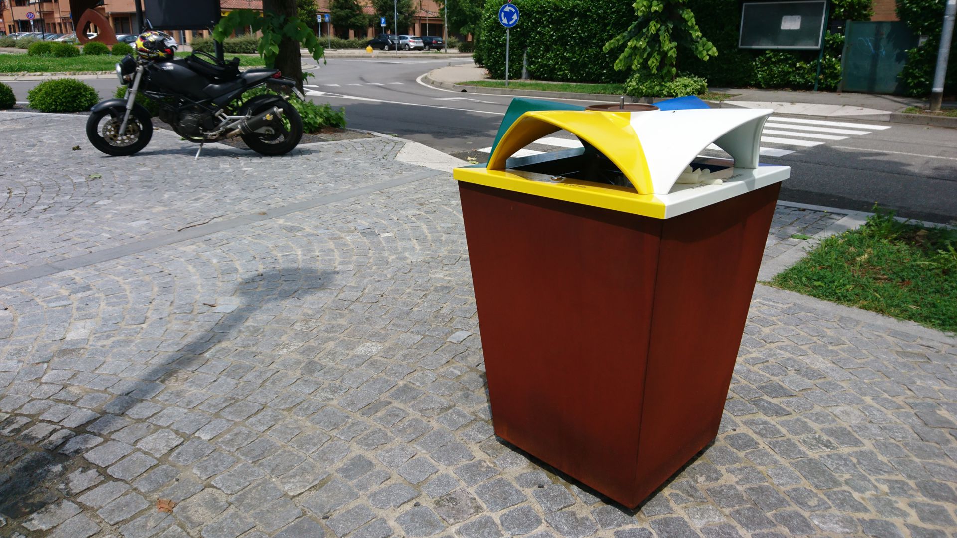 The waste bin, with a truncated pyramid shape, is made of painted steel, Inox, or Corten sheet metal and features a rainproof cover in cast aluminum with a lock and an integrated ashtray. The cover is available in four different colors for waste separation or in a monochromatic version. The bin includes sack rings along the inner perimeter, ensuring practicality and durability in public spaces.