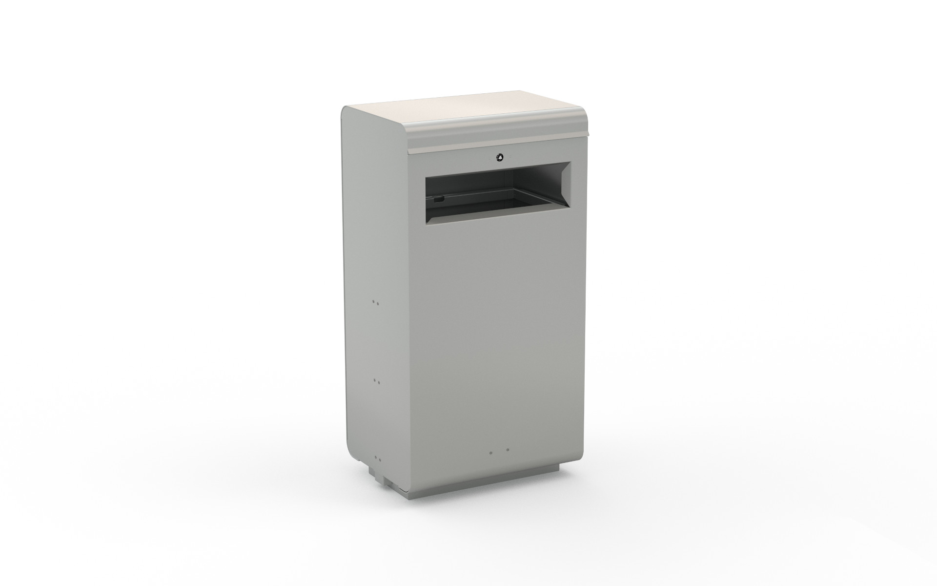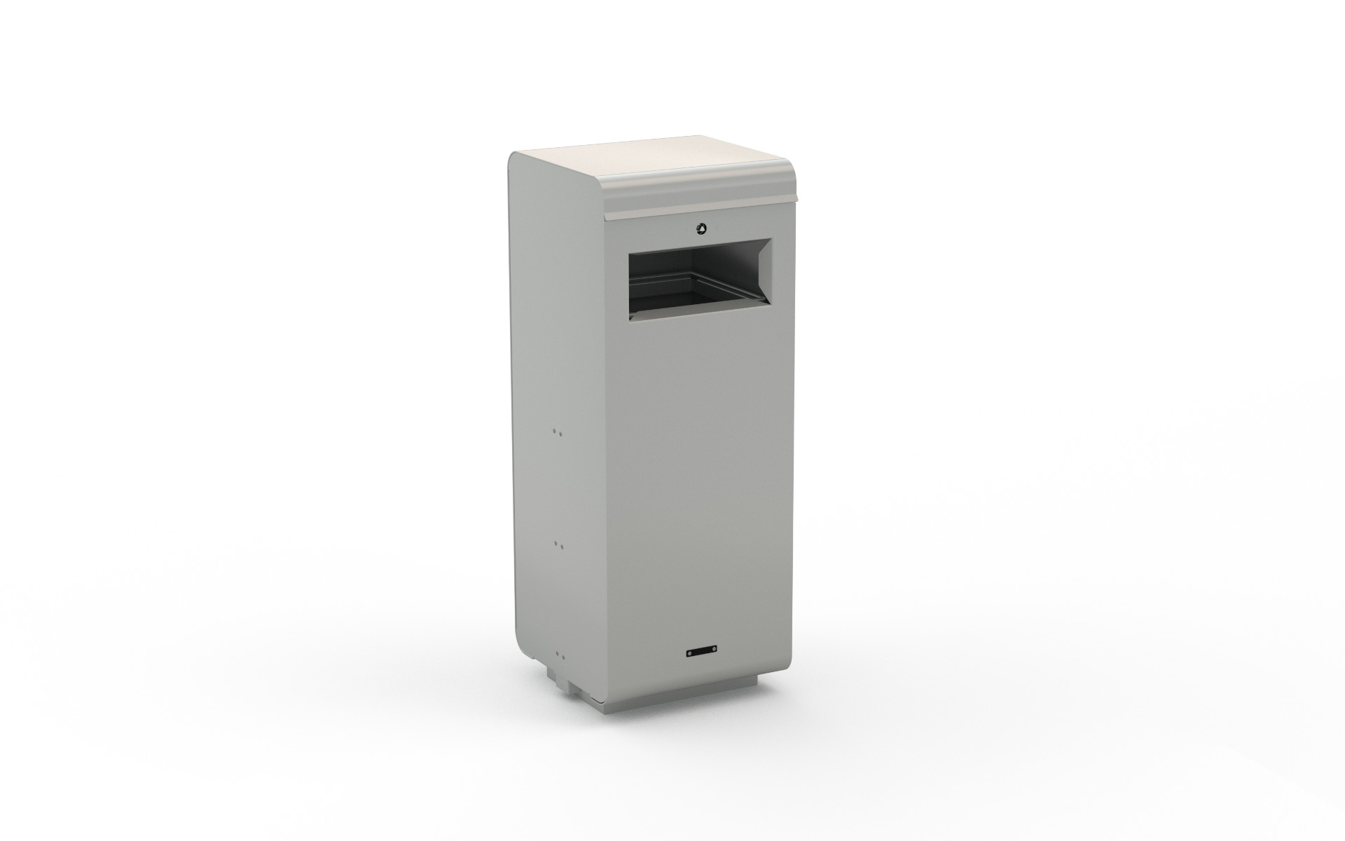 The rectangular waste bin collection features a tubular steel frame, covered with sheet metal and equipped with a rainproof cover. The front door, hinged with gas pistons, is fitted with a sack ring with elastic and a snap lock. Available in two sizes, with or without a top ashtray, these bins can be arranged side by side to create waste separation islands, providing functionality and elegant design for public spaces.