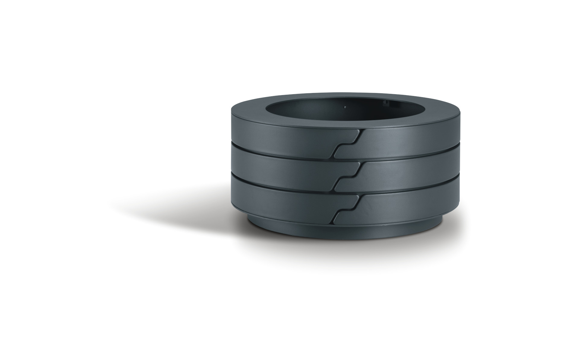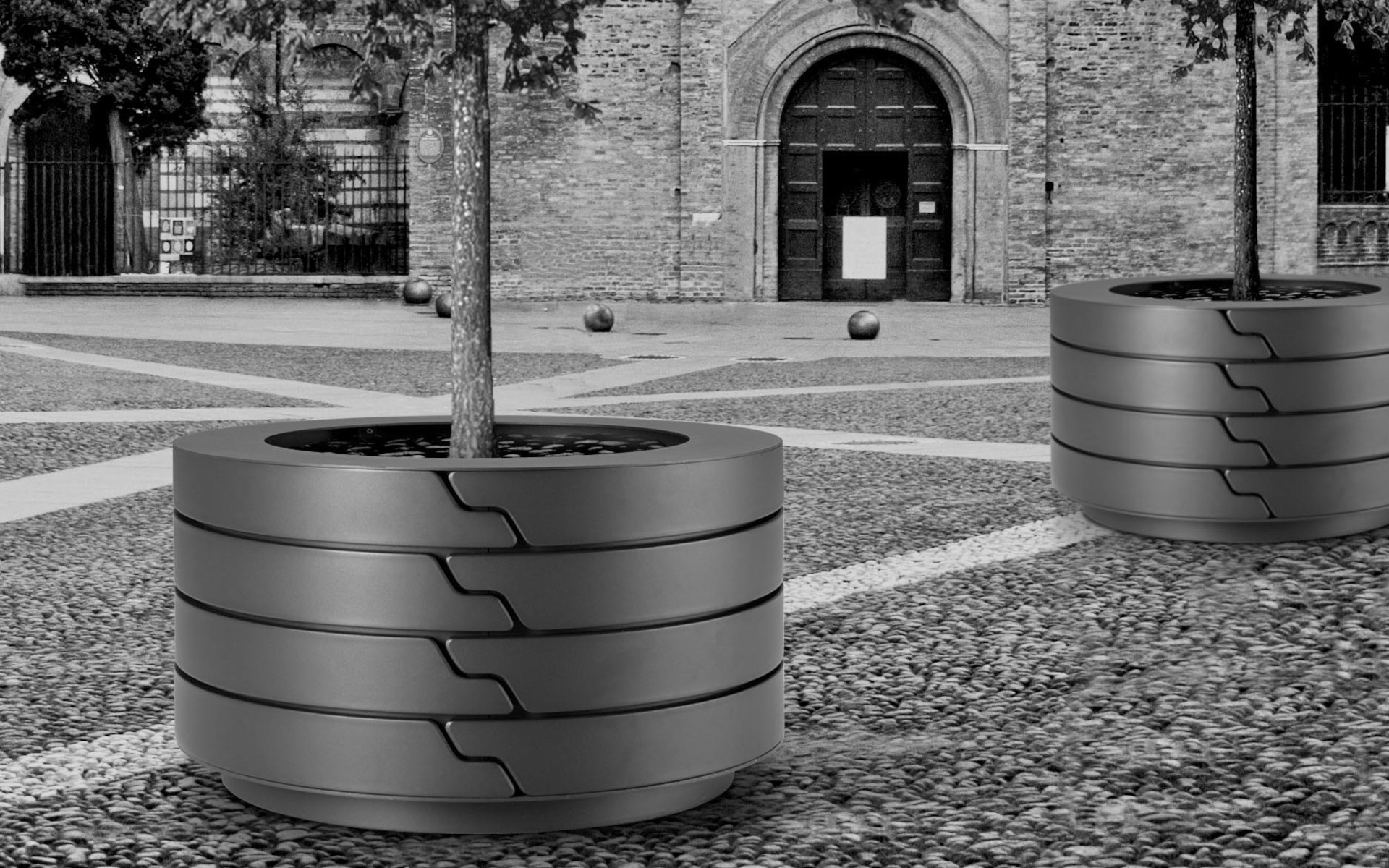 Circular planters featuring a supporting structure and a base that can be leveled in three points. The top ring, made of steel, is surrounded by a perimeter of cast aluminum elements, creating a ventilated gap. This design enhances the microclimate of the soil, promoting better plant growth and health.