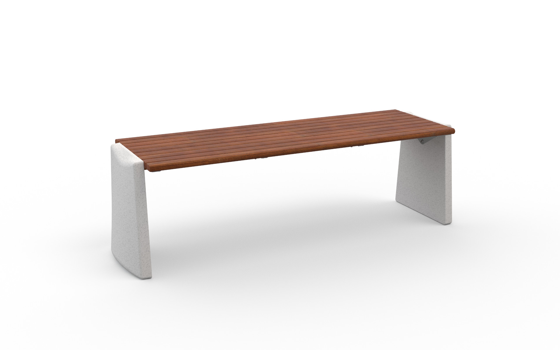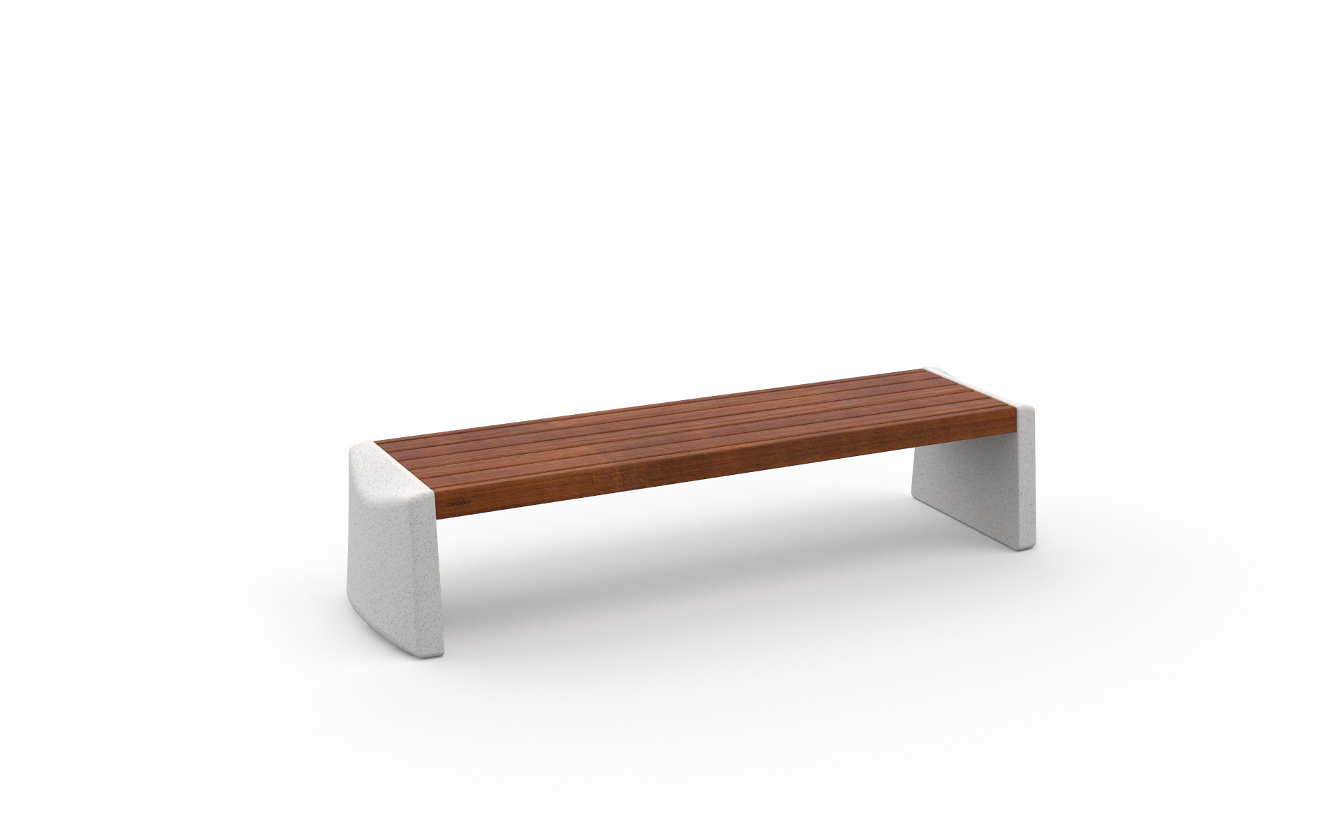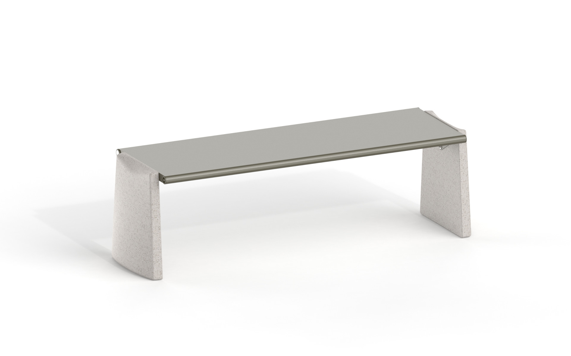 Collection of benches and tables composed of supports in PDM (Reconstituted Stone) with sandblasted granite or marble aggregates, combined with tops in painted steel sheet, hardwood, or thermo-treated pine.