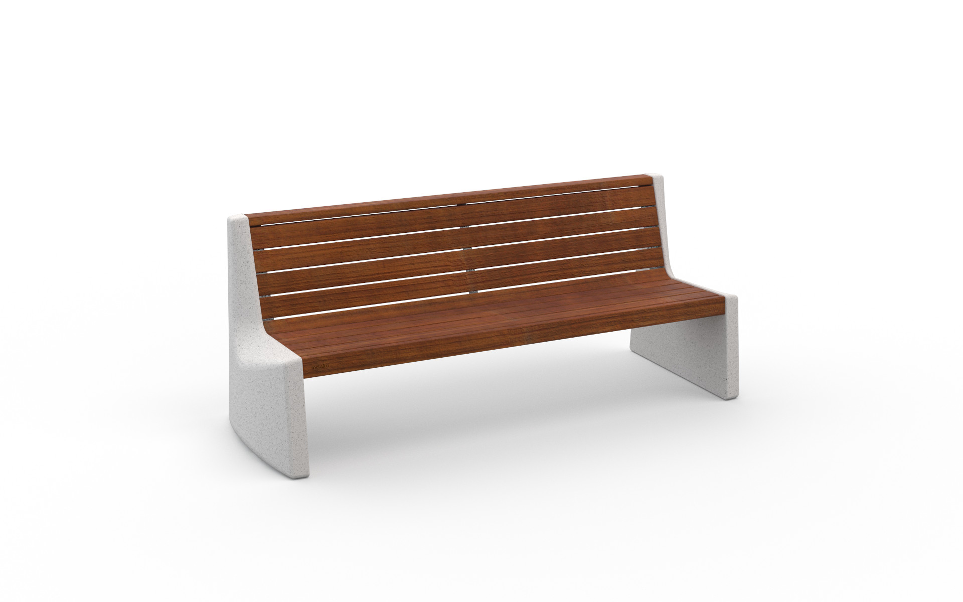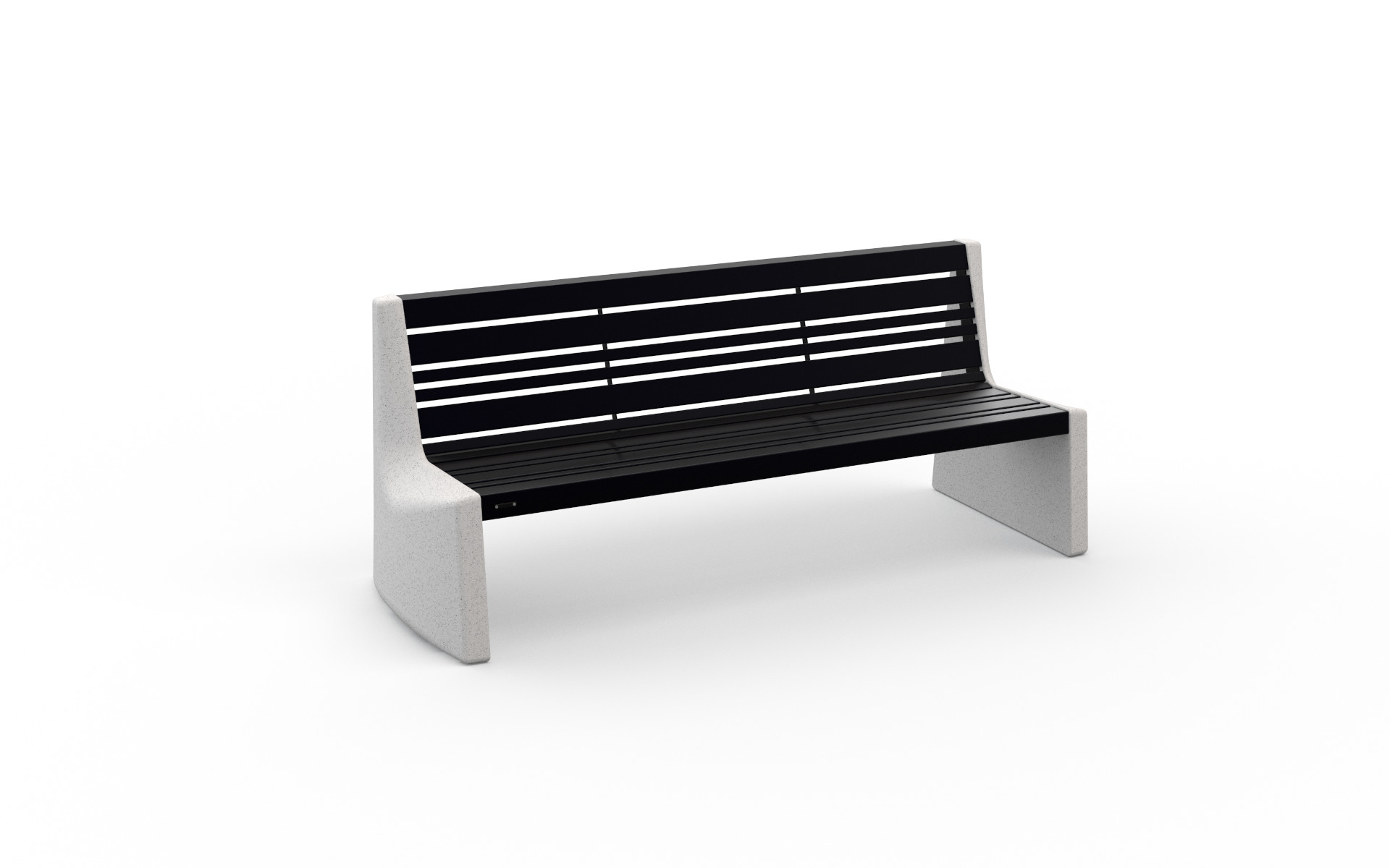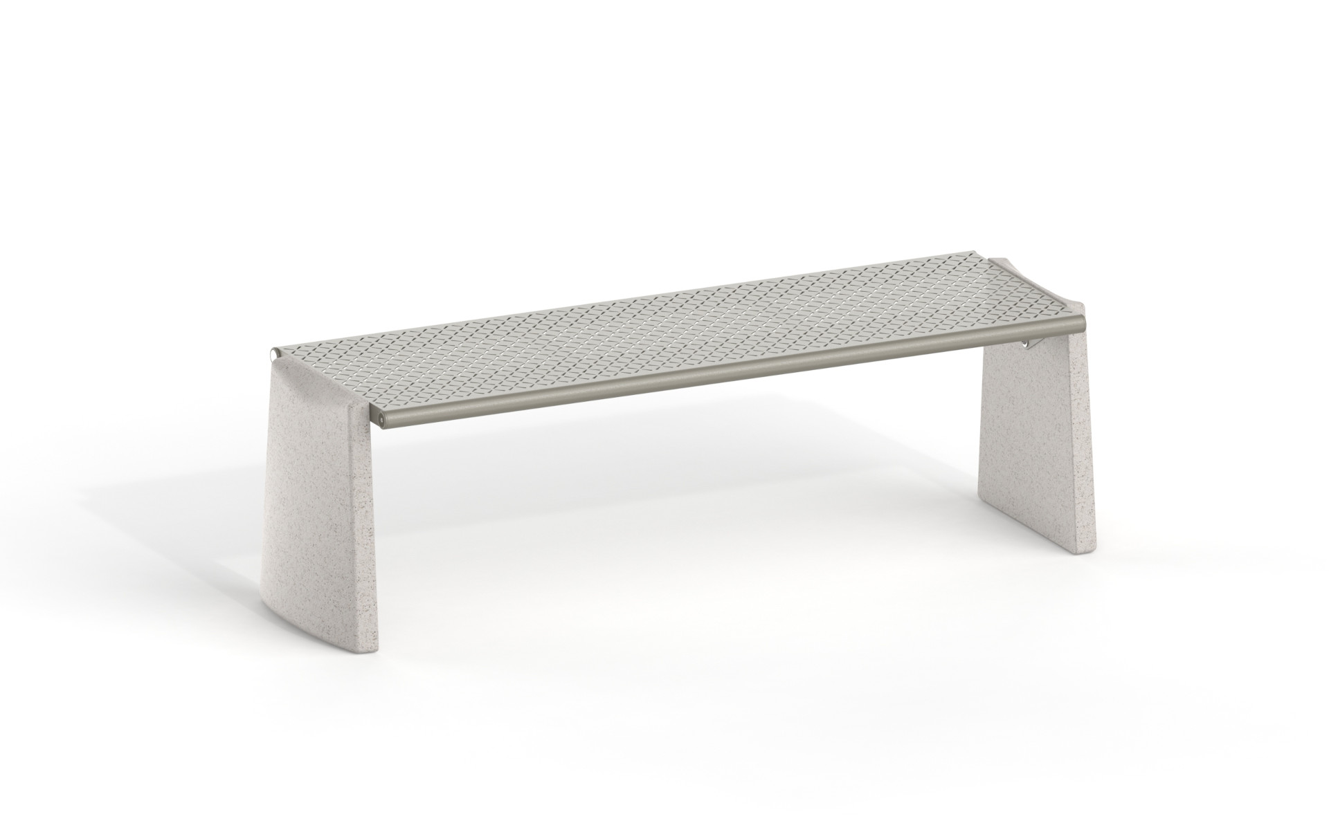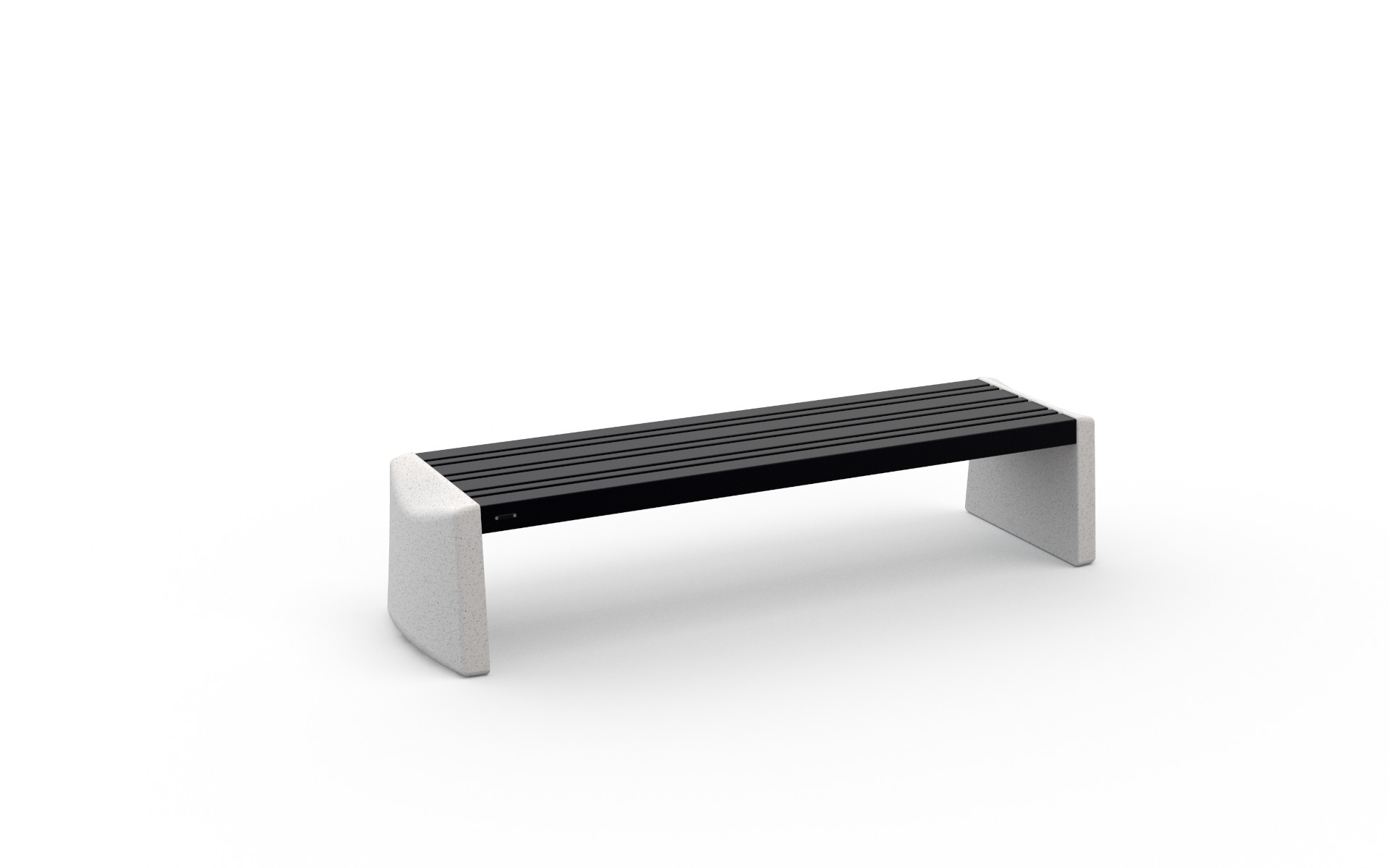 Collection of benches and tables composed of supports in PDM (Reconstituted Stone) with sandblasted granite or marble aggregates, combined with tops in painted steel sheet, hardwood, or thermo-treated pine.