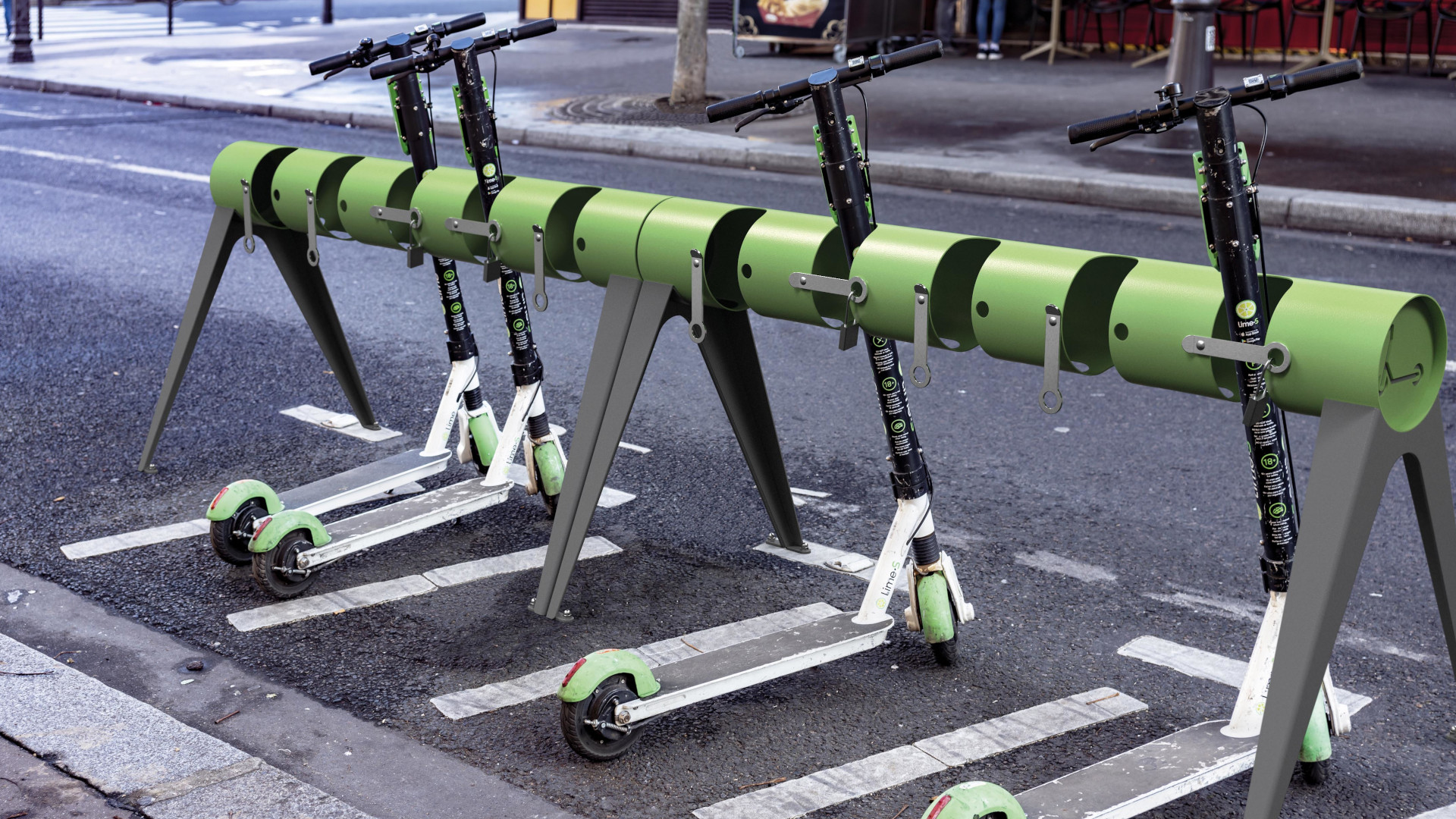 Functional and compact scooter rack featuring a circular painted steel element with specifically shaped recesses to ensure neat and secure parking. It includes a movable component in stainless steel flat bars that allows locking with a padlock or cable. Available with supports for either ground or wall mounting, it fits perfectly into urban or school environments.