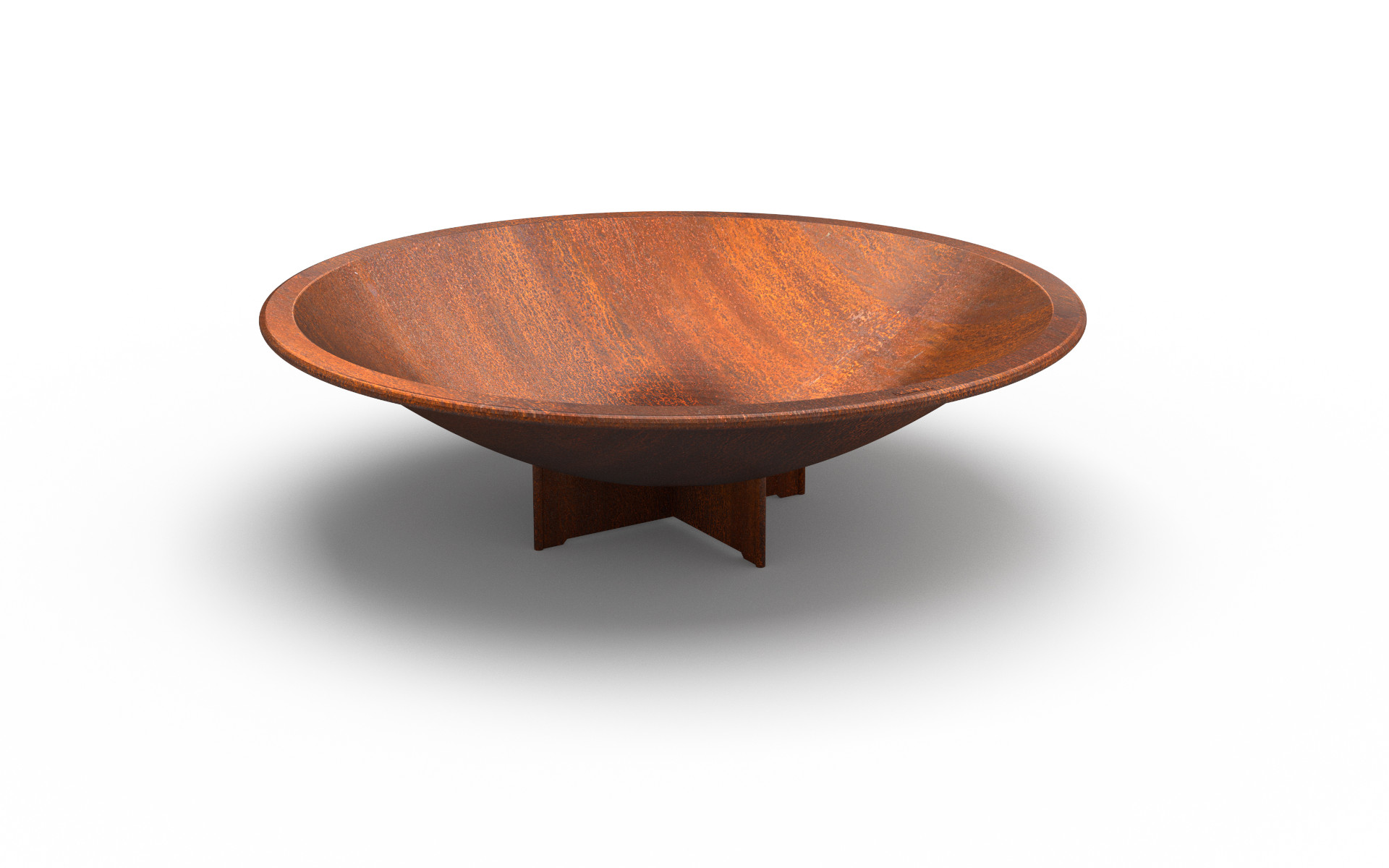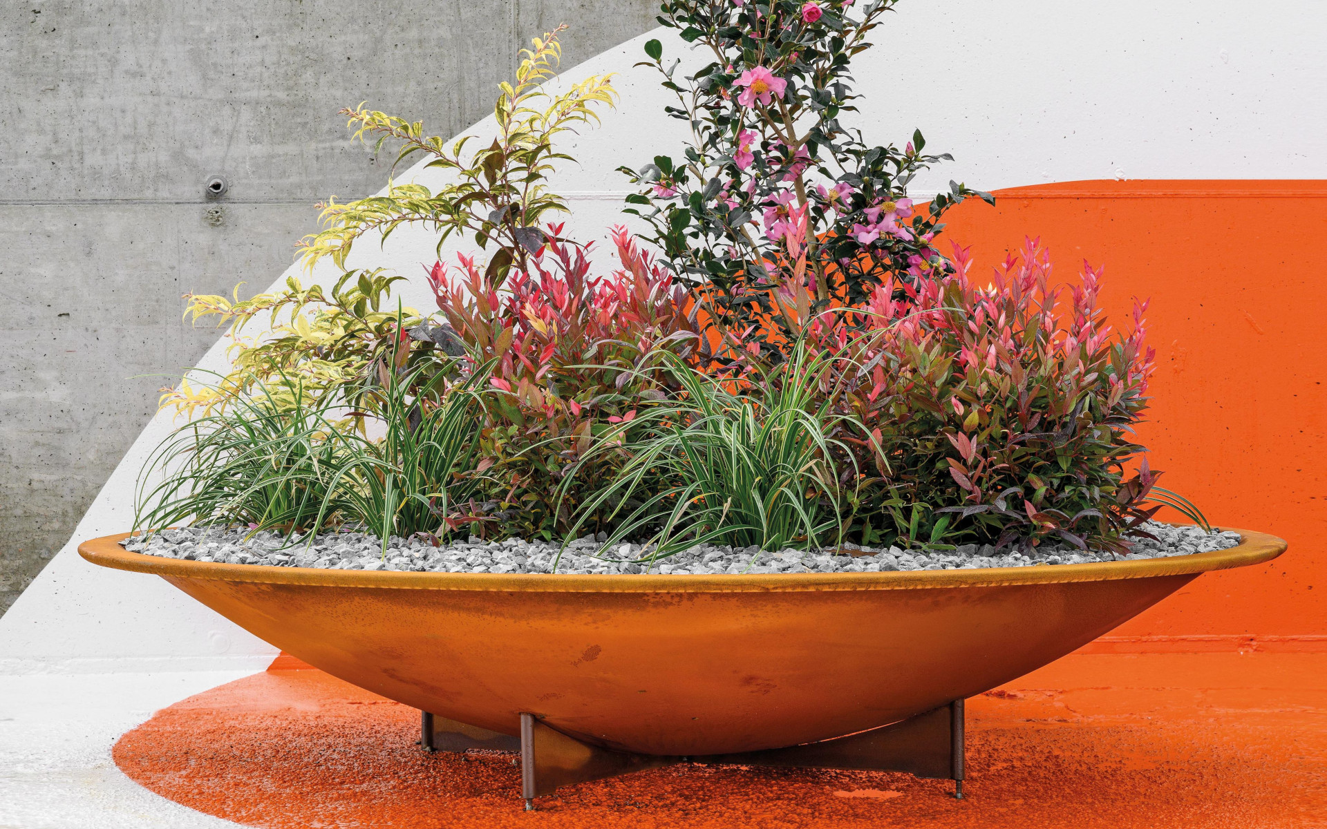 Collection of hemispherical planters made of Corten steel, featuring a robust and distinctive base with crossed central reinforcements. Each planter can be fitted with a versatile accessory (LW) in wood or WPC Plus mounted on a steel frame, designed to serve as a partial seating surface, combining aesthetics and functionality in a single urban element.