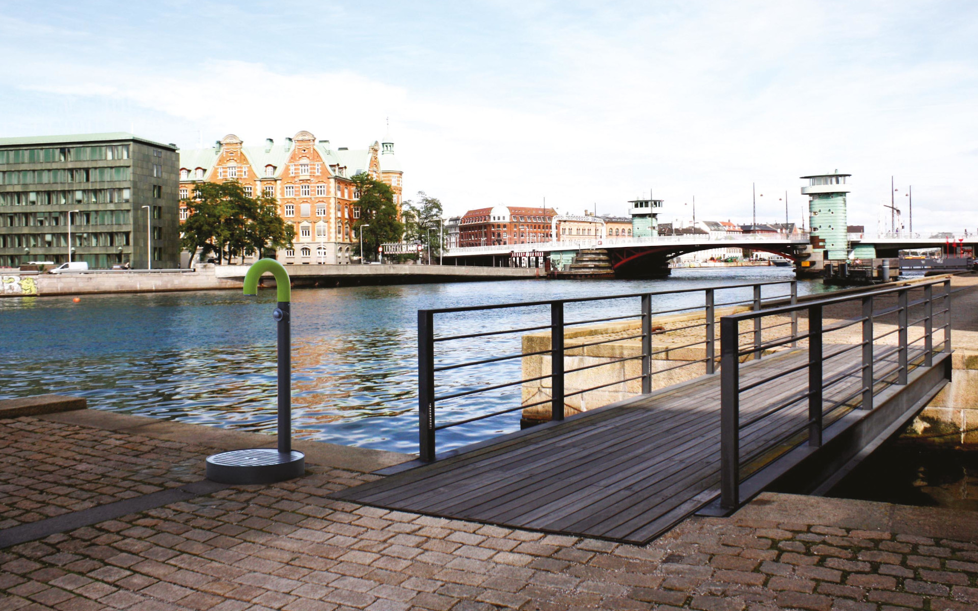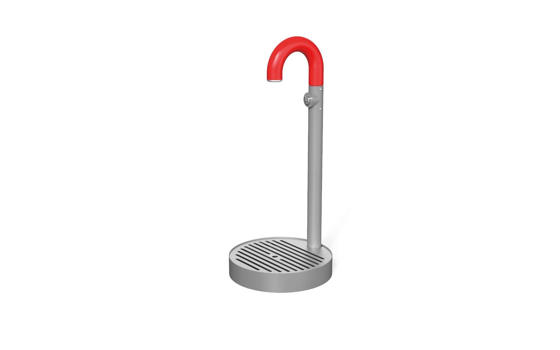 Urban fountain made with a tubular steel structure, equipped with a chrome-plated brass push-button tap with return spring. The circular steel basin features an overflow drainage system and a removable grate to allow easy cleaning and maintenance. A durable and functional element, designed for public spaces.