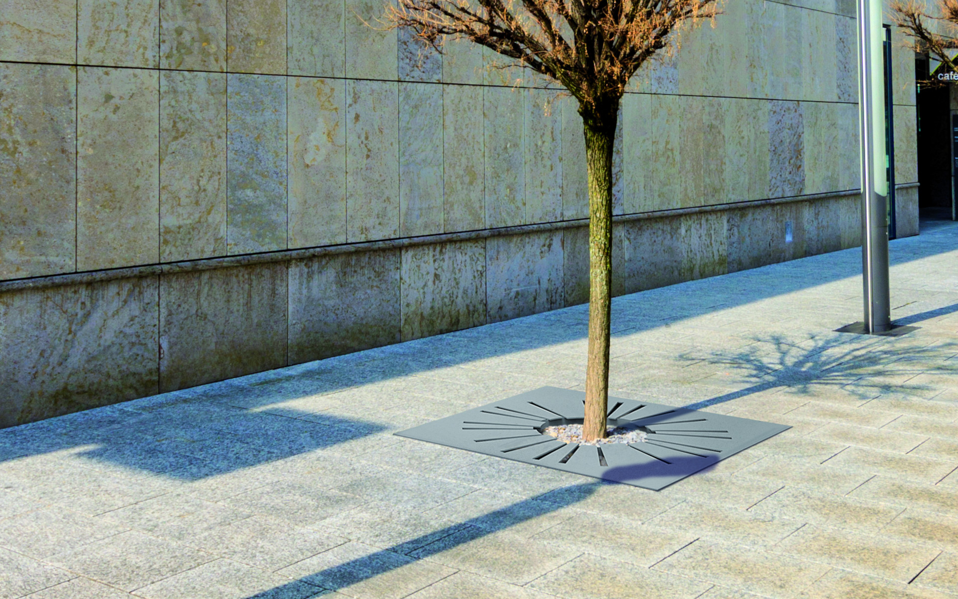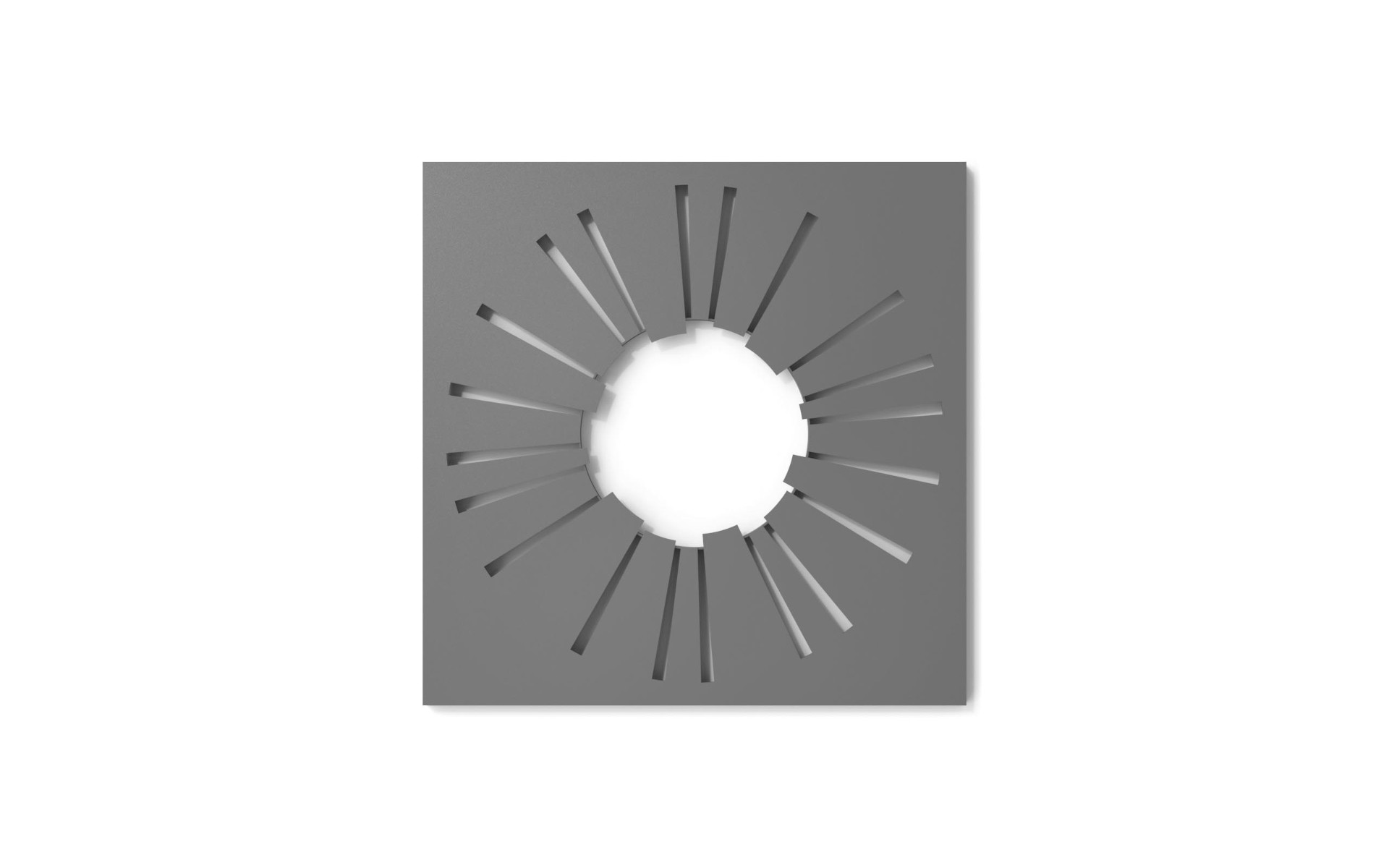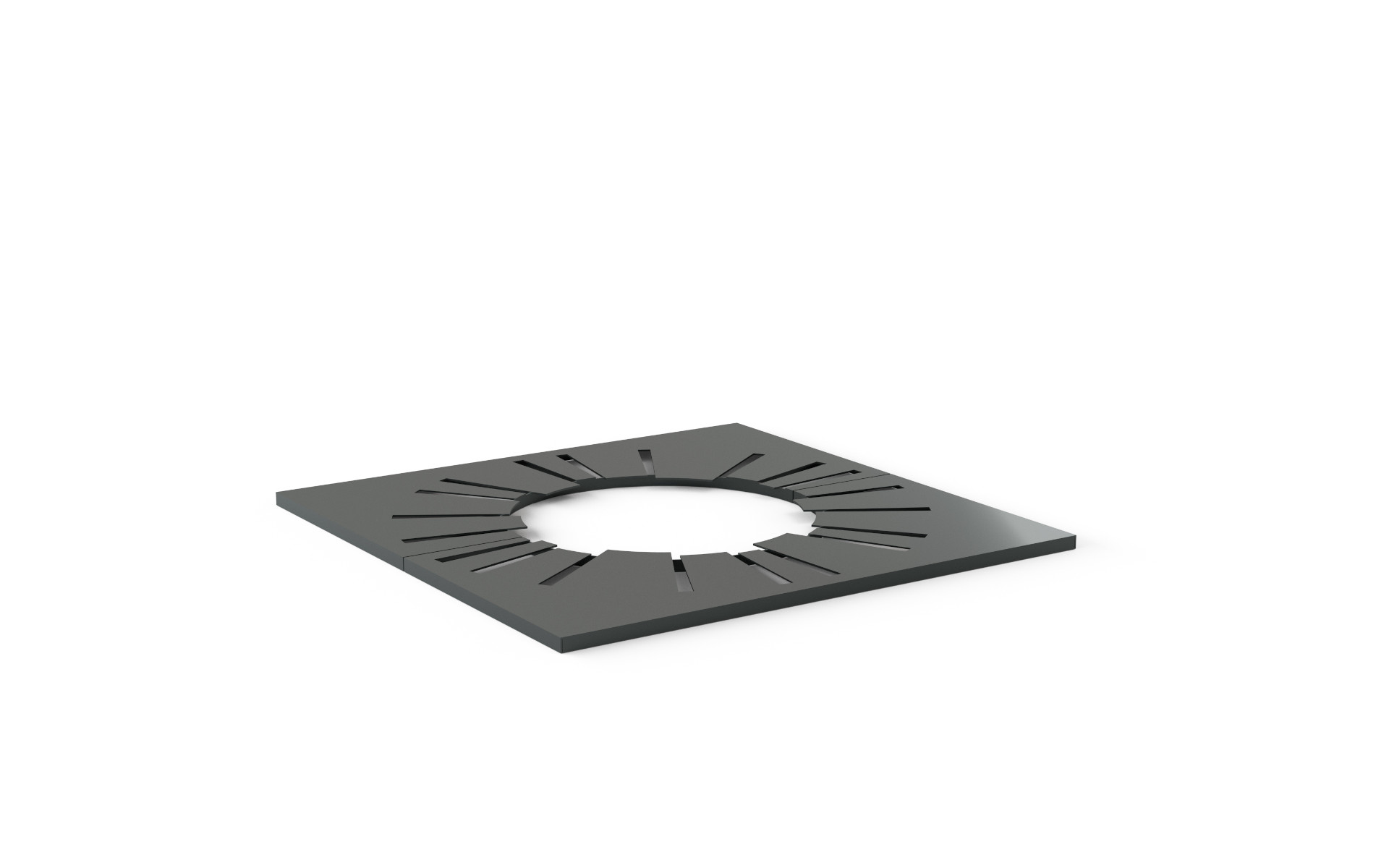 Square-shaped plant protector with a circular hole, made from laser-cut steel plate with geometric patterns. It consists of two halves, designed to be fixed together with screws, and reinforced internally and around the perimeter with steel plate. Available in various versions, with different sizes and/or hole diameters. Can be accessorized with a counterframe.