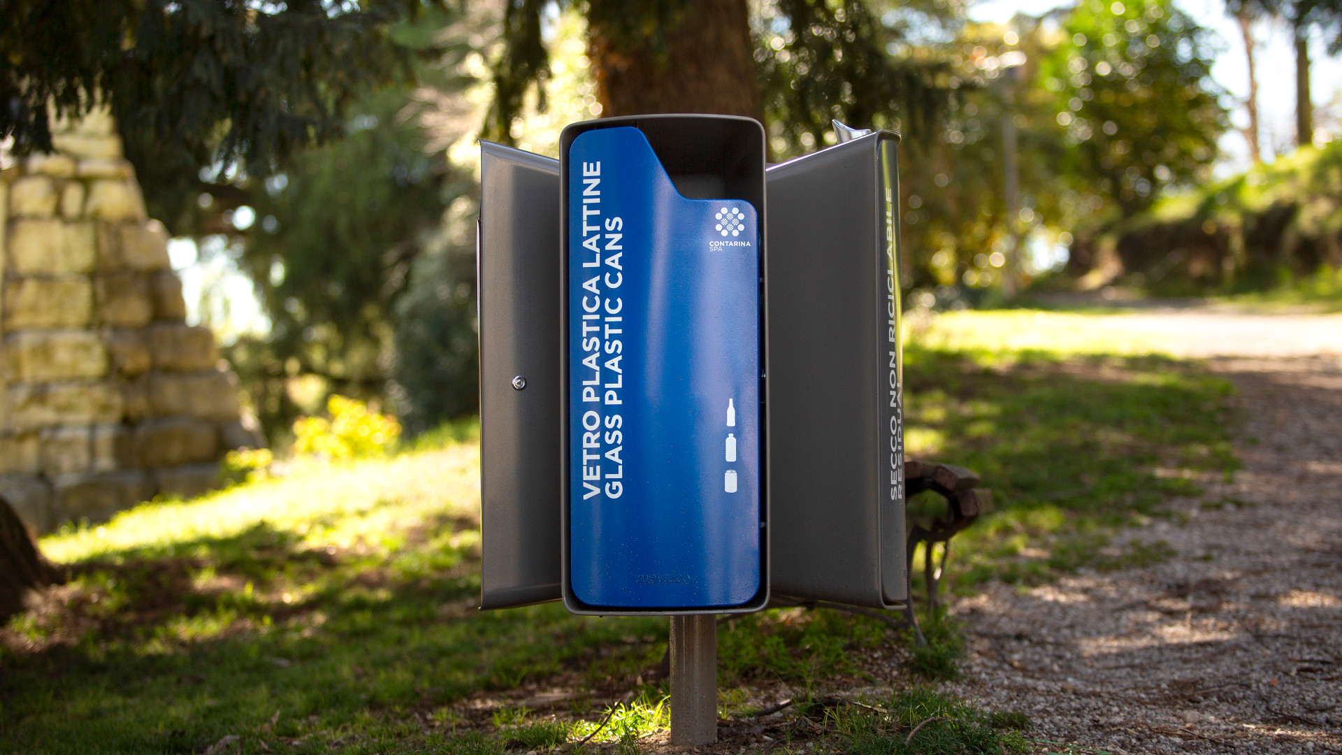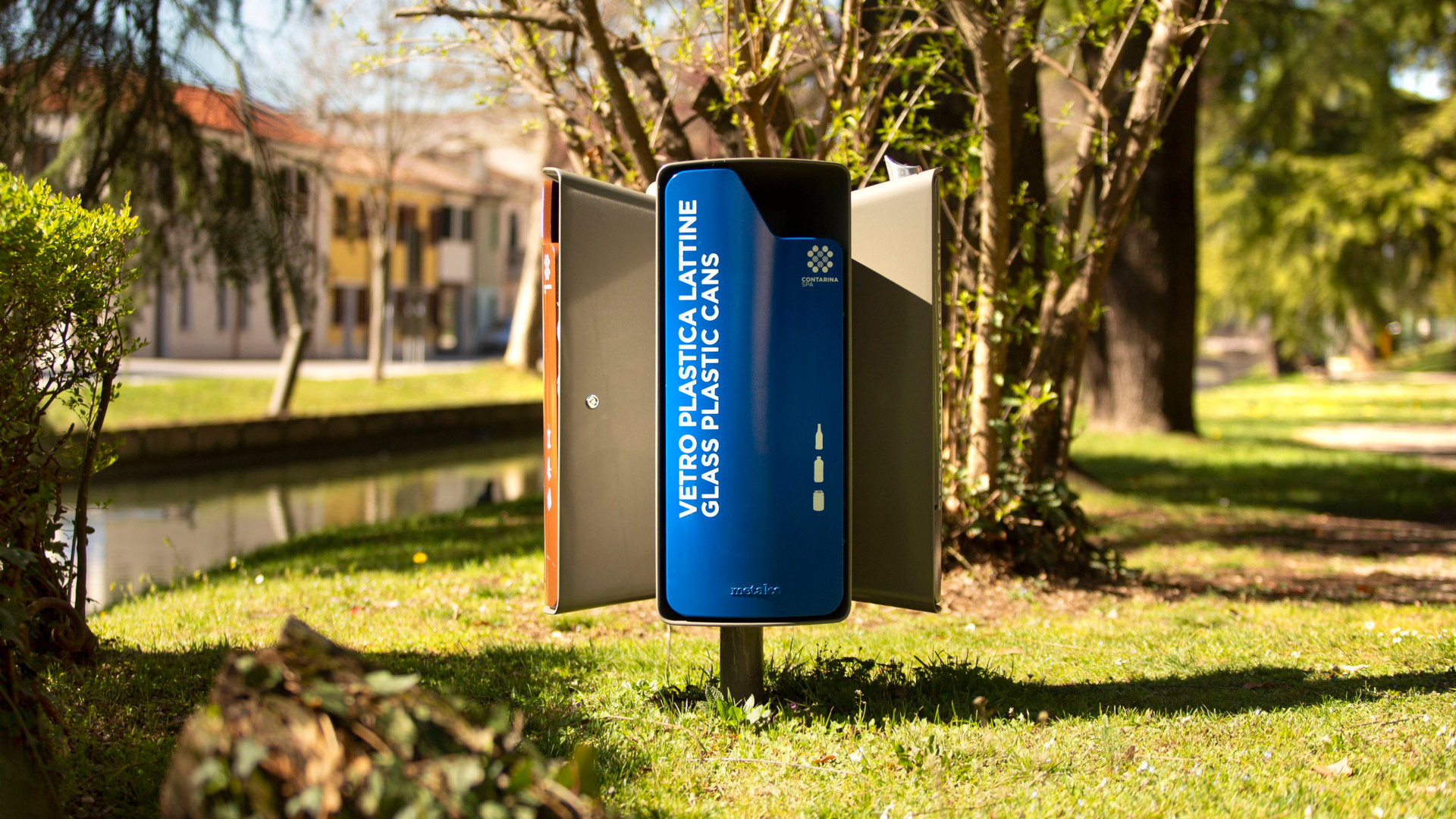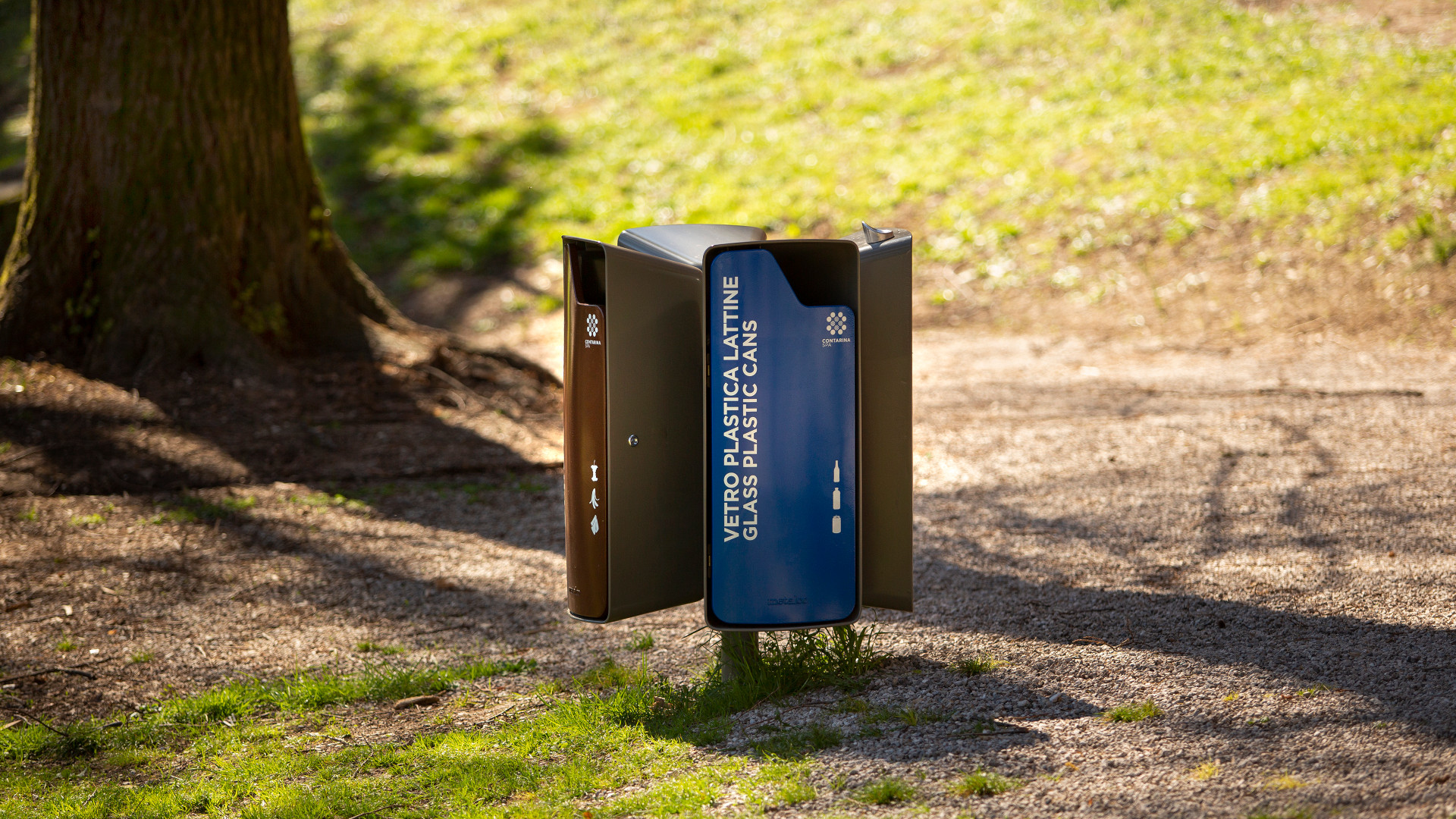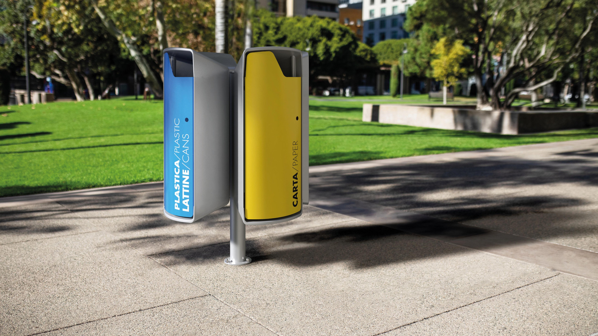 Collection of bins with an aluminum structure featuring a door, an opening for waste disposal, and a snap lock. Each bin includes a rain cover, available with or without an integrated cigarette disposal container. The structure also includes an elastic sack ring and a vertical support. Available in two versions: with one or four containers, ideal for creating recycling collection islands.