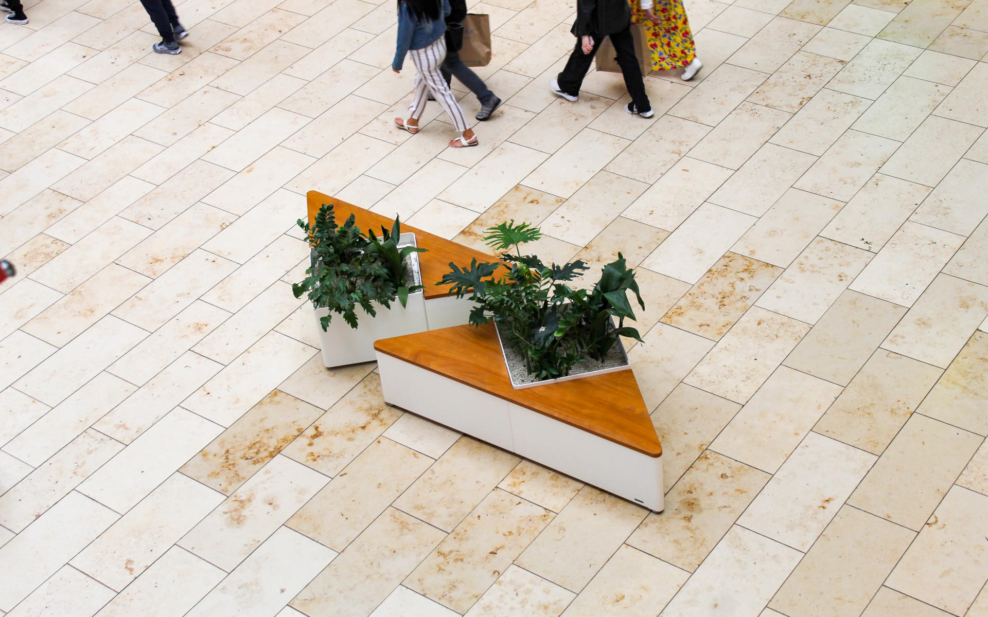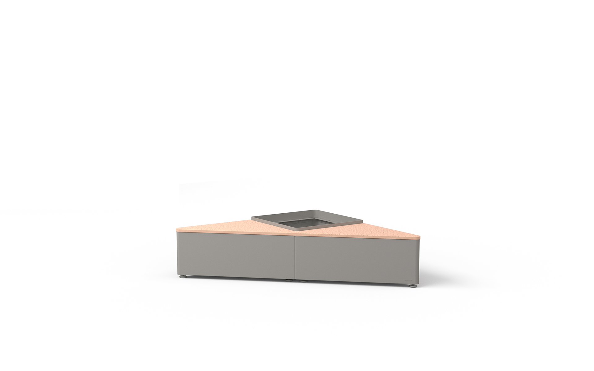 Modular system of planters made of steel, featuring an integrated seating system in Okumè plywood. The three available versions, two triangular and one square, differ in the planter dimensions.