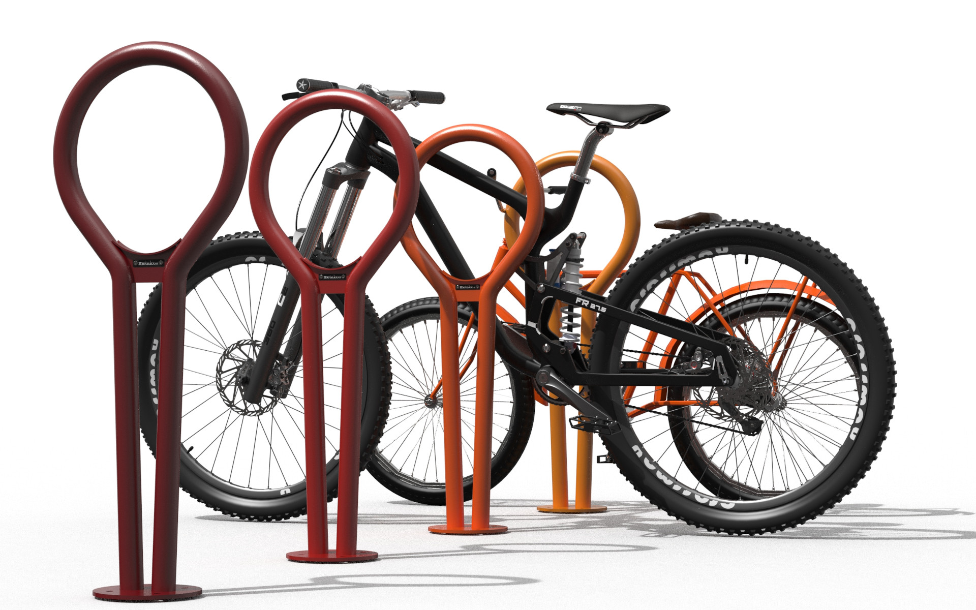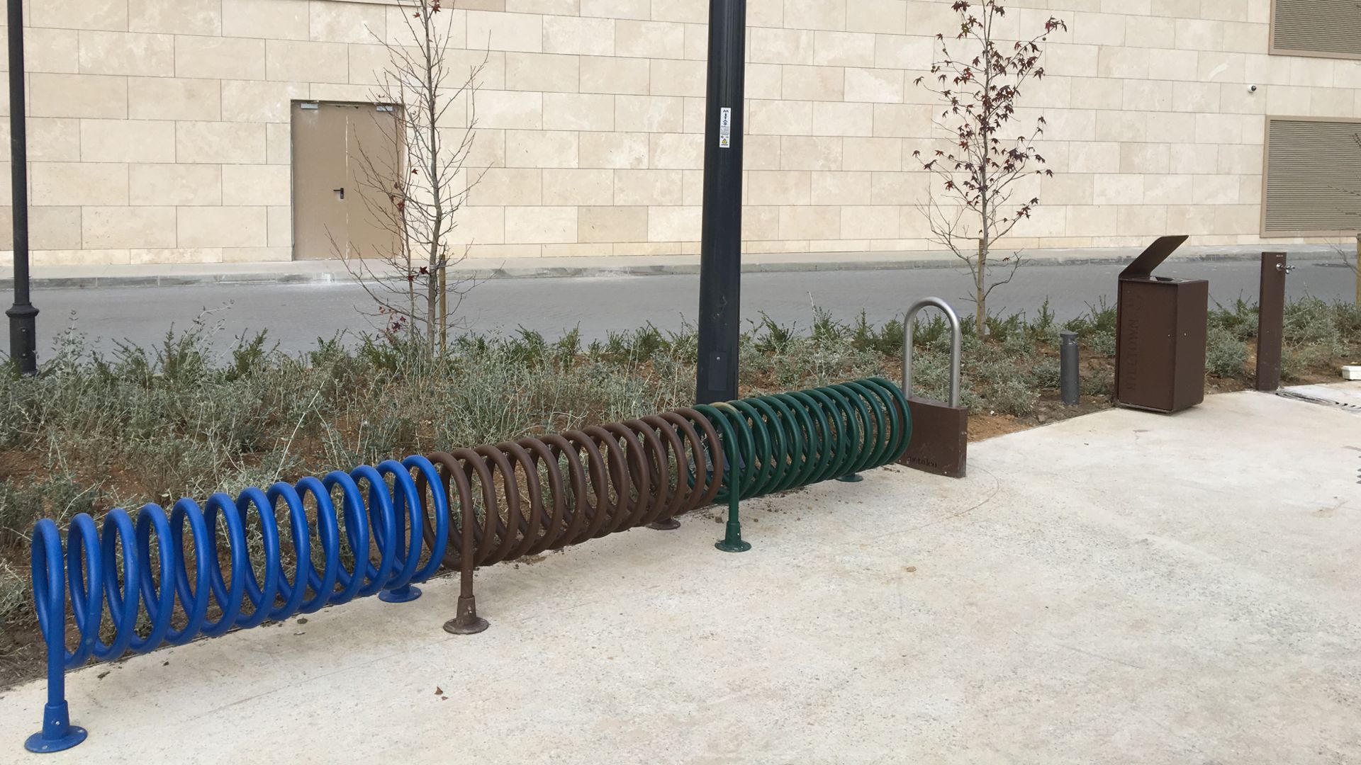 Bicycle rack in painted or stainless steel, consisting of a continuous spiral-shaped tubular structure supported by two cast aluminum bases, ensuring stability and ground fixing.