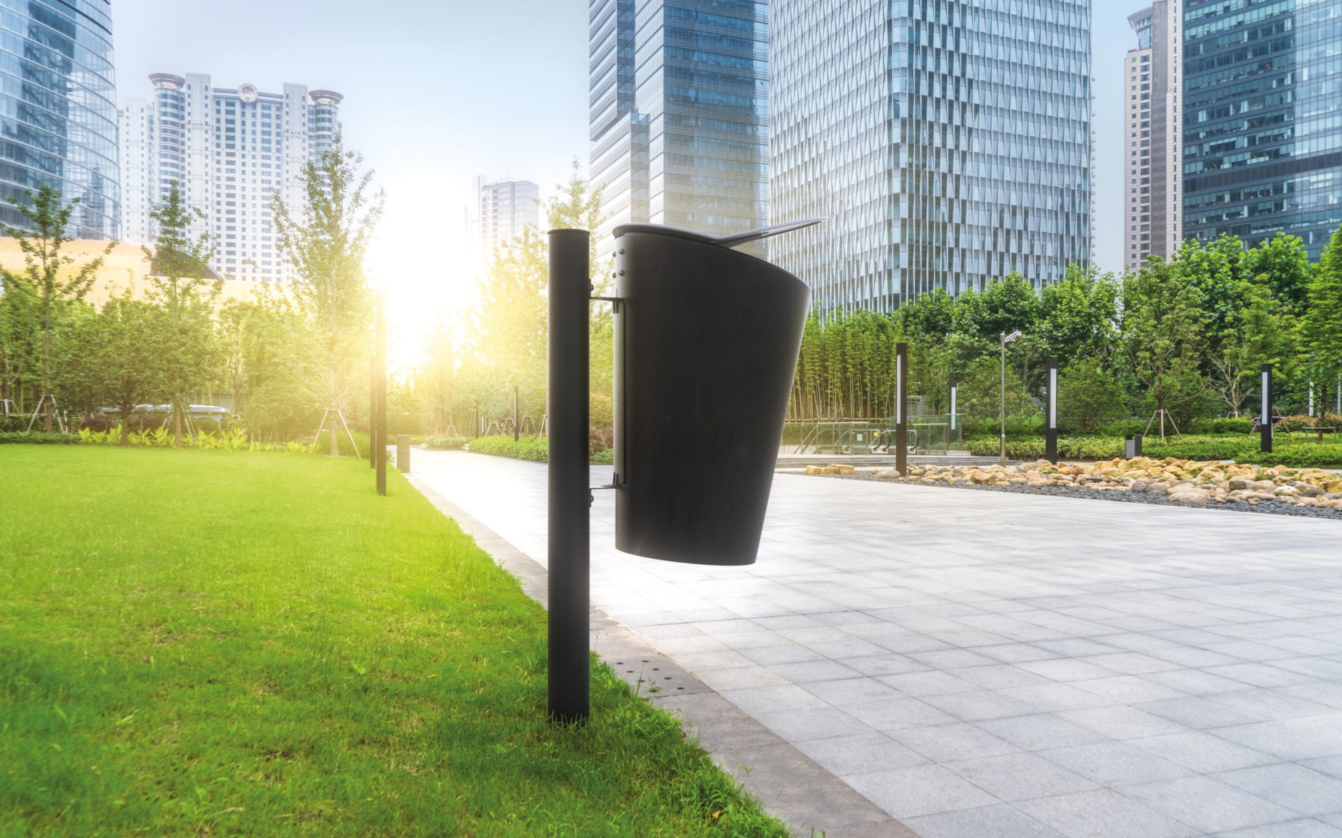 Collection of truncated-conical litter bins composed of a structure in powder coated steel equipped with bag holder ring with elastic and shaped cover, opening with snap lock. Three models are available: one equipped with bracket for wall fixing, one prepared for fixing on an existing pole, one equipped with pole.