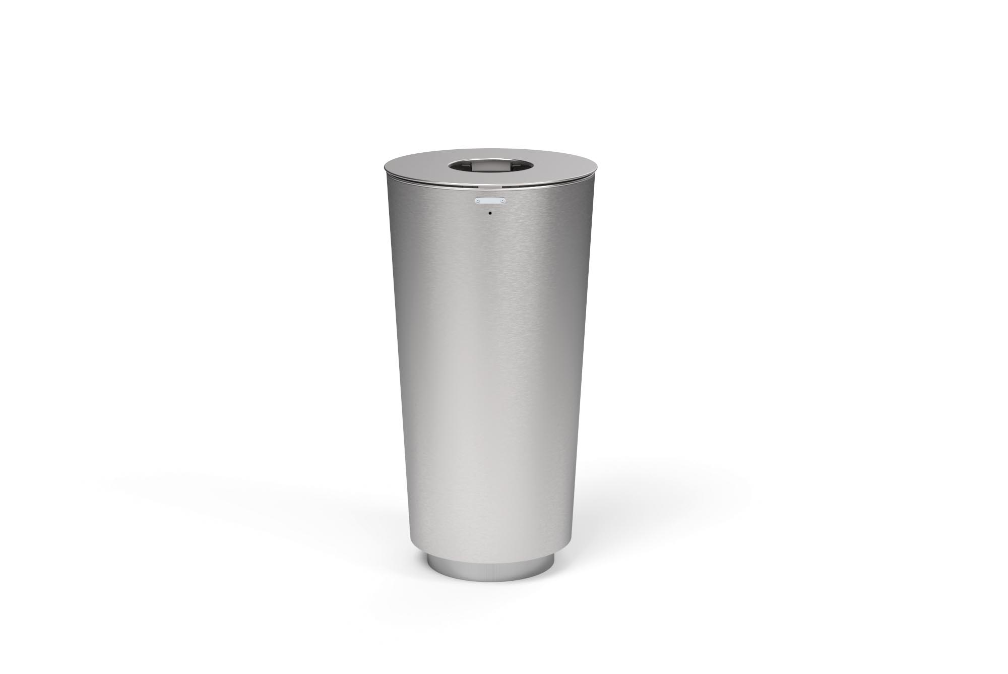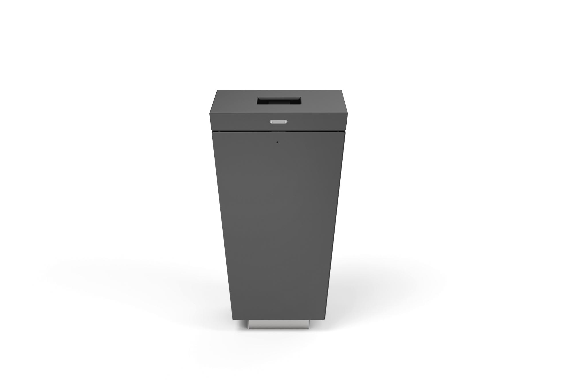 Collection of bins available in various shapes: cylindrical, elliptical, square, rectangular, truncated-conical, and truncated-pyramidal. The bins are equipped with a lid with a hole, which can be opened with a snap-lock, and a sack ring. They can be placed side by side to create recycling stations.