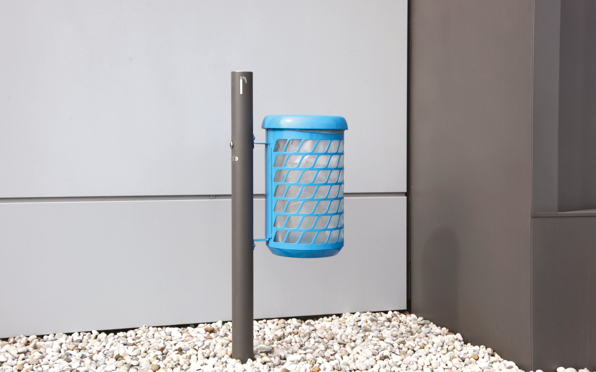 Cylindrical litter bin composed of a structure in laser perforated steel sheet and bag holder ring with snap closure. The litter bin is equipped with steel sheet pole, with cigarette extinguisher plate with integrated container, removable and equipped with lock.